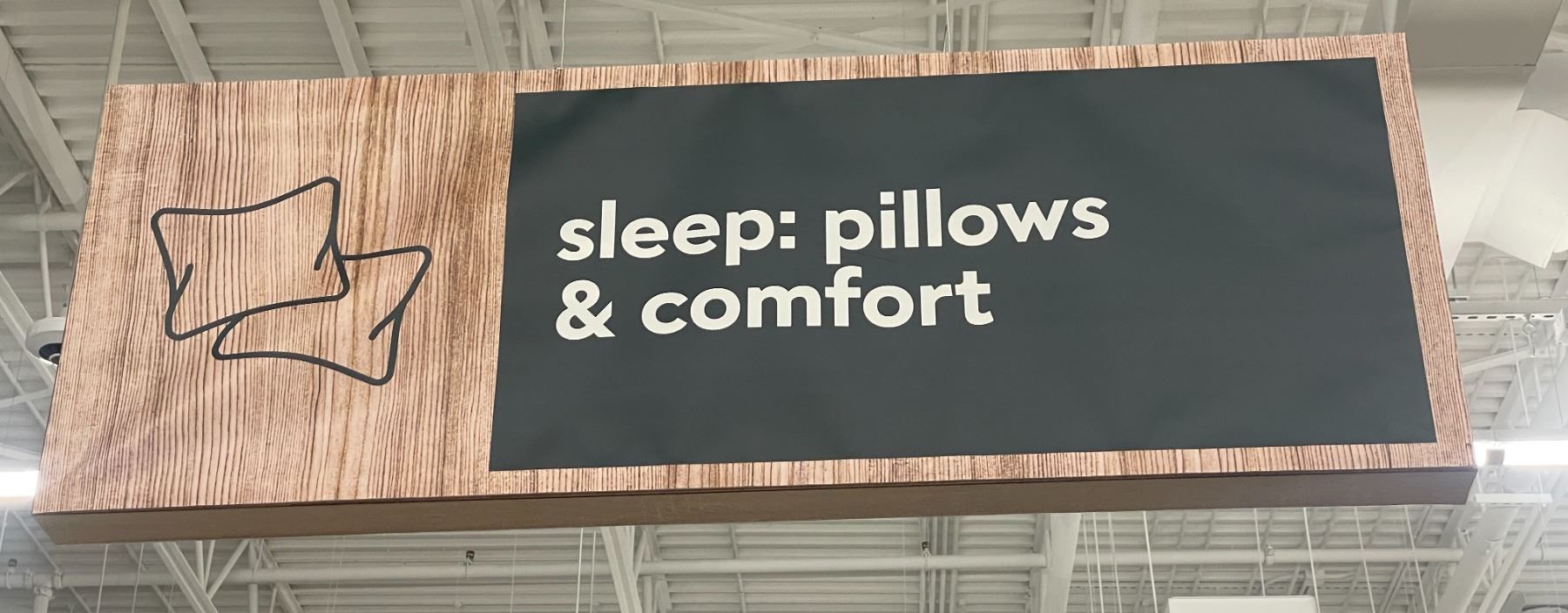 Sleep: pillows & comfort store sign (approx. 52in W 19in H 3in D) BIDDERS ARE RESPONSIBLE FOR ALL COSTS ASSOCIATED WITH PICKUP OF THEIR LOTS INCLUDING BUT NOT LIMITED TO RENTAL OF EQUIPMENT, FORKLIFTS, LABOUR, TRUCKING, TOOLS ETC.