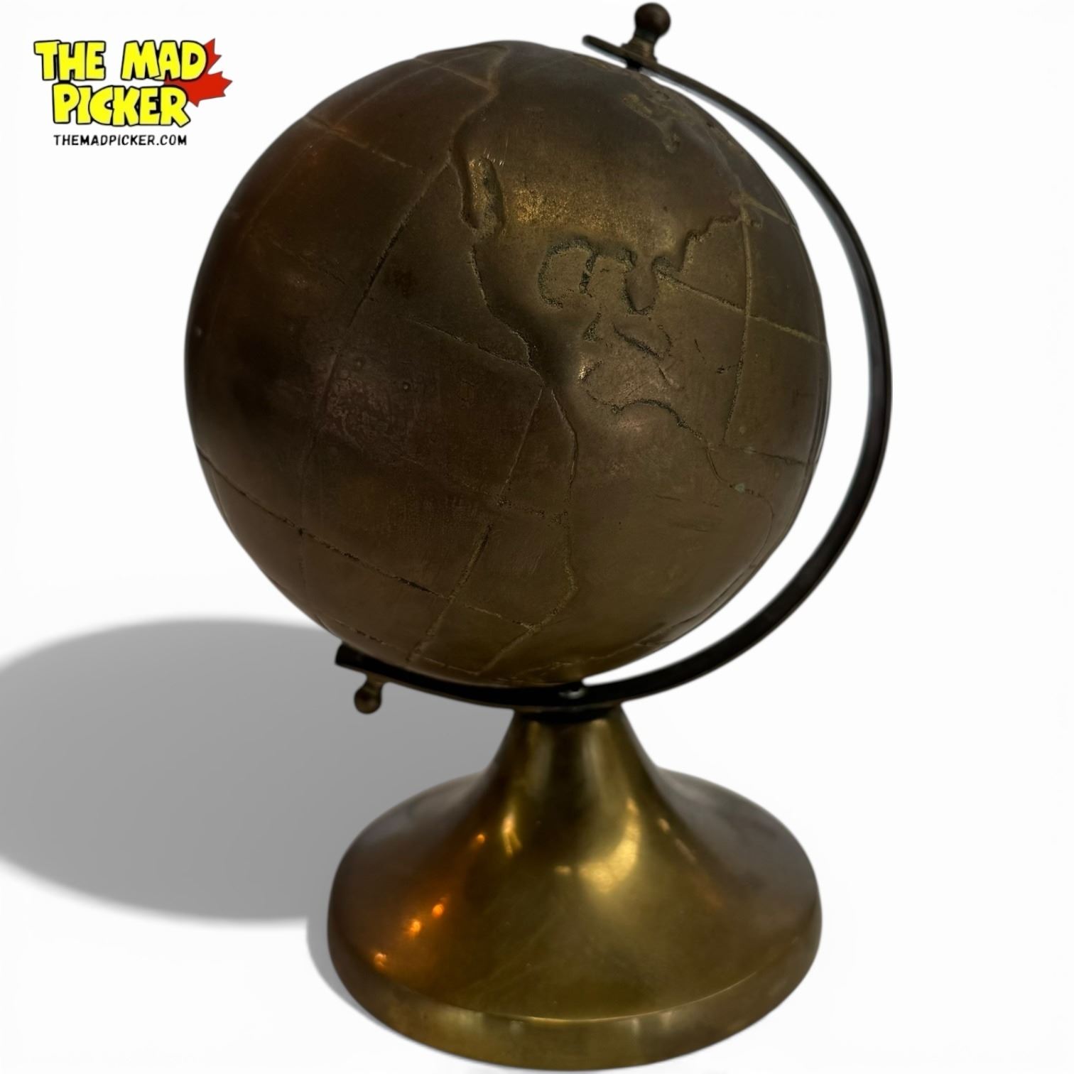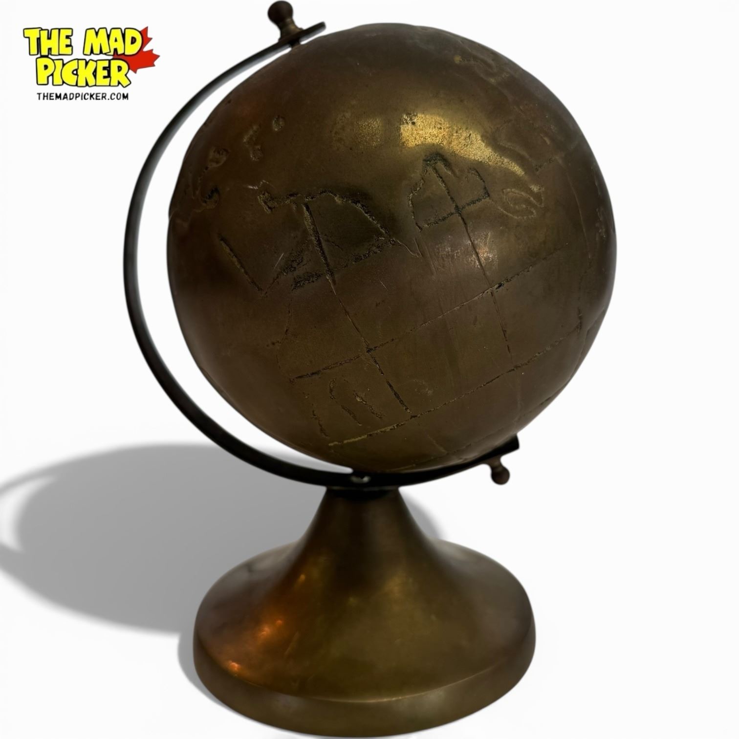 Small decorative globe crafted in bronze, measuring 7 inches in height. Features a sleek design with an axis-mounted rotating globe.