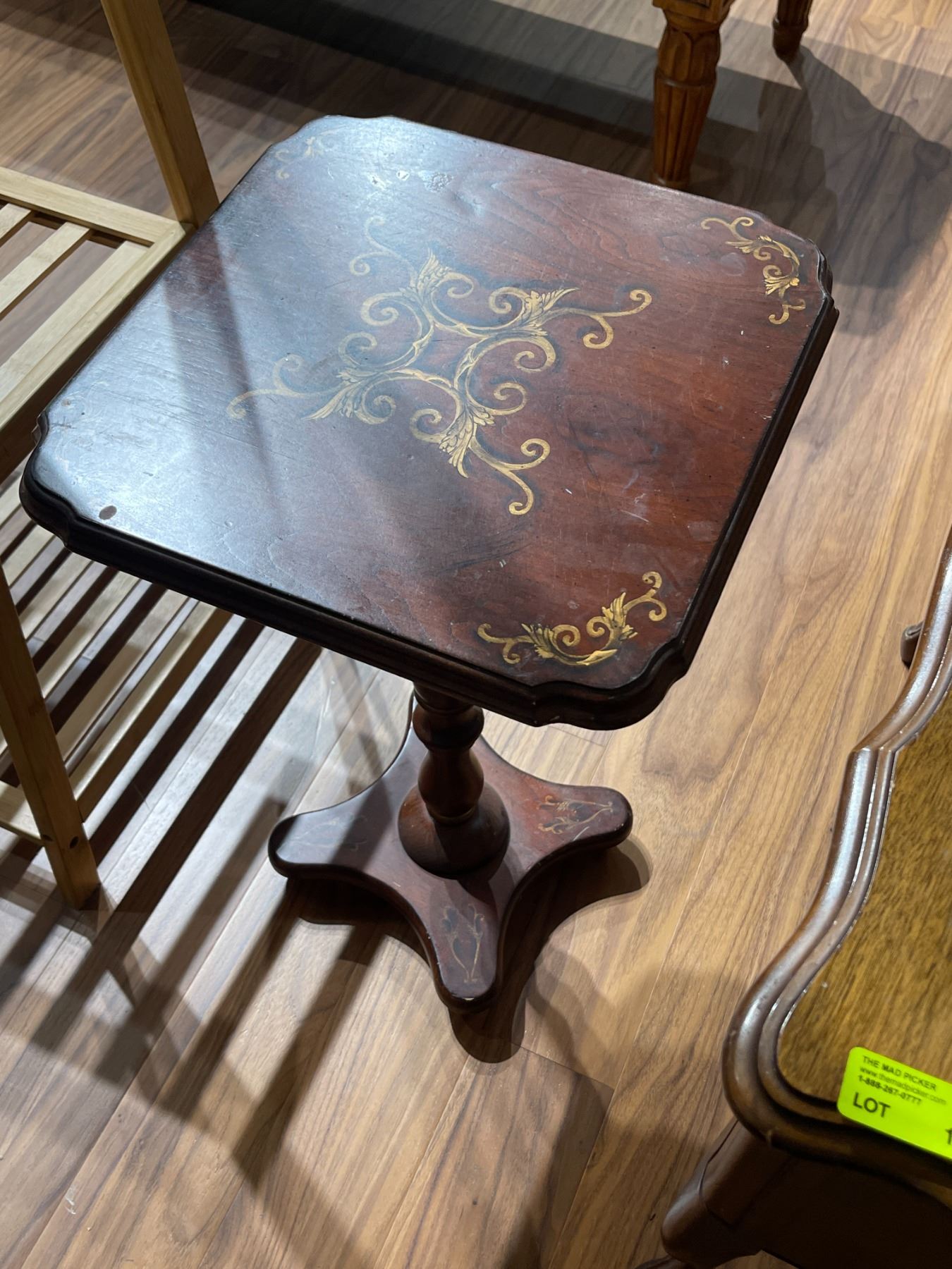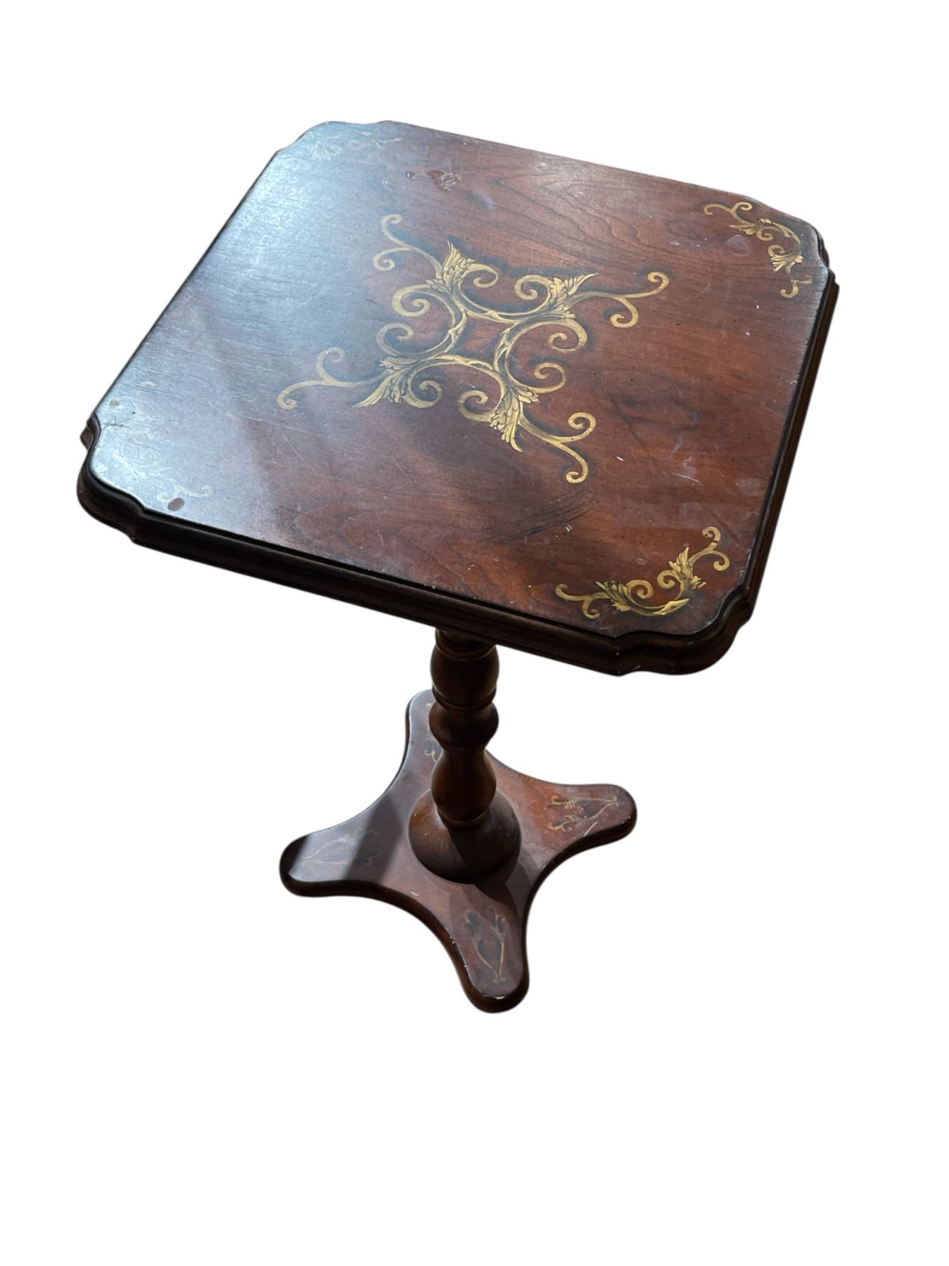 Small flip top wood pedestal table featuring folk art painted scroll designs. Dimensions: Length 14-Inch, Width 14-Inch, Height 23-Inch. Item is crafted from wood and showcases intricate painted scrollwork. Designed with a functional flip top for versatility. Item is as pictured.