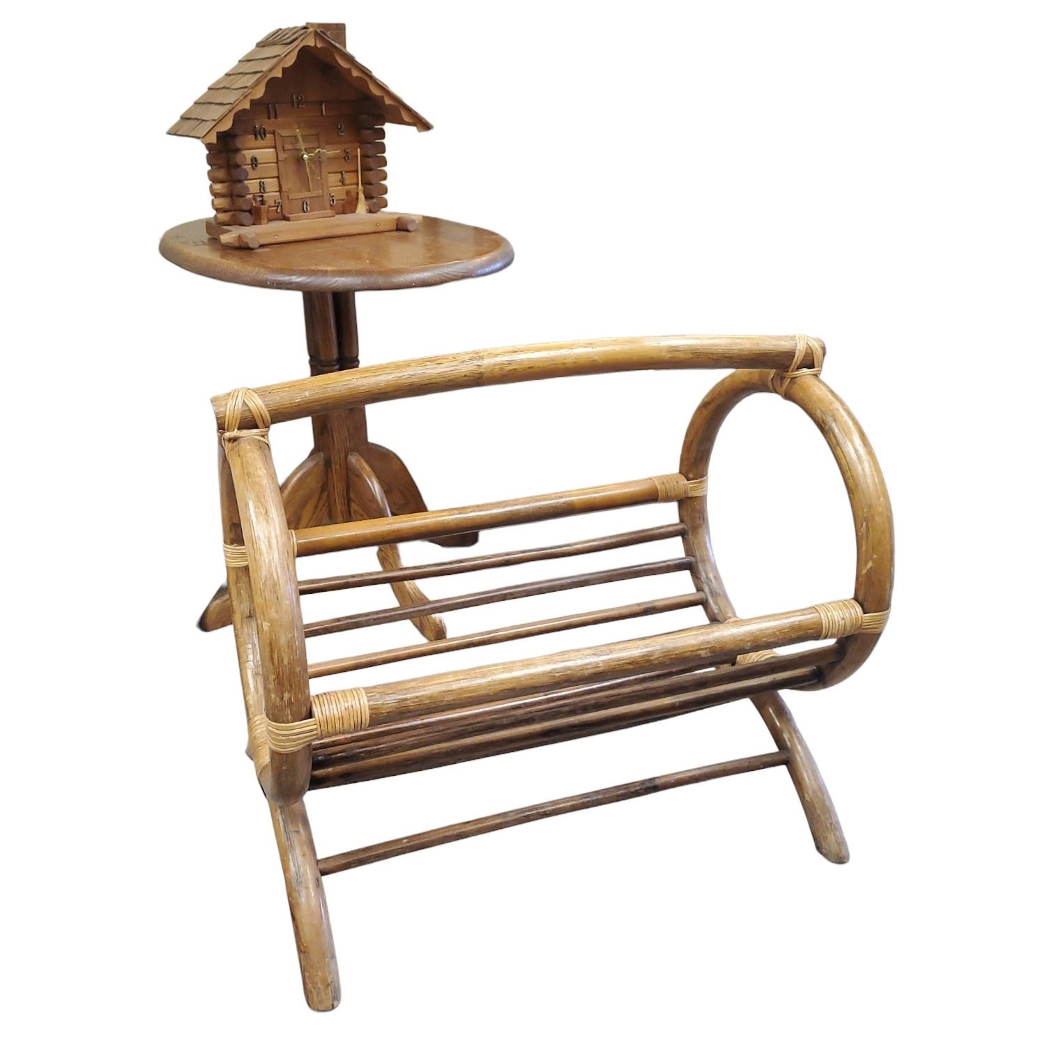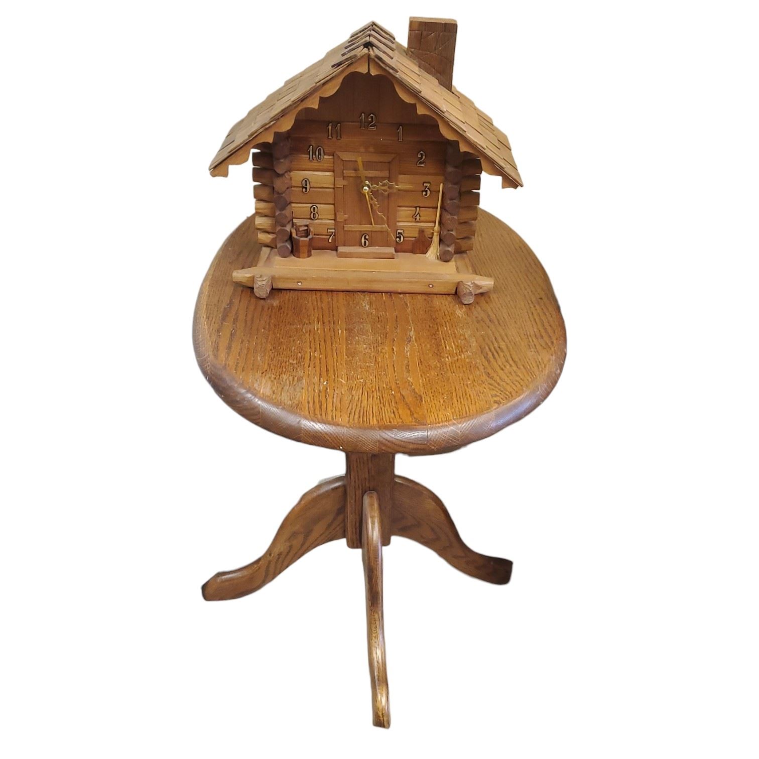 Lot includes a small oak pedestal table with woodgrain finish, a rattan cradle style basket suitable for blankets or magazines, and a log cabin style clock with decorative detailing. Items are as pictured.