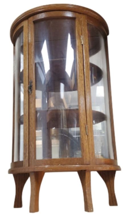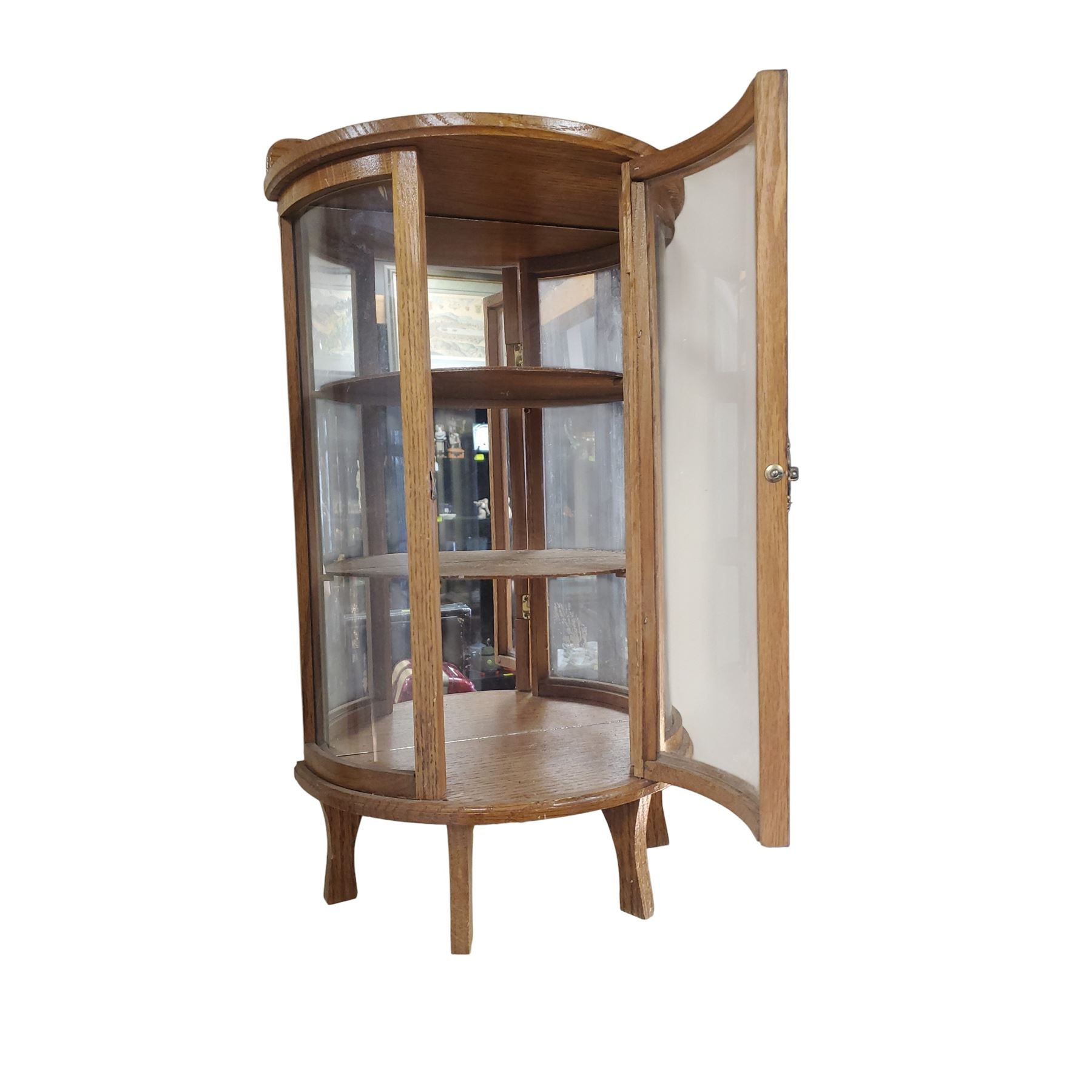Small vintage curio cabinet crafted from oak featuring a bow front design. The cabinet measures 22x12-Inch and is designed for display purposes. Item is as pictured.
