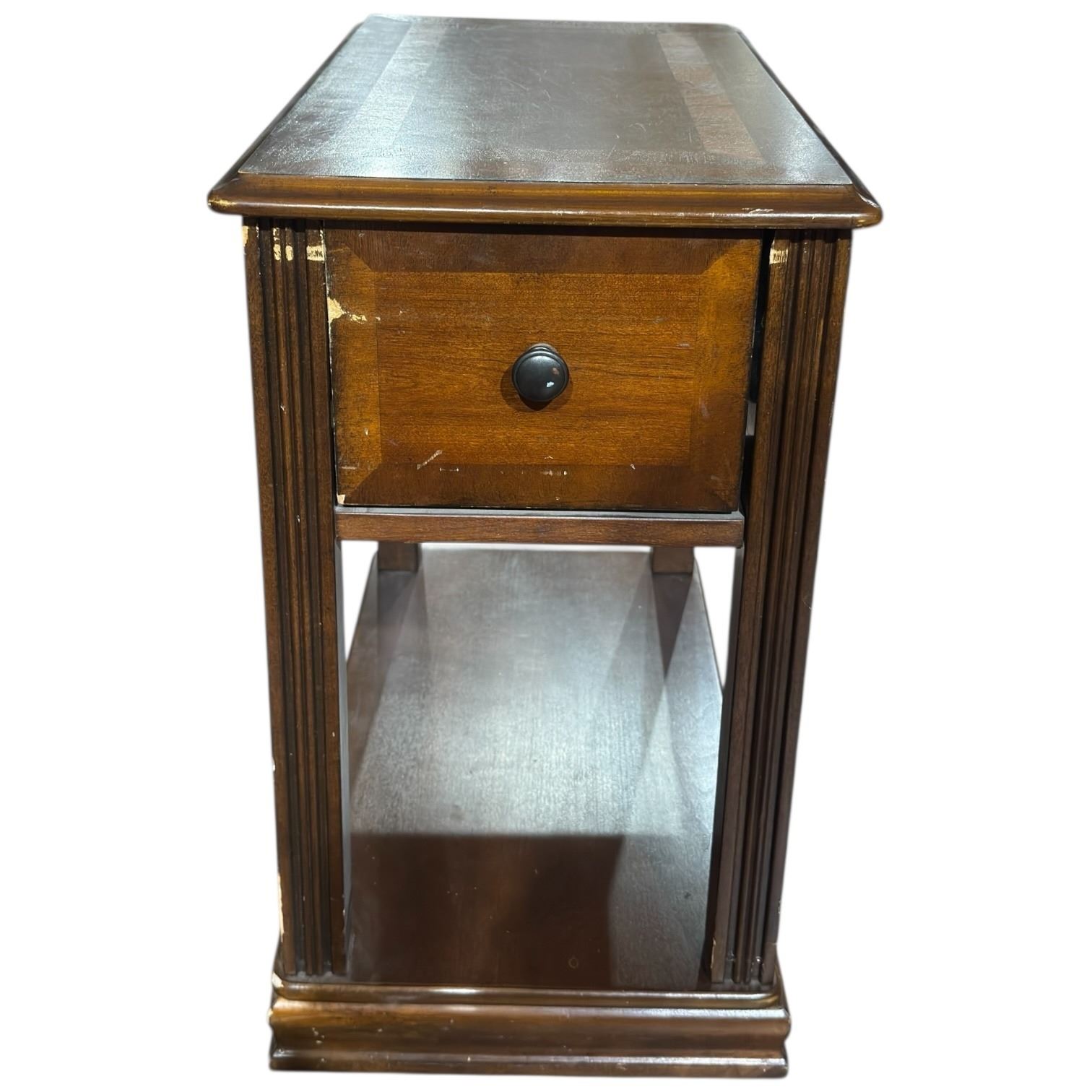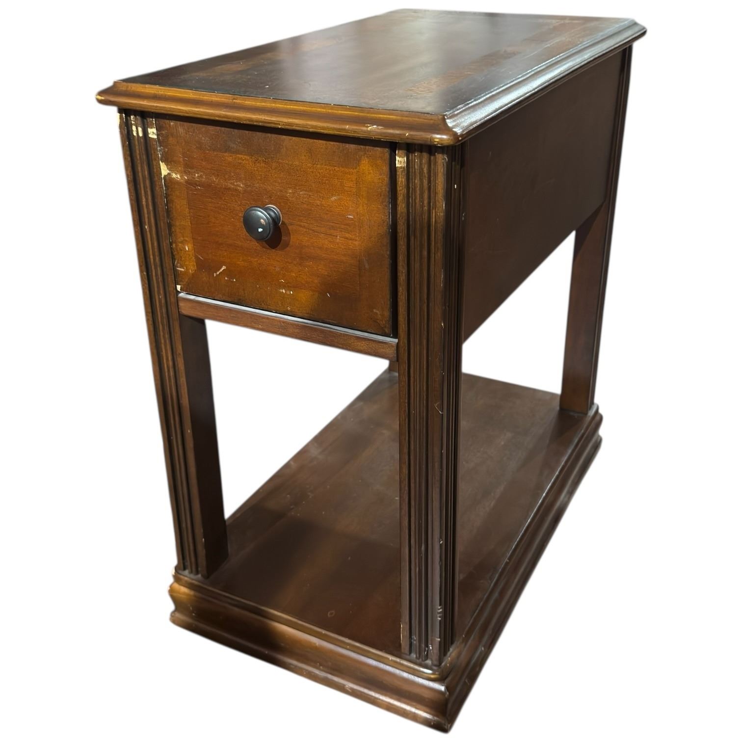 Small wood chairside table featuring an inlaid top design. Dimensions are Length: 22 In, Width: 13 In, Height: 23 In. Ideal for use in living spaces as an accent table or functional furniture piece. Item is as pictured.