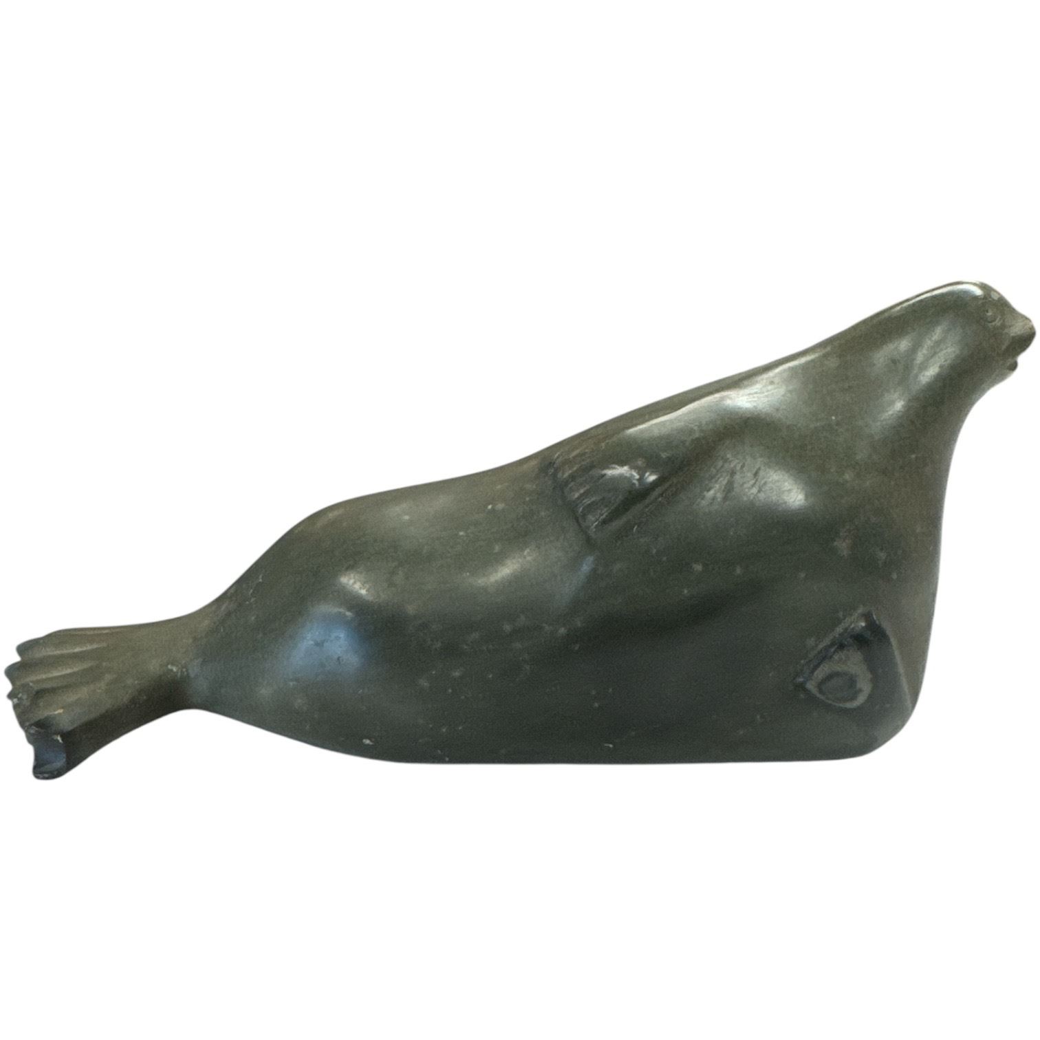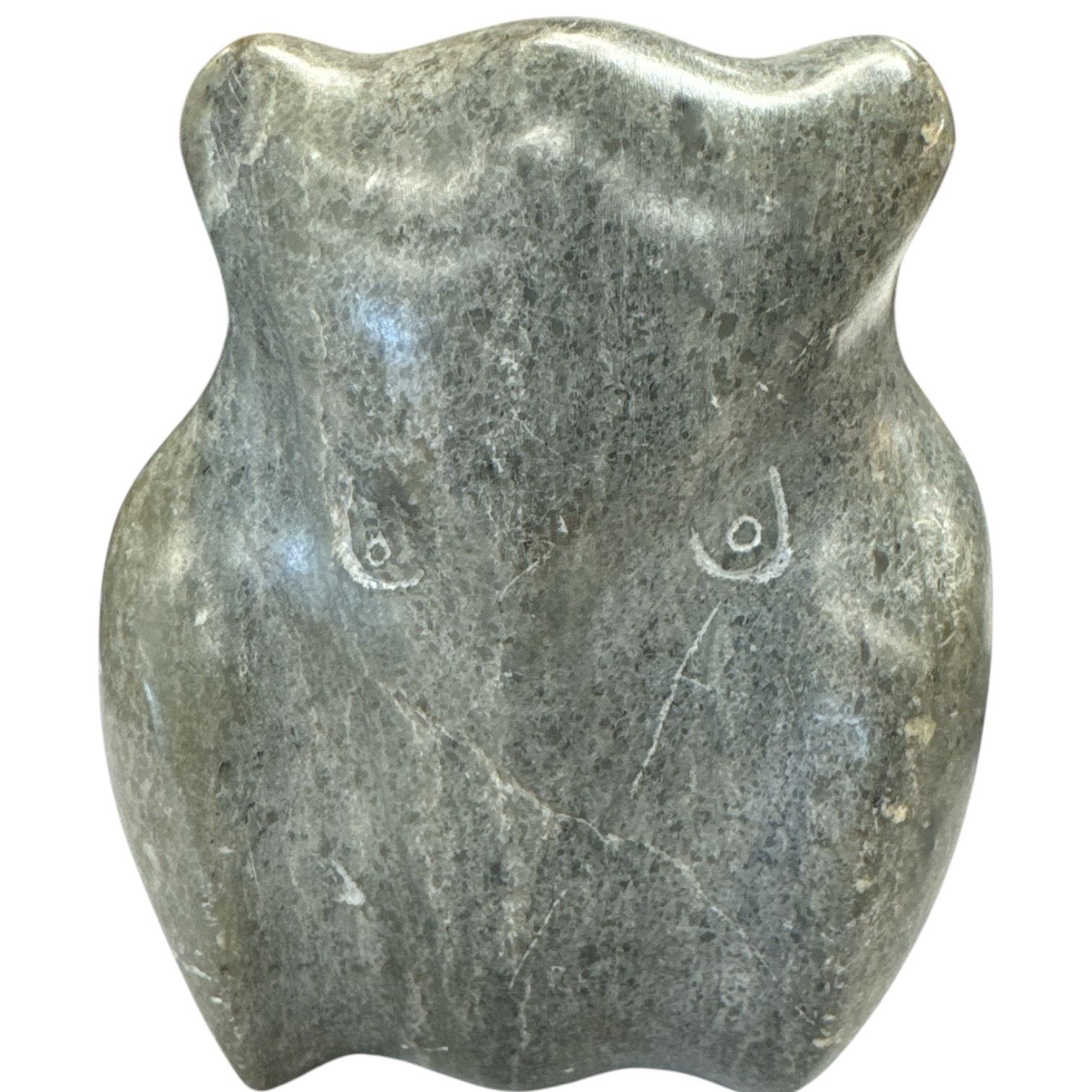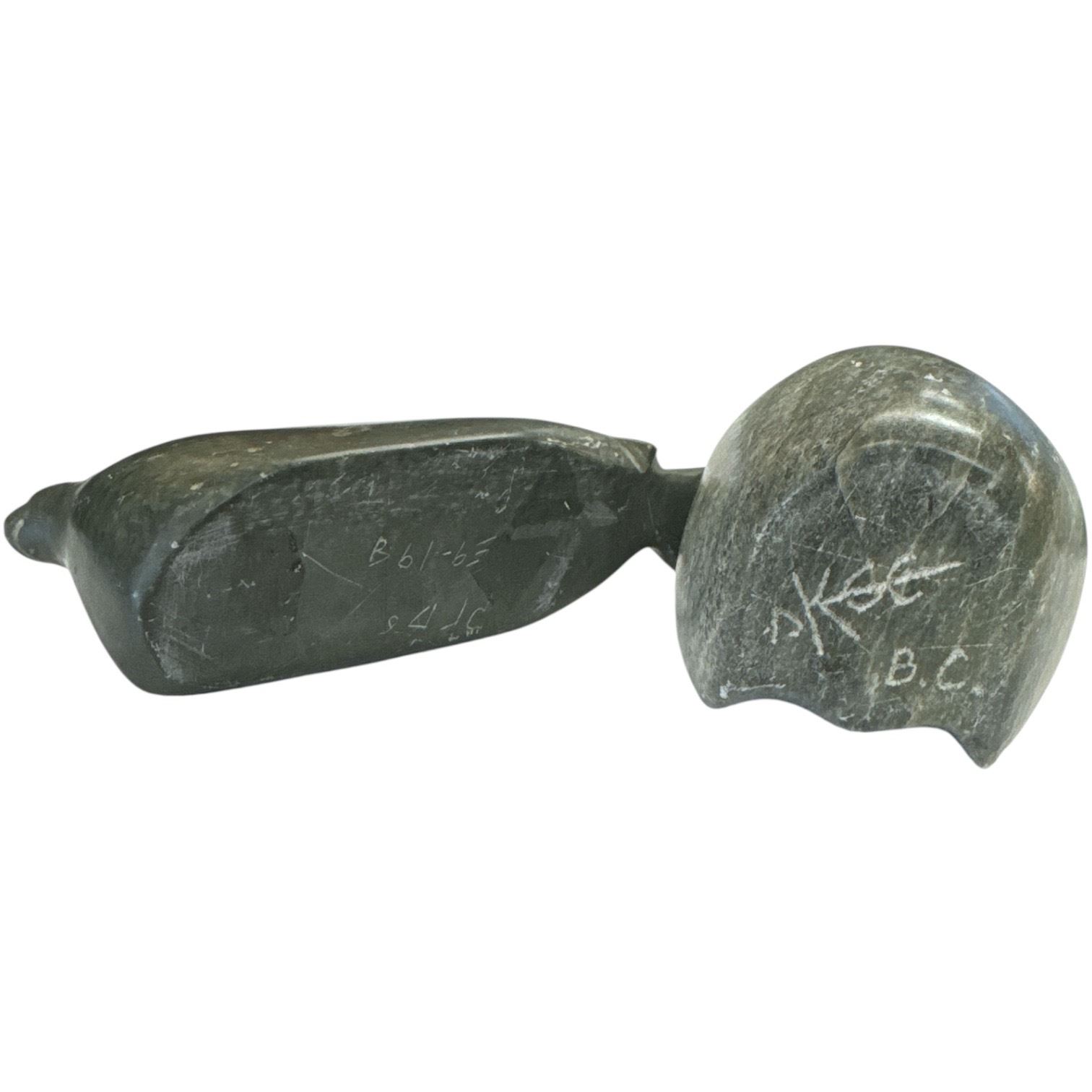 This lot includes two carved stone pieces: a 4-Inch tall soapstone owl signed 'Skee' featuring hand-carved detailing and a carved stone seal signed 'J R D' with intricate features. Both items showcase artisan craftsmanship and are signed by their respective artists. Items are as pictured.
