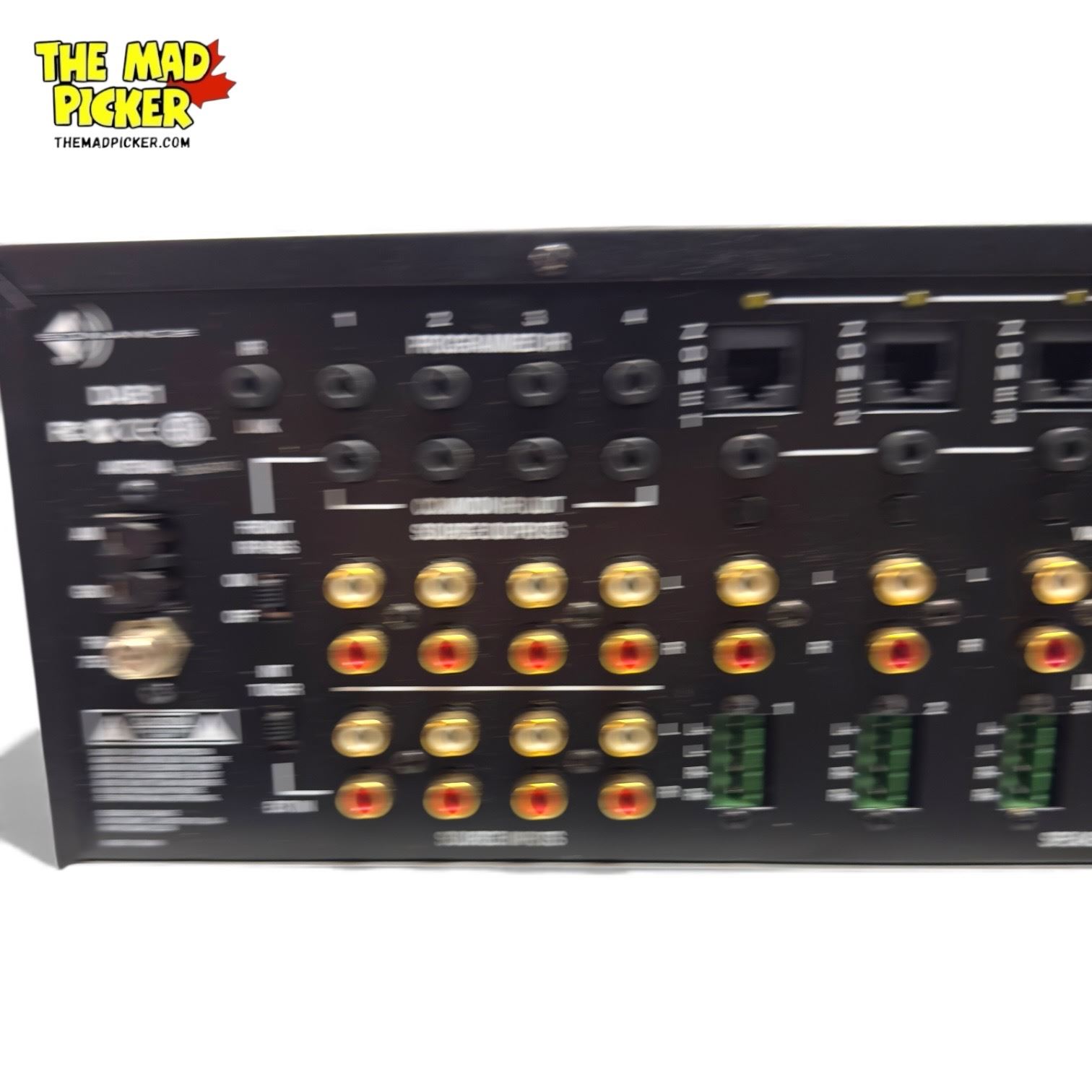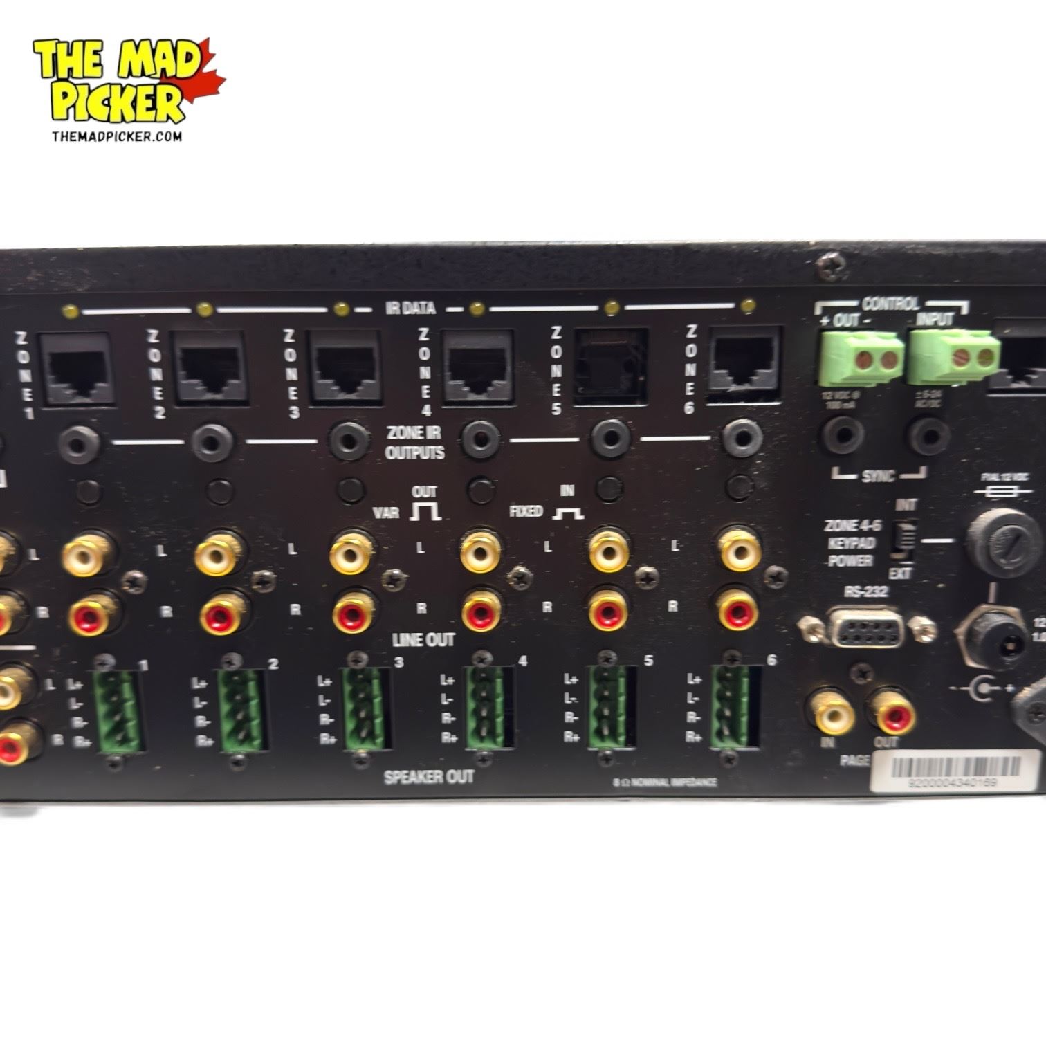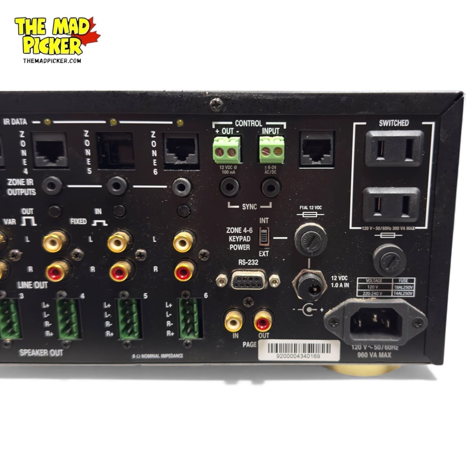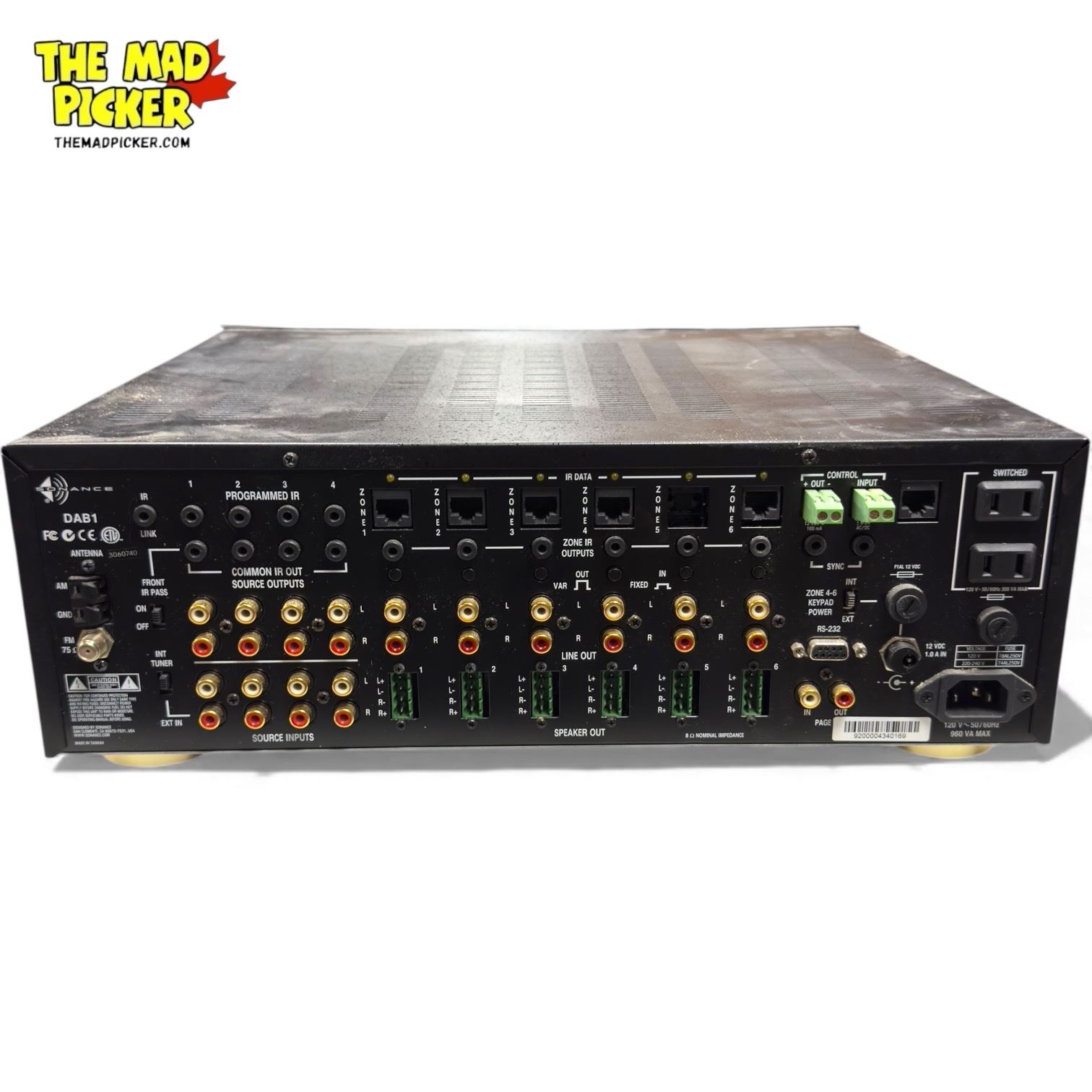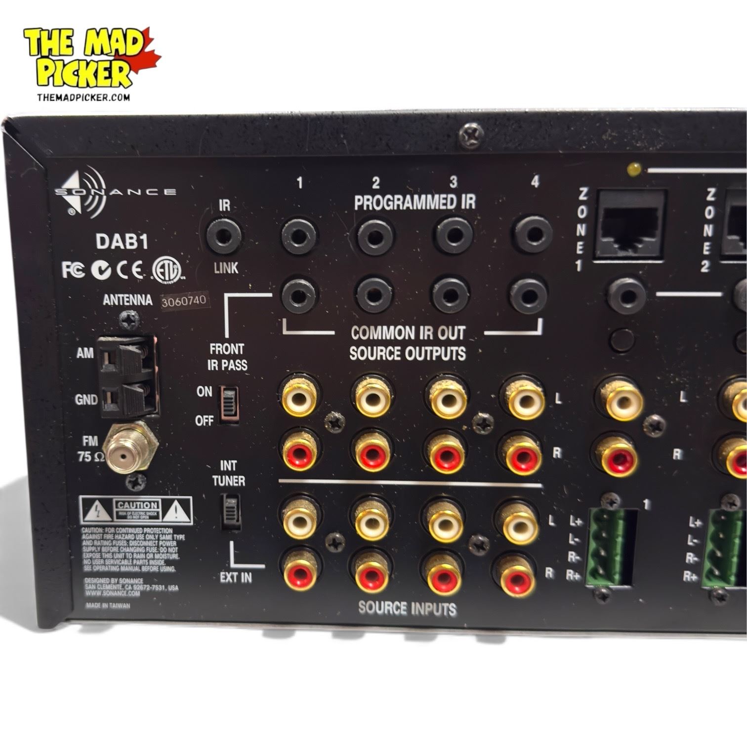 The Sonance DAB1 is a 6-zone, 4-source distributed audio system with built-in 30W x2 amplifiers per zone, an AM/FM tuner, and RS-232 integration. Expandable to 24 zones with up to 4 units. Specifications: 6 stereo zones; 4 audio sources (internal tuner + 3 external); amplification: 30W RMS per channel @ 8Ω; frequency response 20Hz–20kHz ±1dB; THD 0.05% at 1kHz, 0.2% across 20Hz–20kHz; signal-to-noise ratio –95dB. Inputs/Outputs: 4 stereo analog inputs, 6 speaker-level outputs, 6 line-level outputs, buffered loop outputs, 12V trigger inputs/outputs, RS-232 control port, 14 IR outputs (6 zone-specific, 4 common, 4 programmable). Tuner: built-in AM/FM with 12 presets, US range 88.1–107.9MHz, EU range 87.5–108.0MHz, stereo separation 35dB