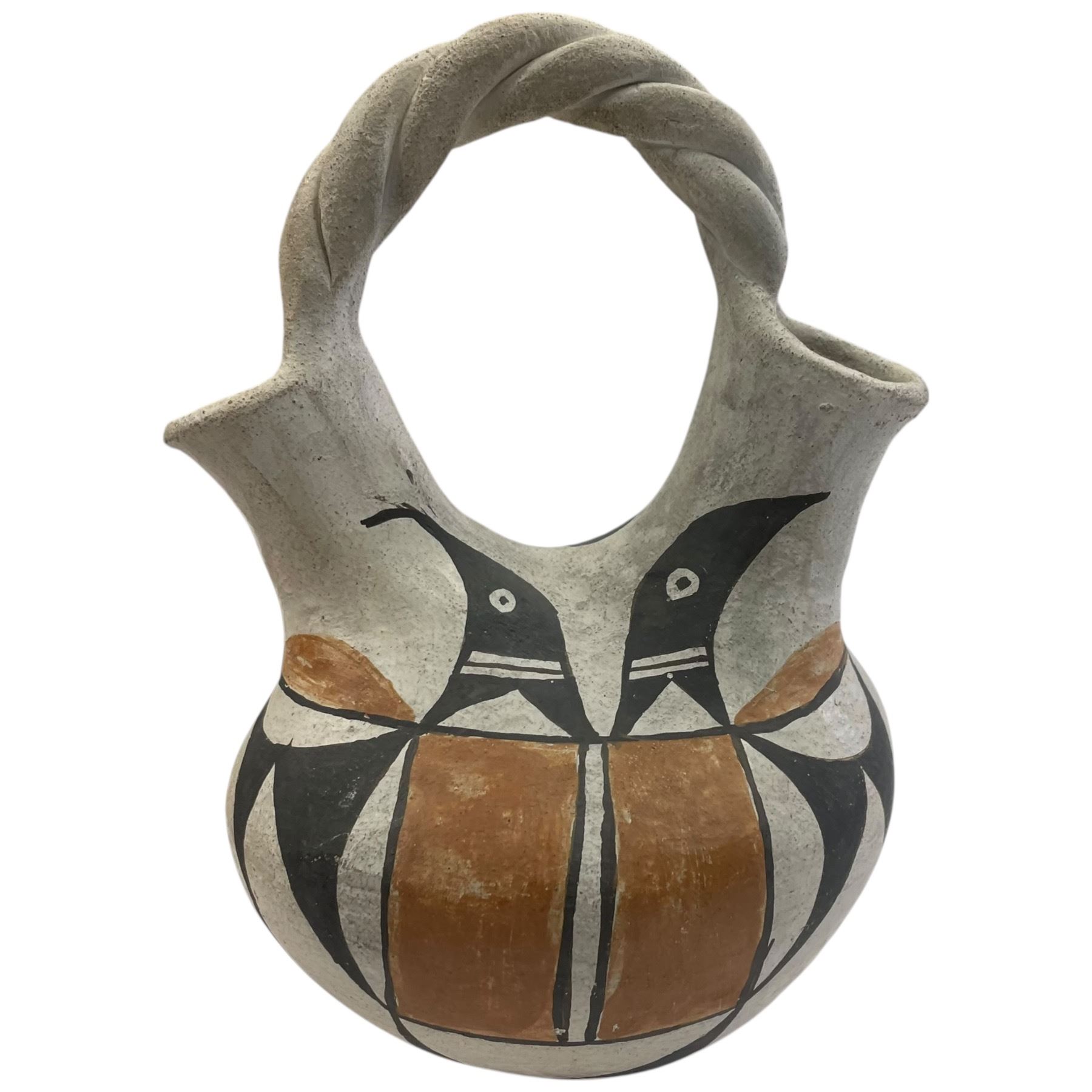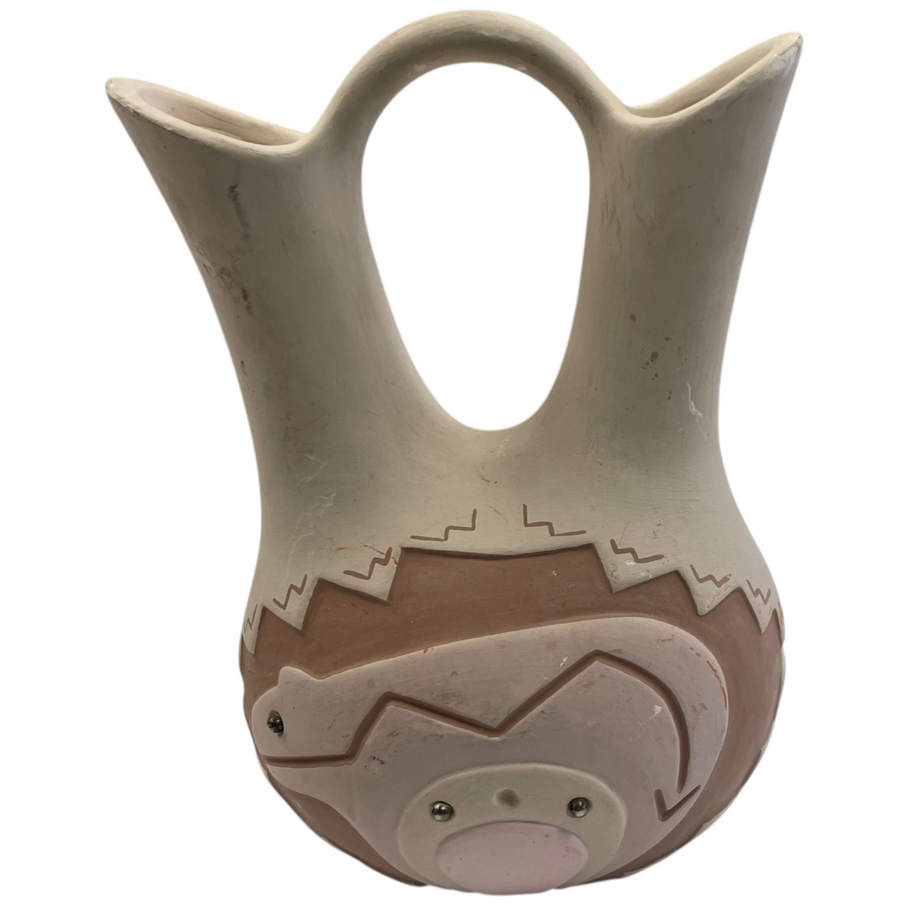 Collection of Southwestern Native American pottery and art items includes wedding vases, a bell, wall hanging art, and fused glass pieces. Designs and materials reflect traditional Native American cultural influences. Item is as pictured.