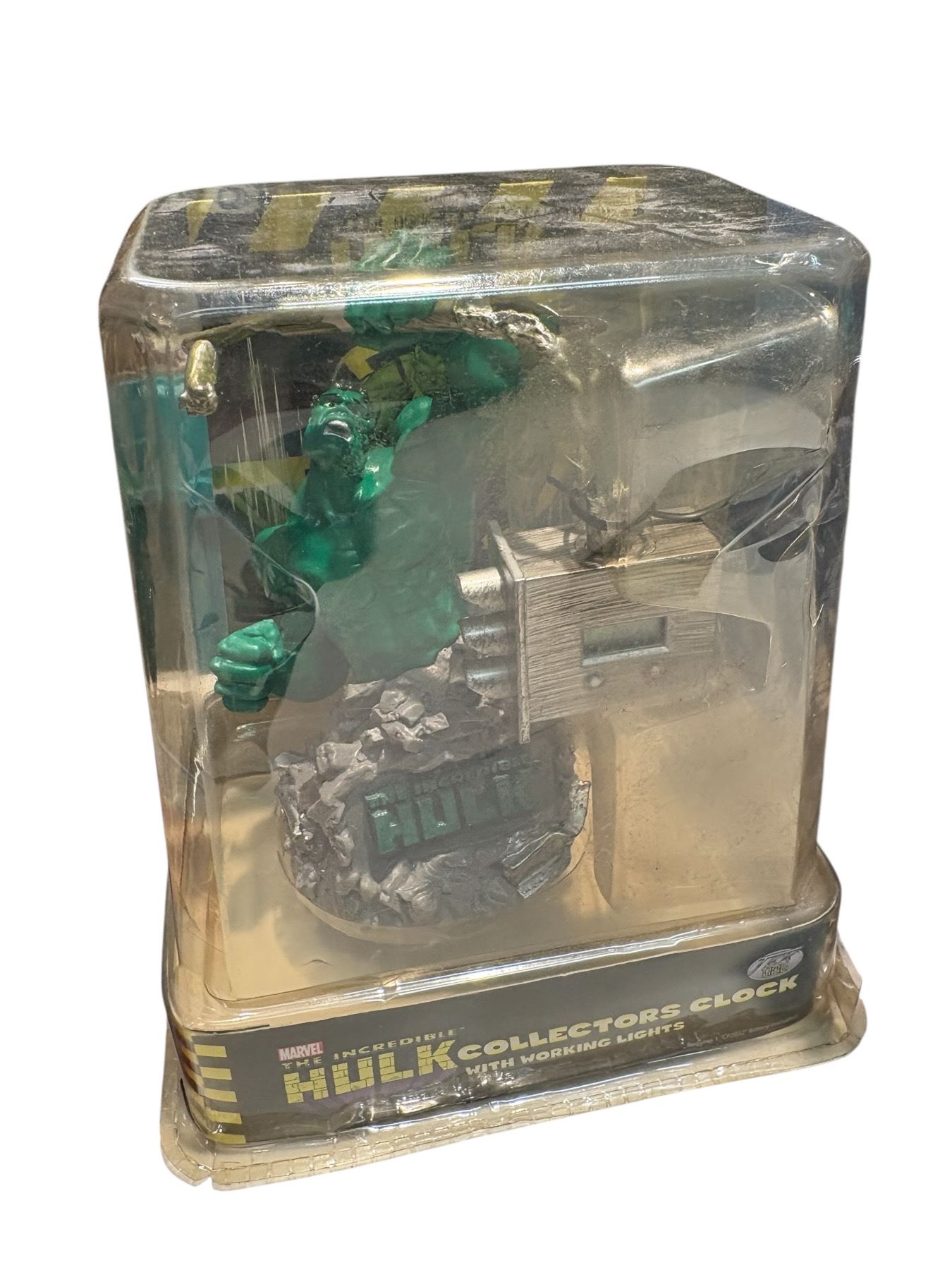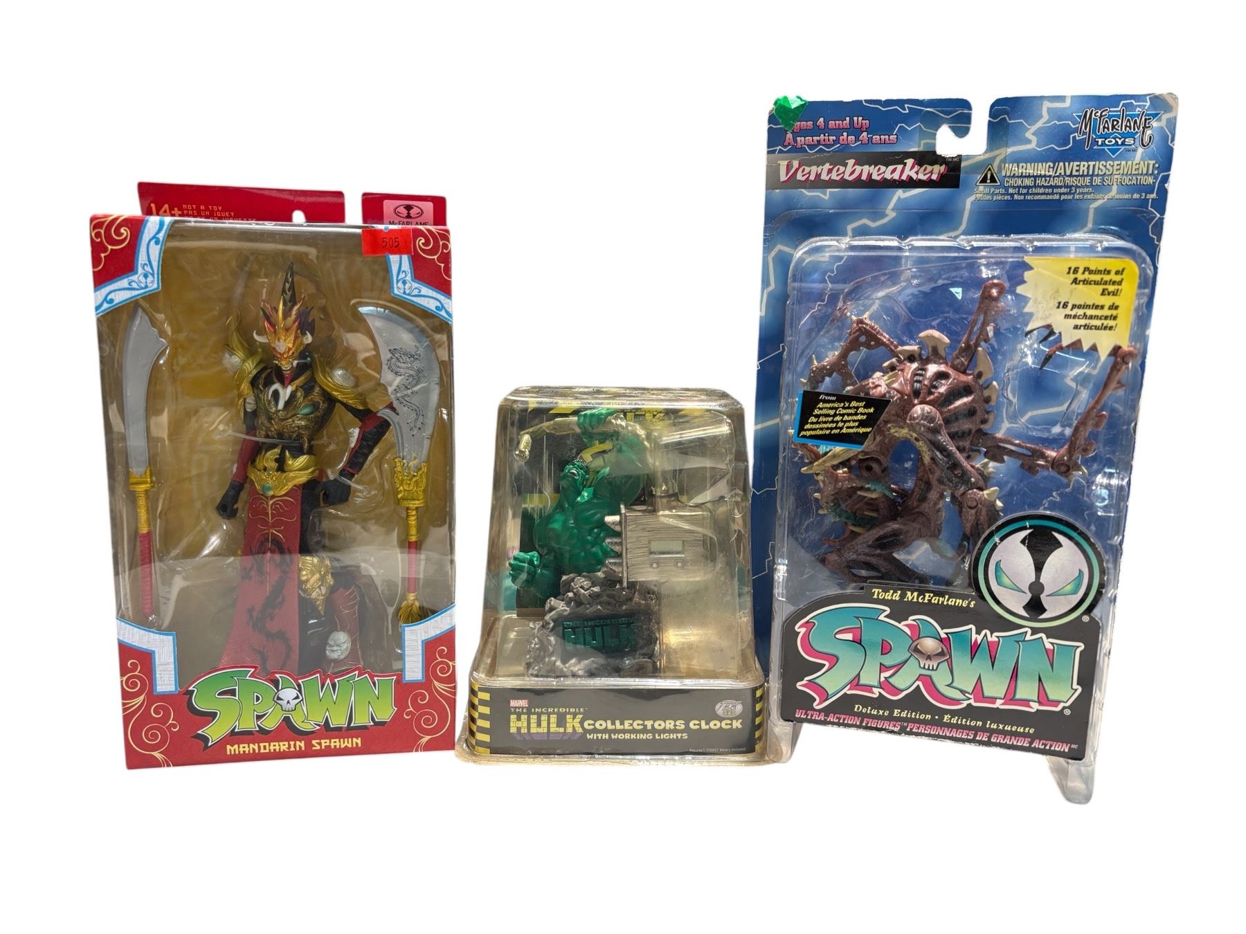Set includes two action figures: Spawn Vertebreaker and Mandarin Spawn, both produced by McFarlane Toys. Also features a Hulk Collectors Wall Clock. Spawn figures showcase intricate detailing and articulation, while the clock features Hulk imagery. Release dates and manufacturers vary by item.