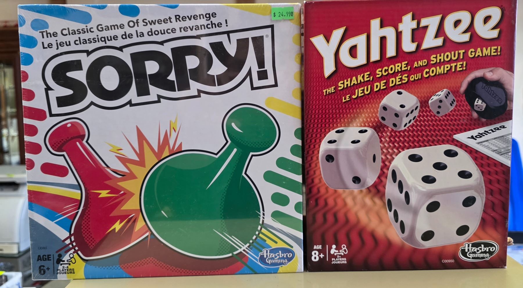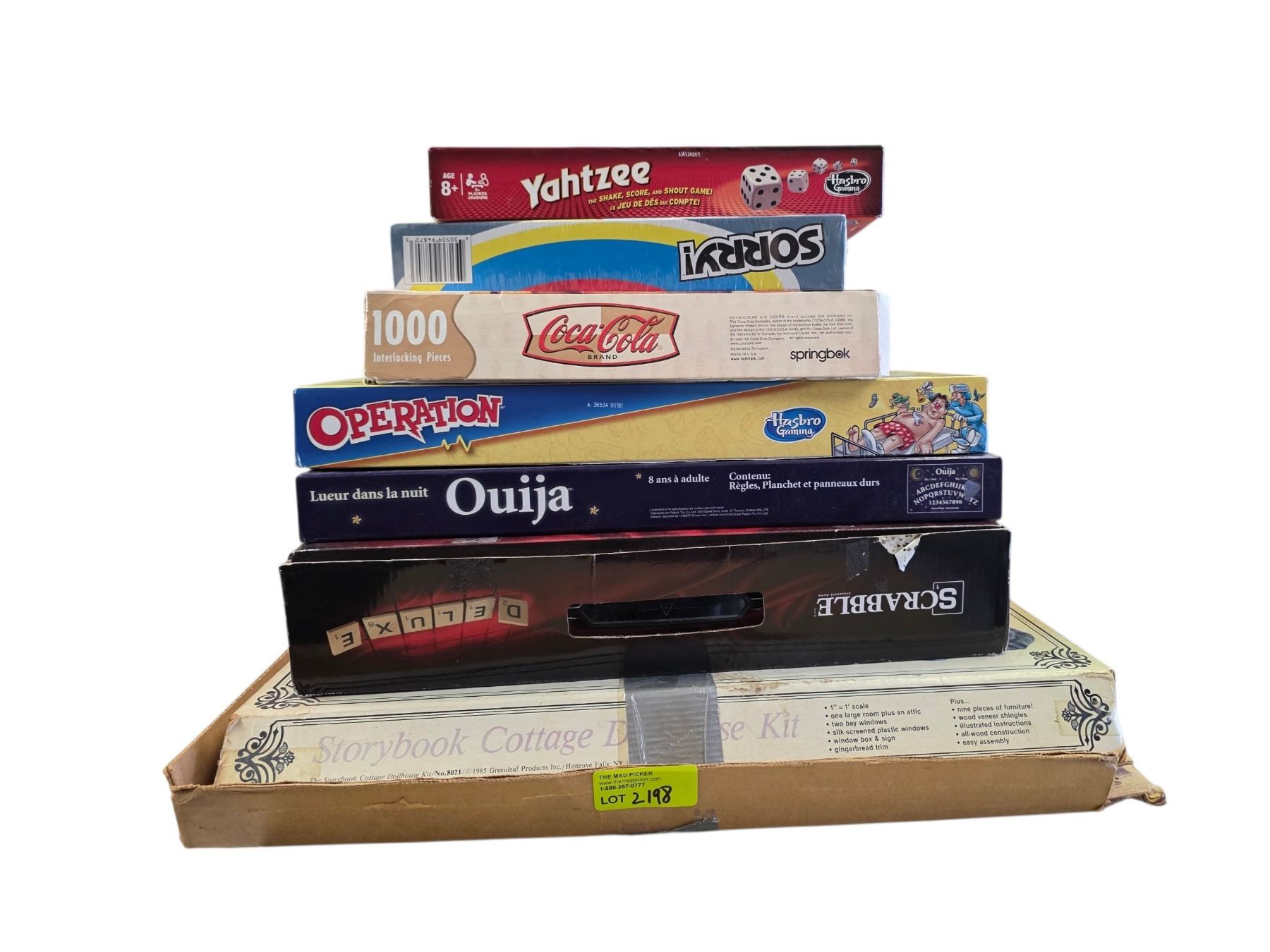 Stack of 7 Assorted Toys and Games * Ouija, Sorry, Yahtzee, Scrabble, Coca-Cola Puzzle, Doll House Parts * All Preowned * Do not know if they are complete