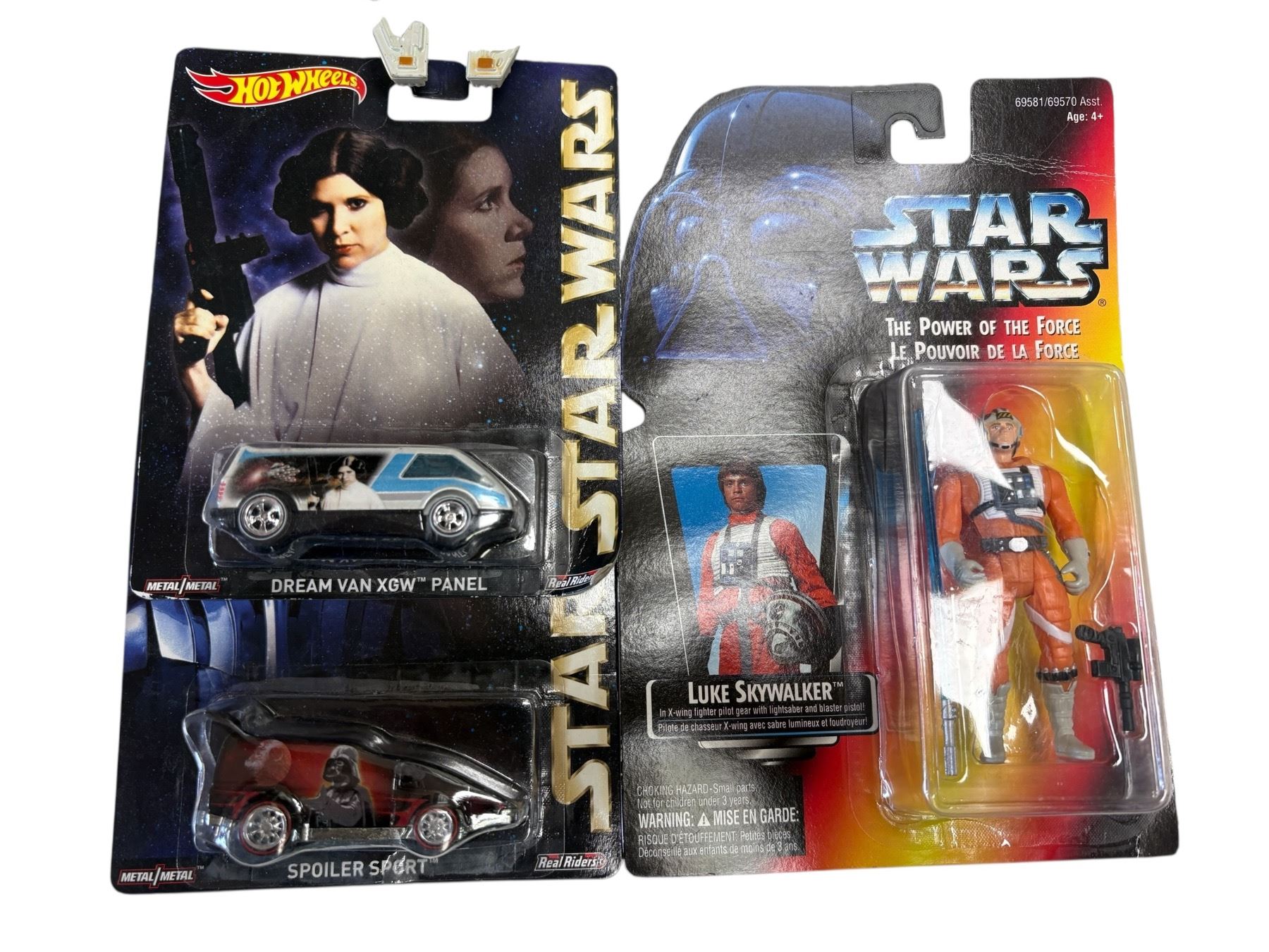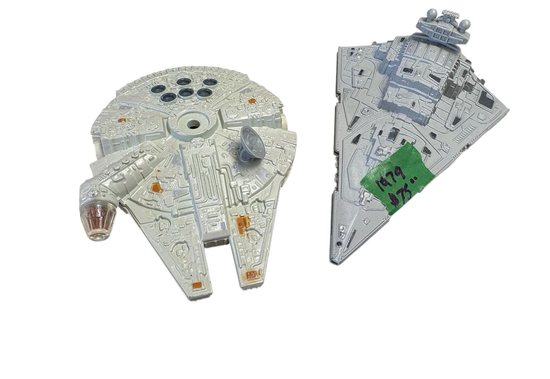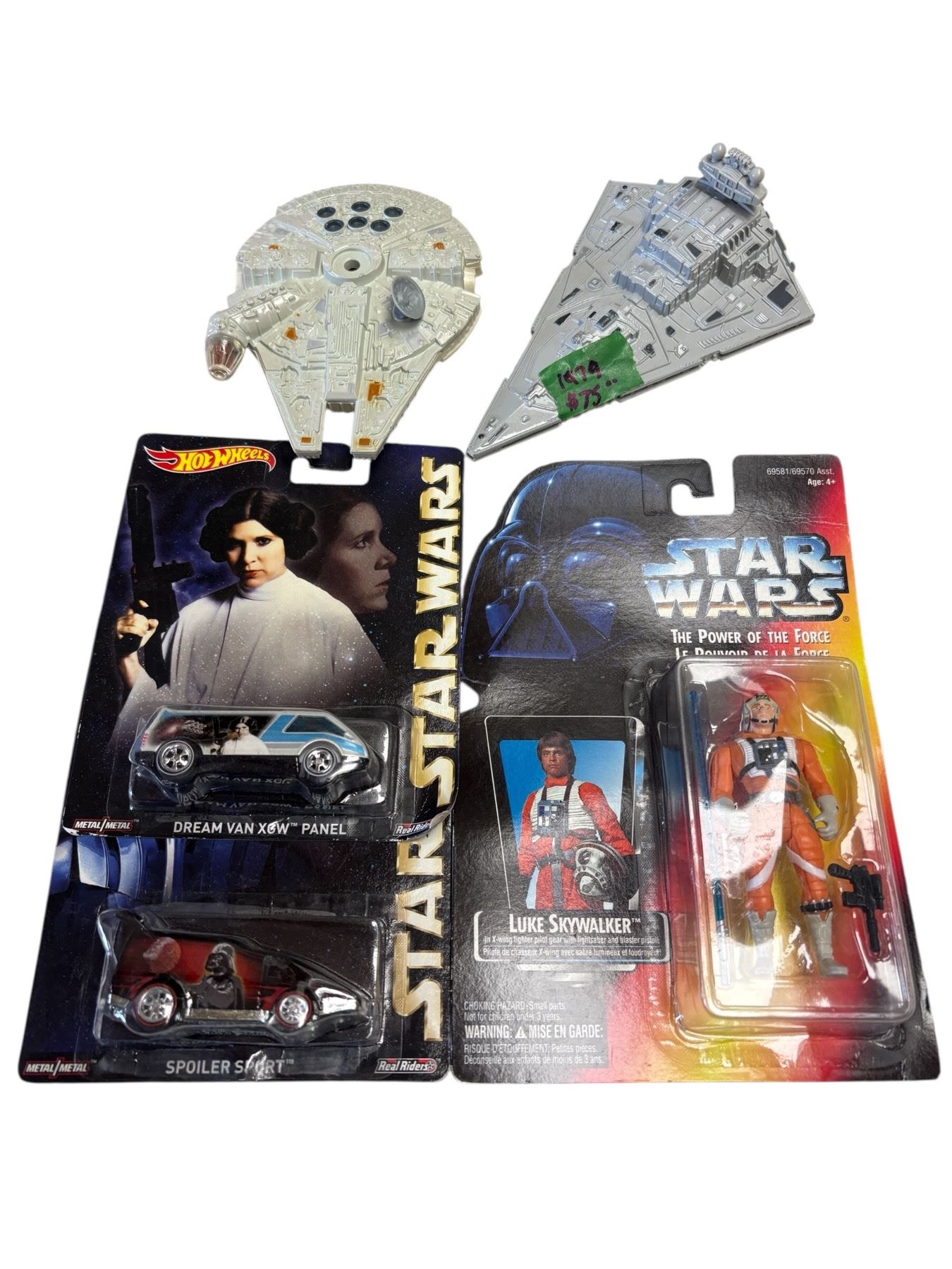 Lot includes Star Wars Millennium Falcon and Imperial Star Destroyer diecast models (1977-1985 production by Kenner), Luke Skywalker 3.75-inch action figure by Kenner (1977-1985), and 2 vintage Hot Wheels diecast cars (). Item is as pictured.