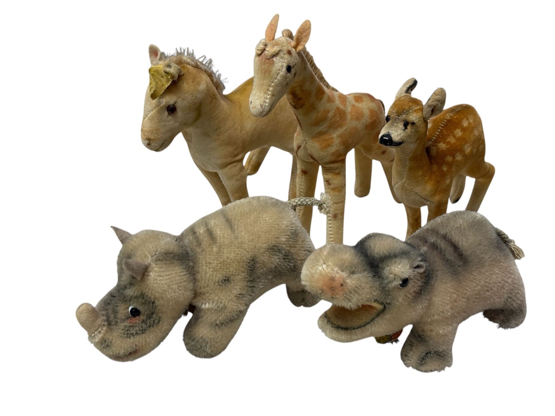Collection of 5 Steiff plush animal figures, each approximately 6 inches tall. Manufactured in Germany, Steiff is known for high-quality stuffed animals featuring the signature 'Button in Ear' trademark. Specific animal types in this set not detailed. Likely mid to late 20th century.