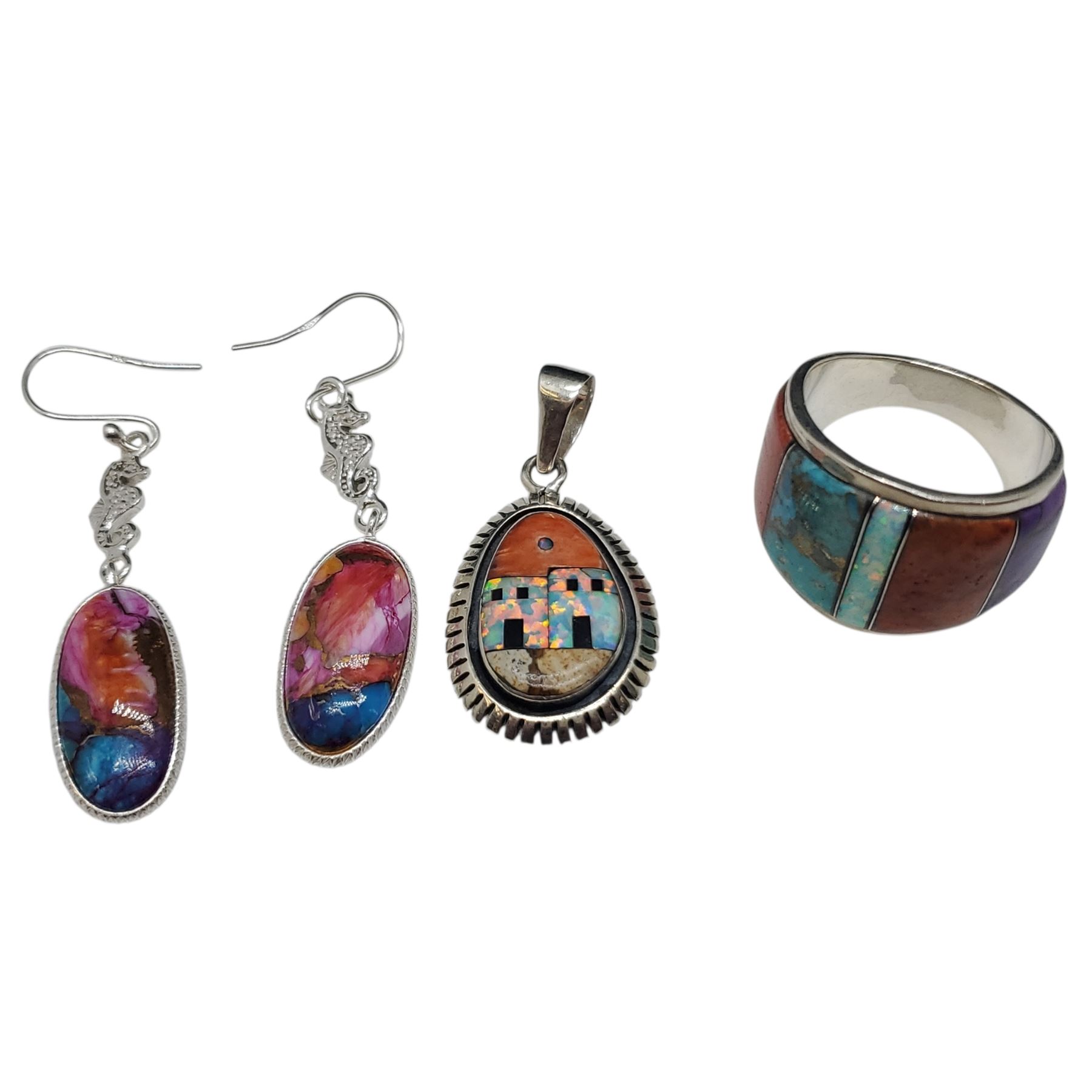 Sterling Silver Ring, Pendant & Earrings with Inlaid Opal Turquoise & Agate Stones - Total weight: 18.8 grams