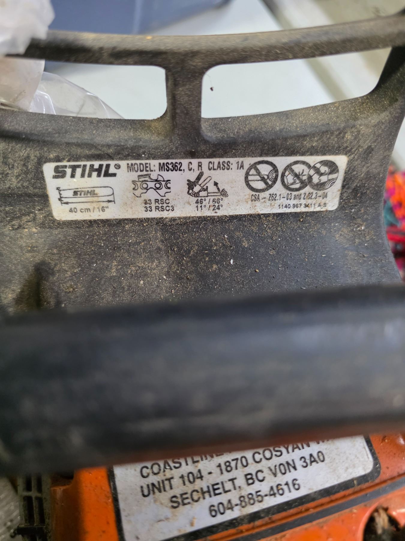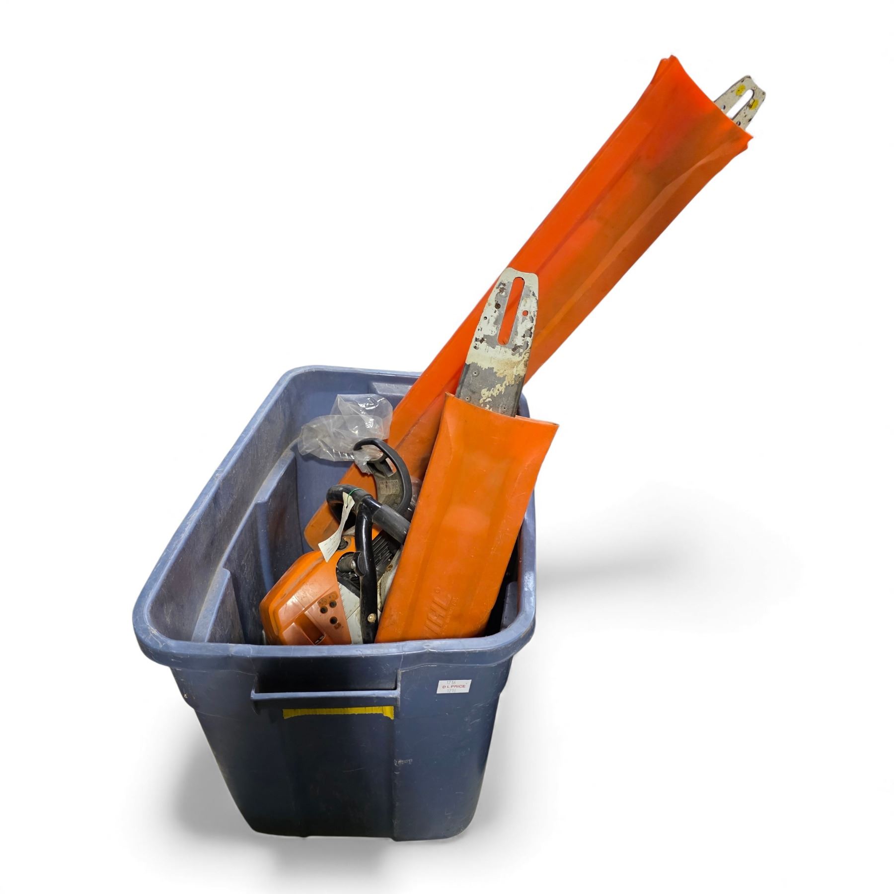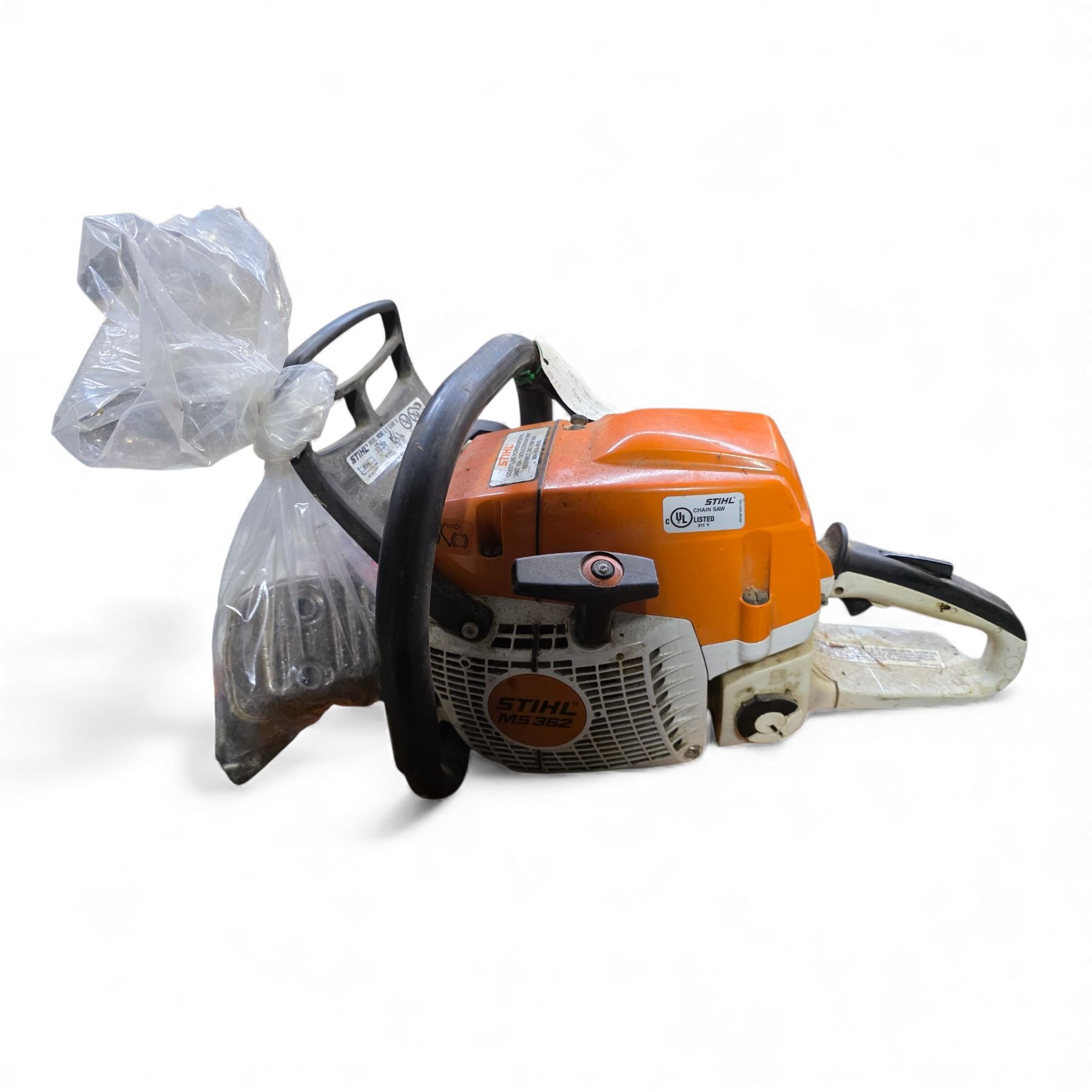 Stihl MS362 Chainsaw, Measurement Stick, and Mixed Parts Box
