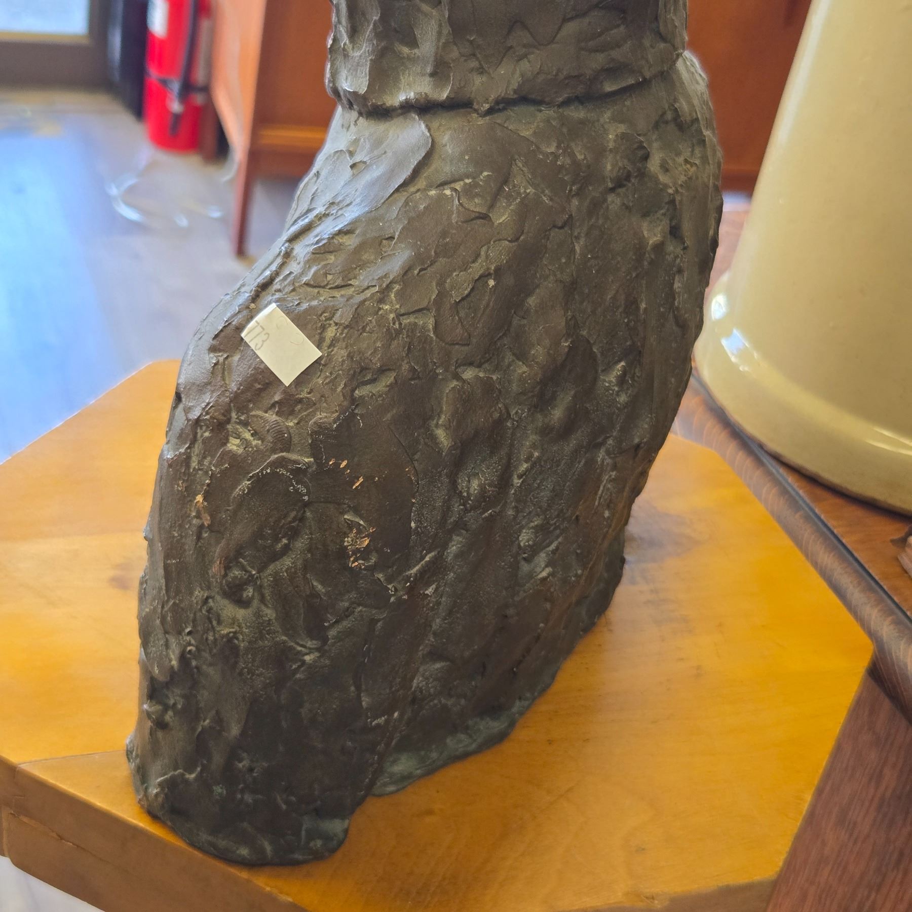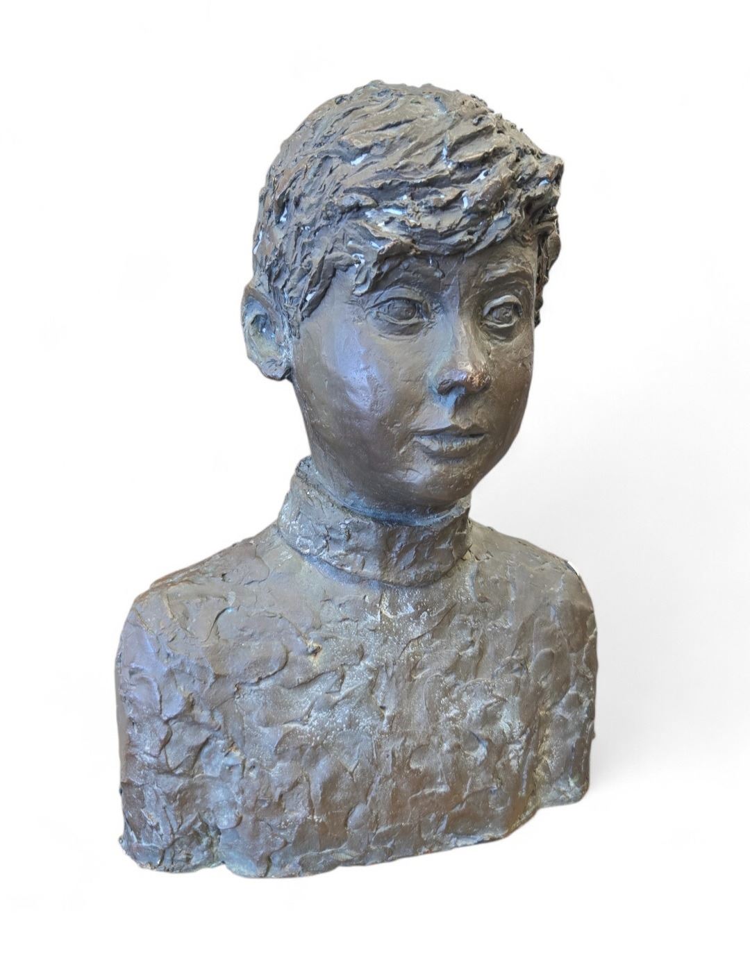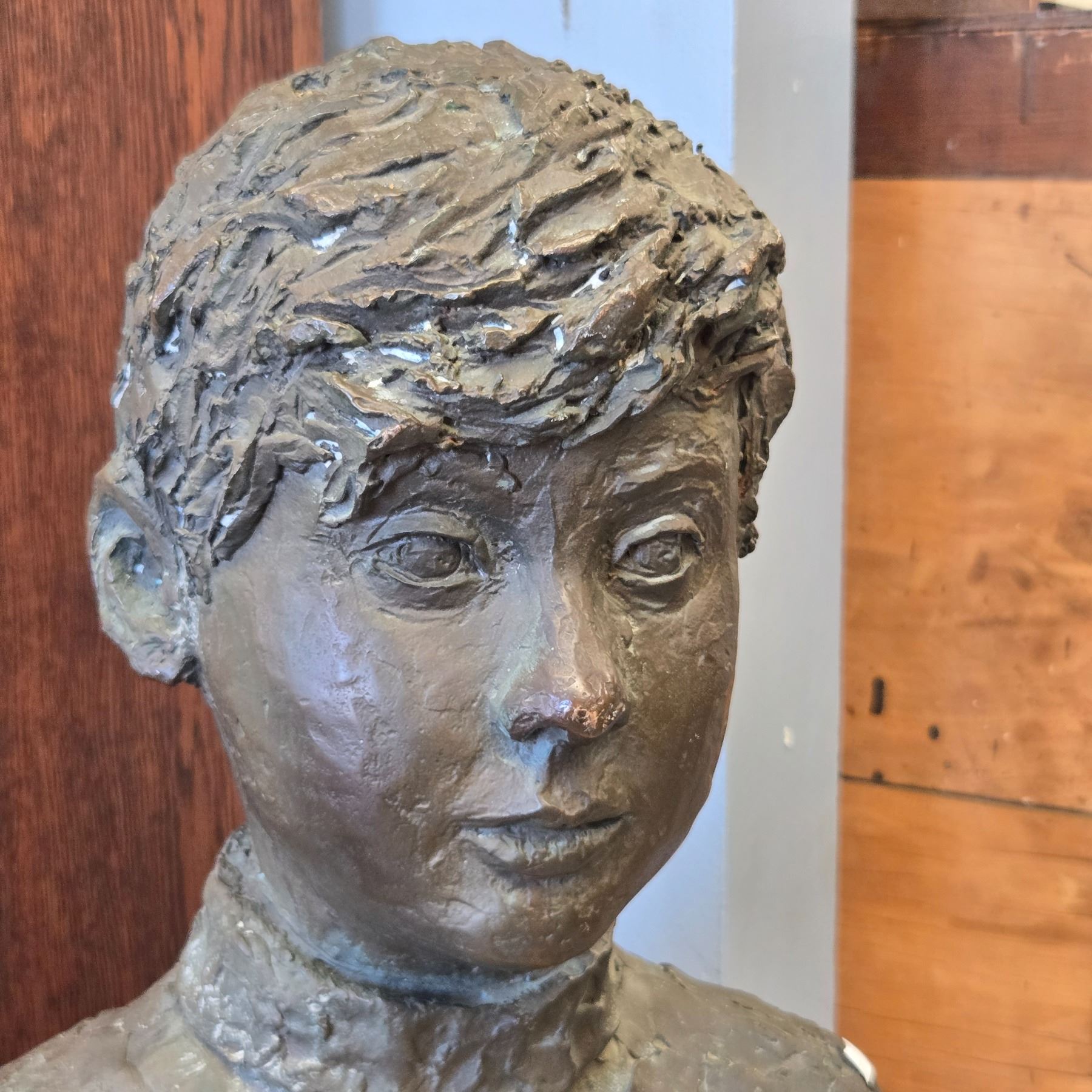 Studio bronze sculpture depicting a young boy. Signed 'Piece' by the artist. The sculpture stands 17.5-Inch tall and is noted to be very heavy. Crafted in solid bronze with detailed features. Item is as pictured.