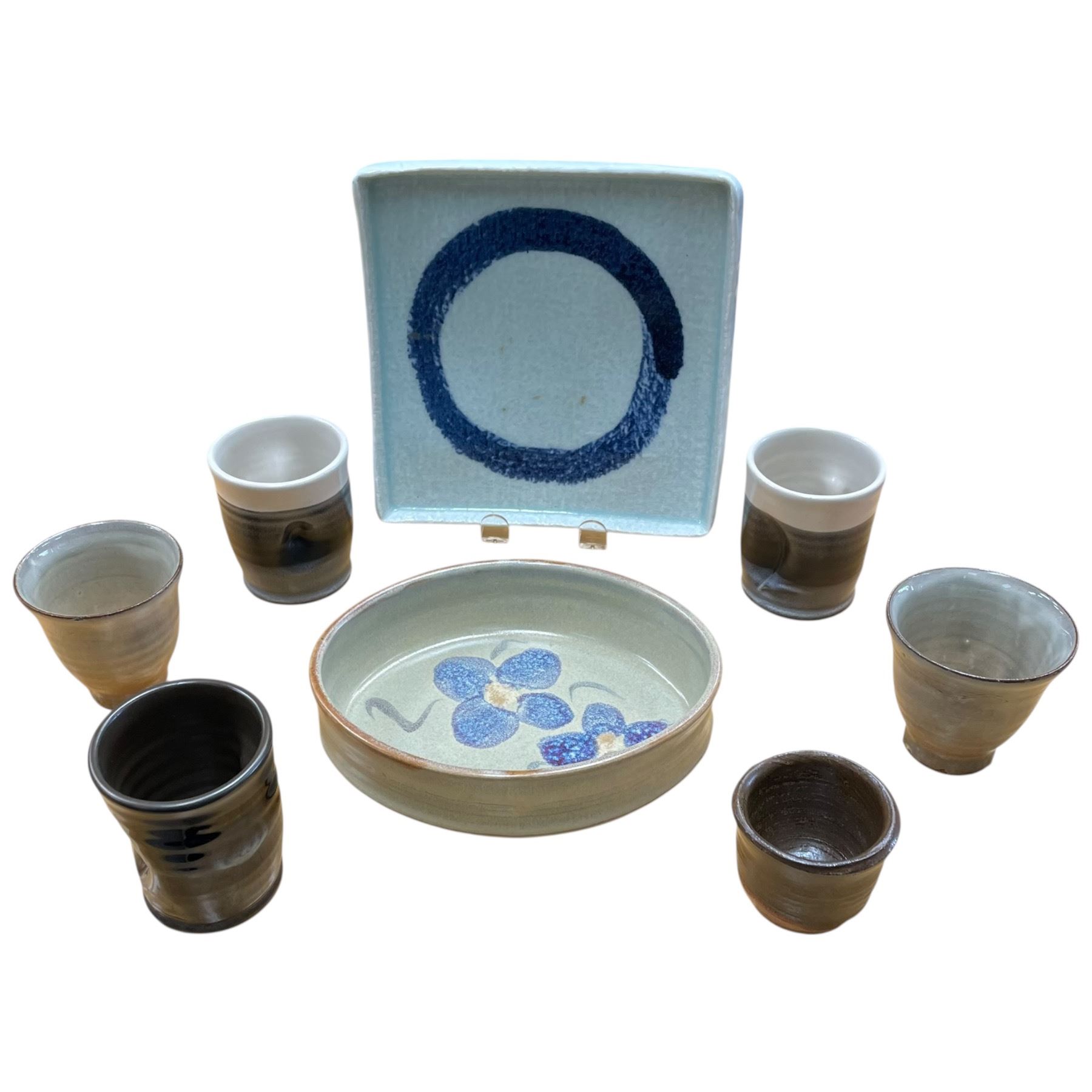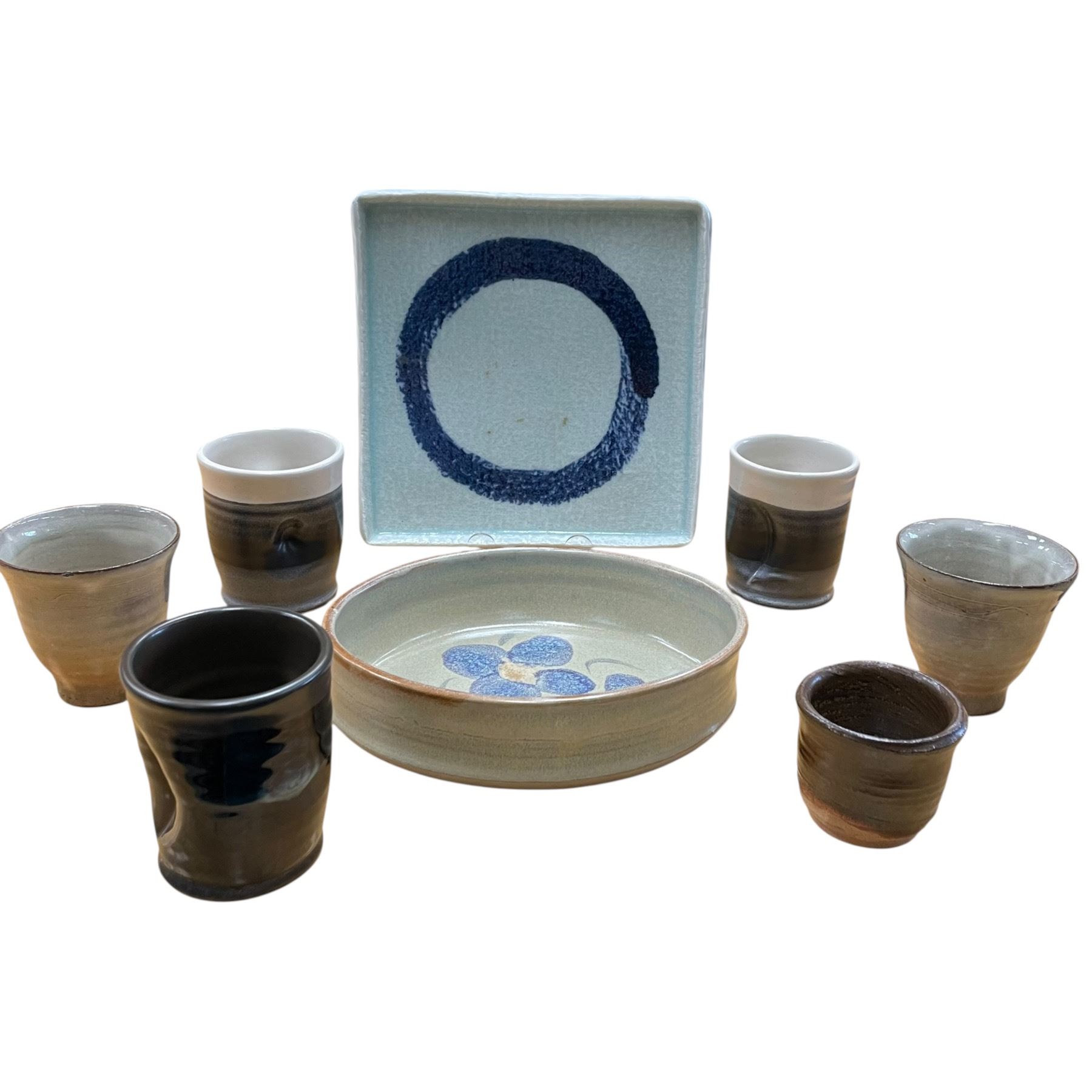 Studio ceramic pottery assemblage including plates, bowls and mugs. The included plate measures 8.25x8.25 as specified. Collection features handmade or crafted ceramic items. Item is as pictured.