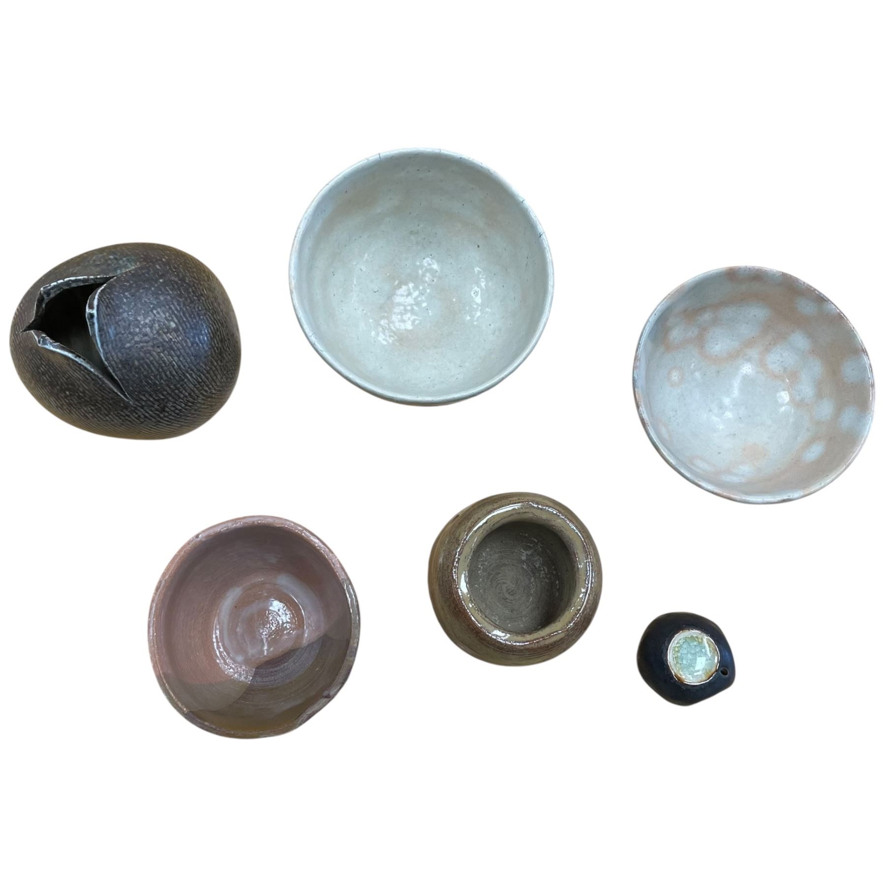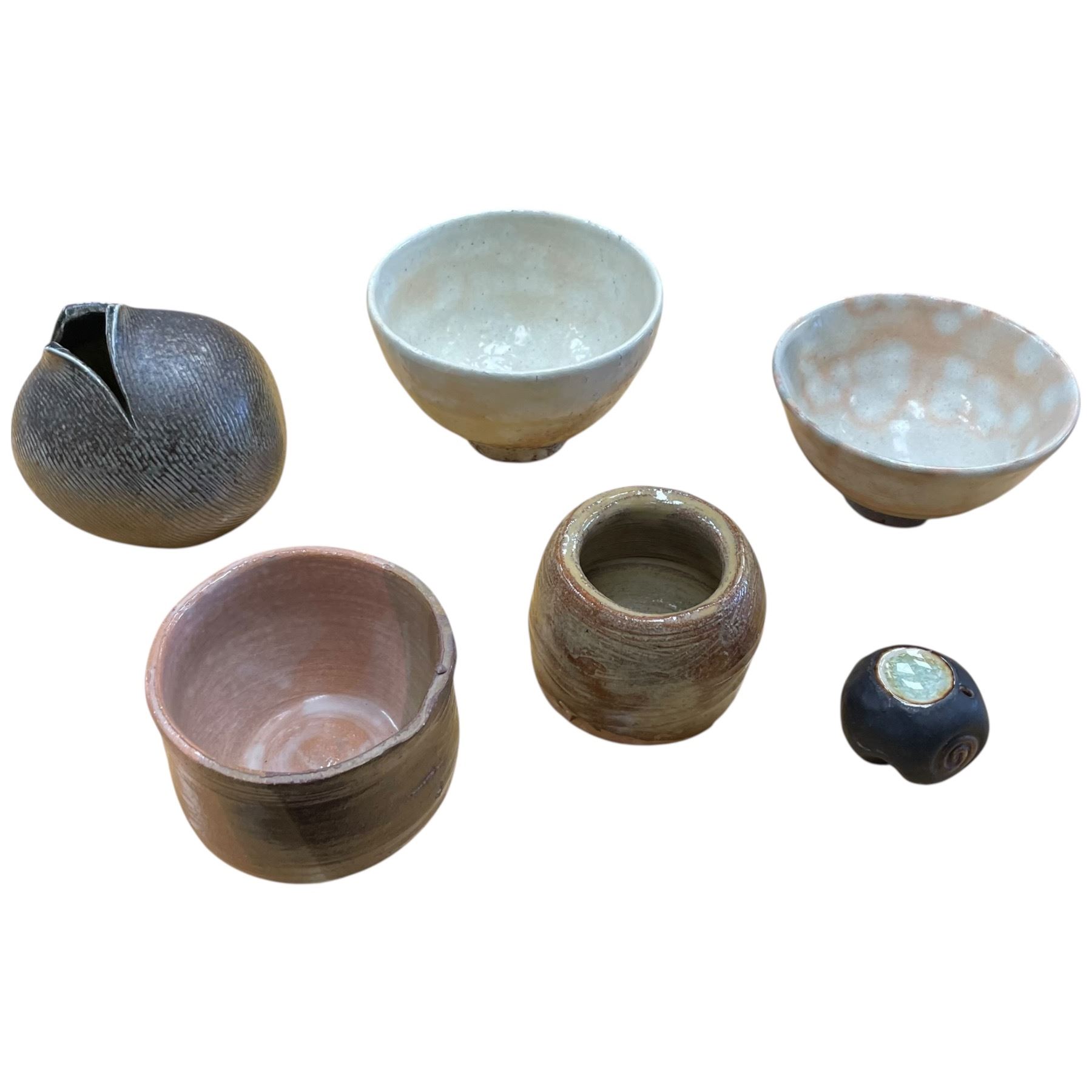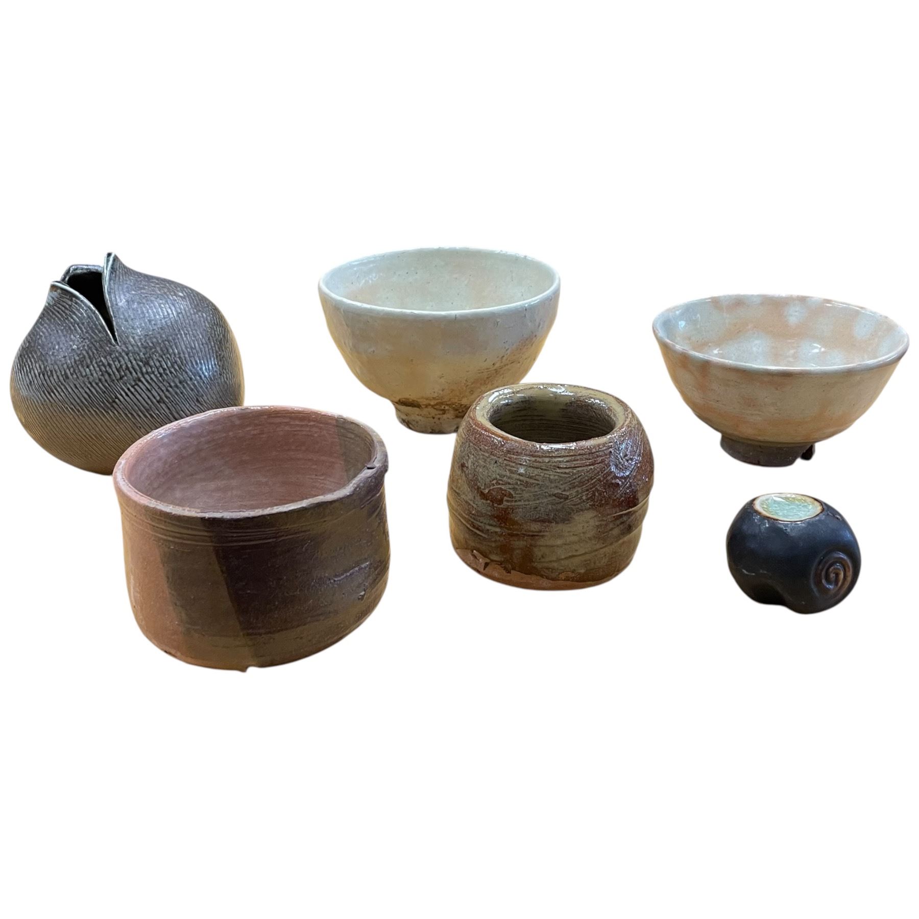 Assortment of studio pottery items including bowls and vases. Features an eggshell glaze vase measuring 5-Inch tall. Item is as pictured.