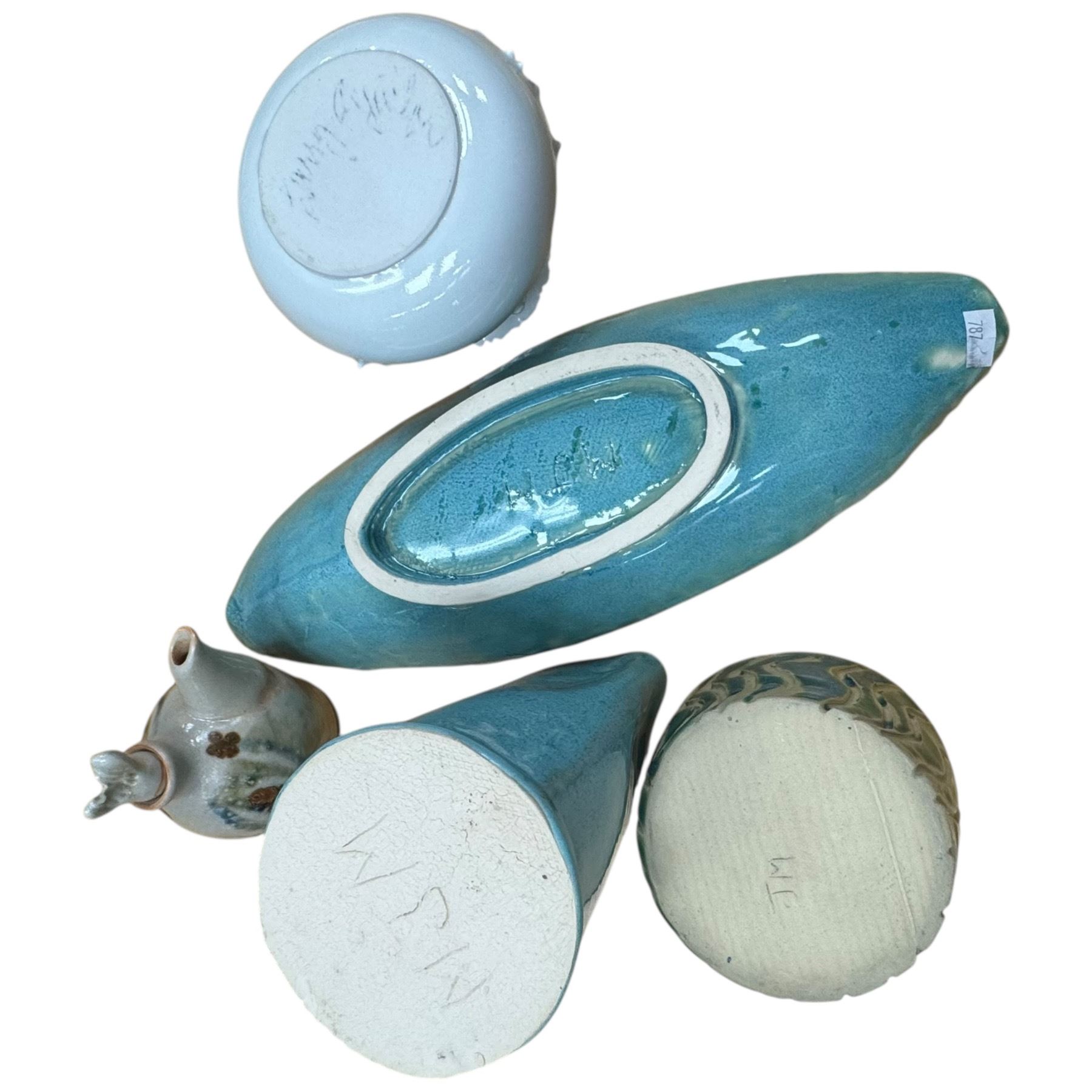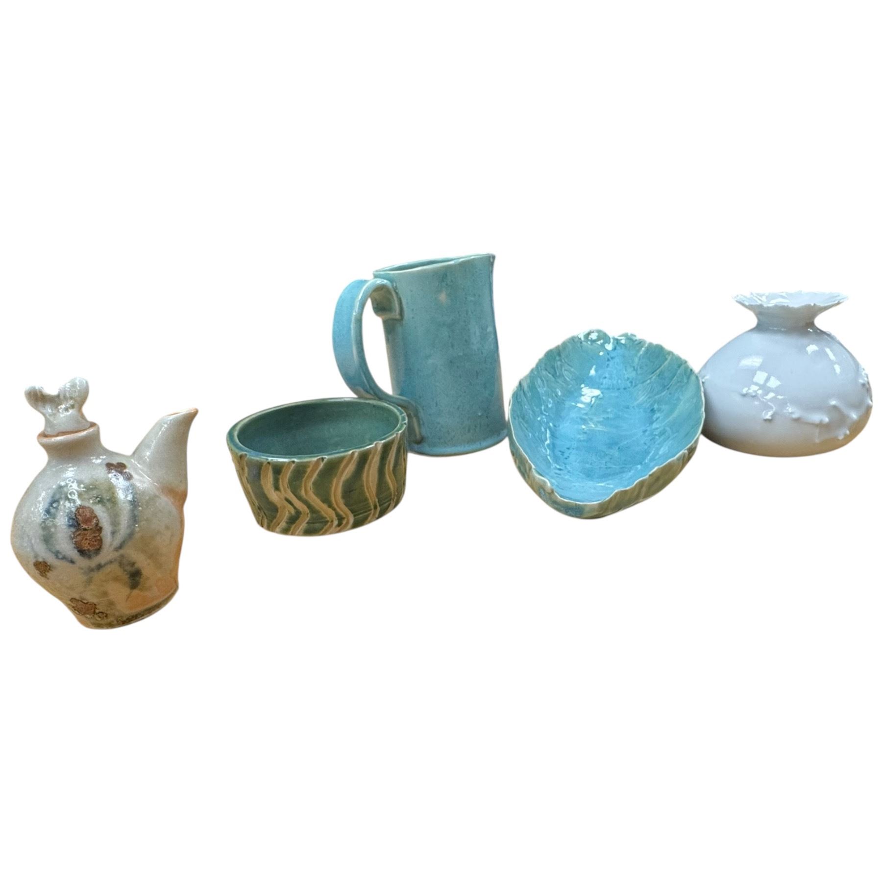 Collection of studio pottery items includes vases, a jug, a bowl, a centerpiece plate measuring 14-Inch long, and an oil jug. Handmade ceramic pieces with diverse shapes and designs. Item is as pictured.