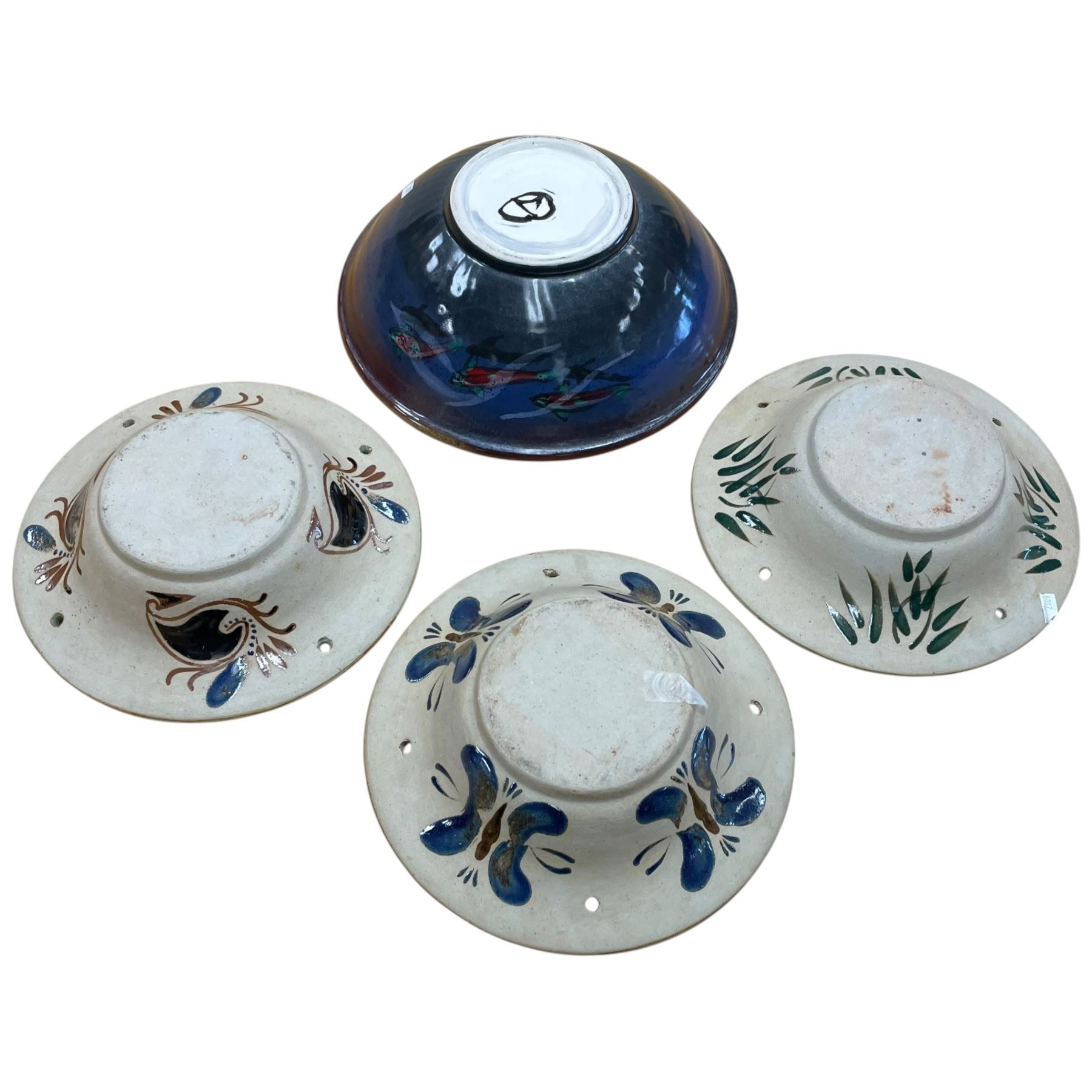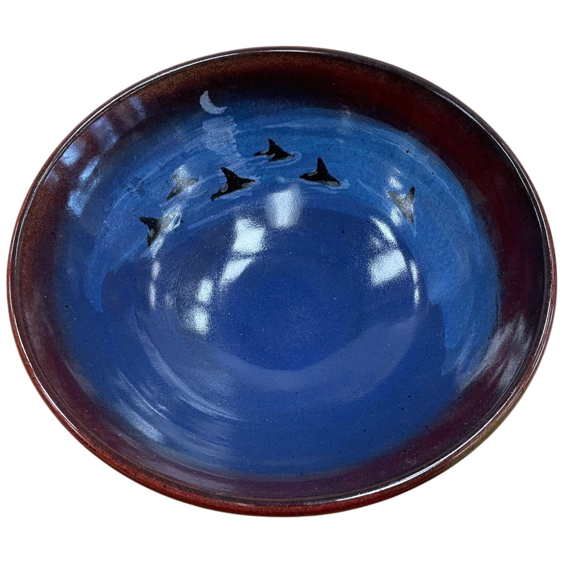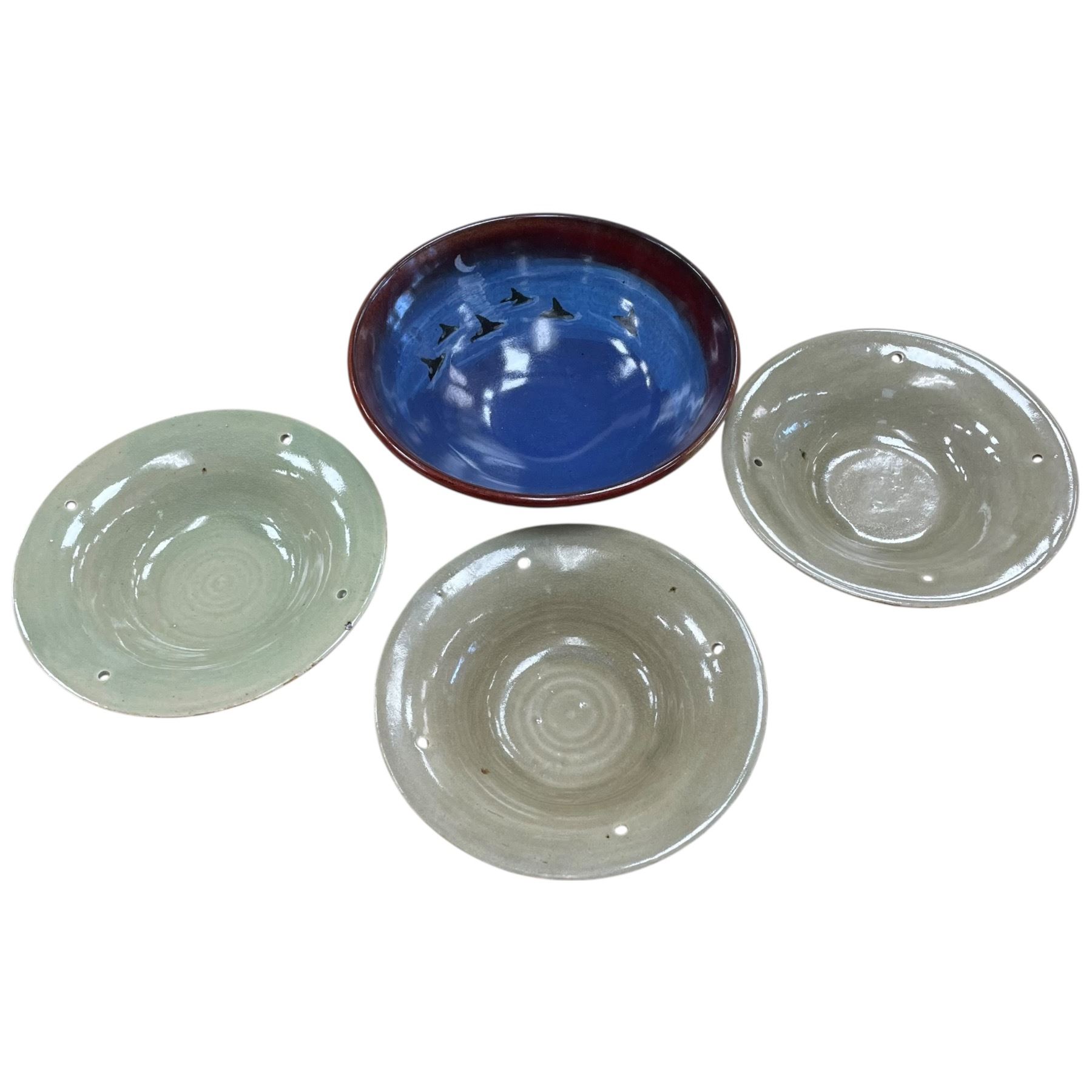 Studio pottery collection featuring a large ceramic killer whale-themed bowl measuring 11-Inch in diameter and a set of three tiered hanging porcelain bowls. The porcelain bowls require restringing. Both items showcase unique craftsmanship and are as pictured.