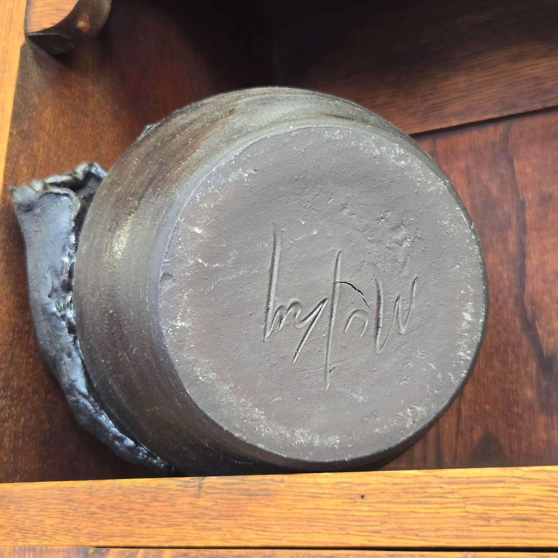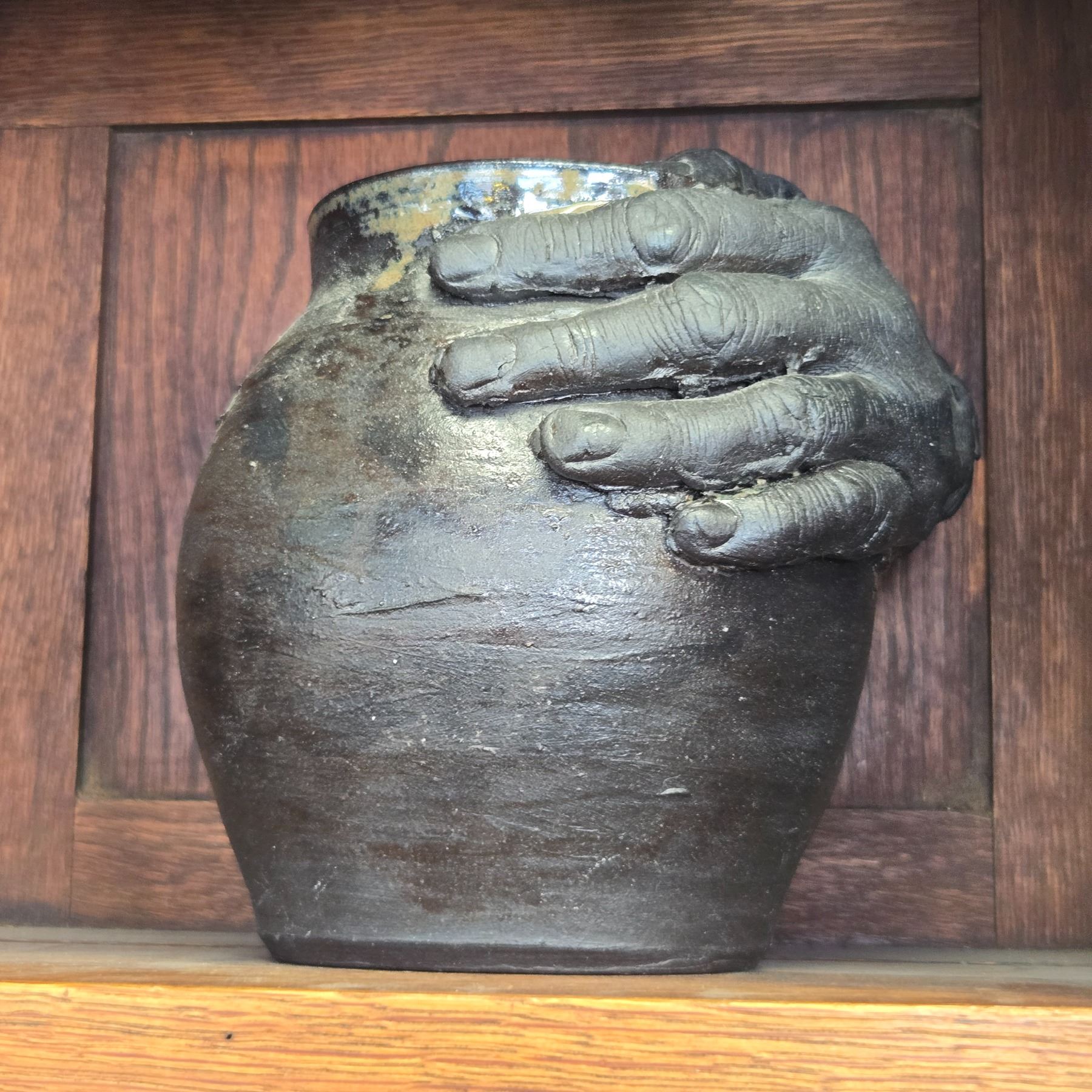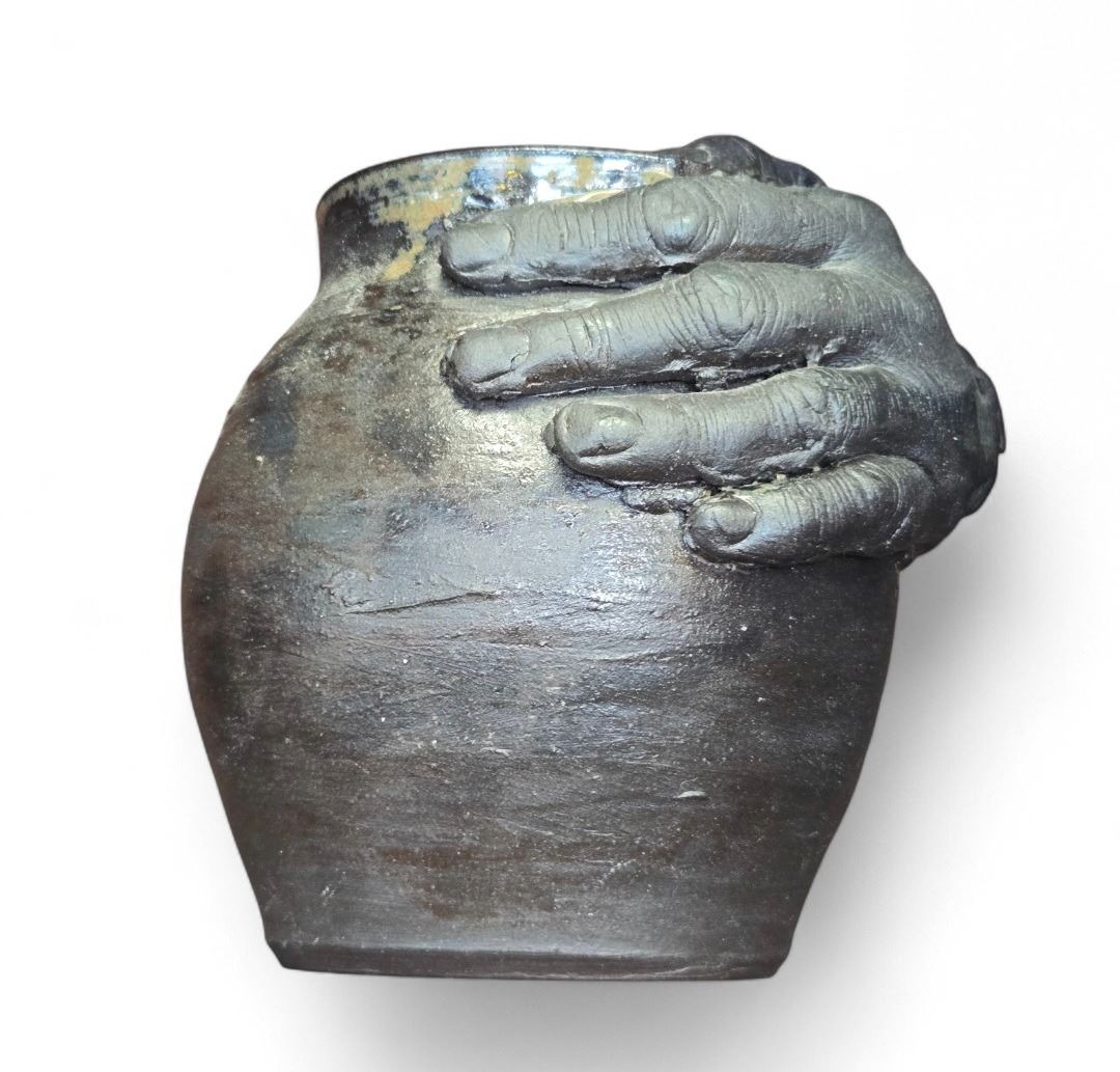 Studio pottery piece featuring a Potters Hand design, signed by McKay. Crafted as an artistic ceramic creation. Signature indicates work by the described potter McKay. Item is as pictured.