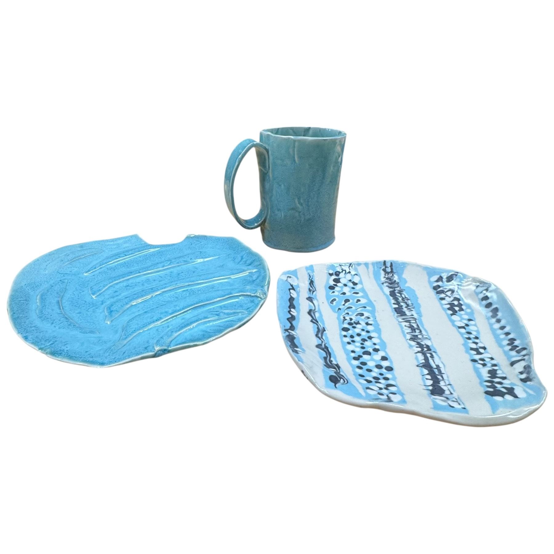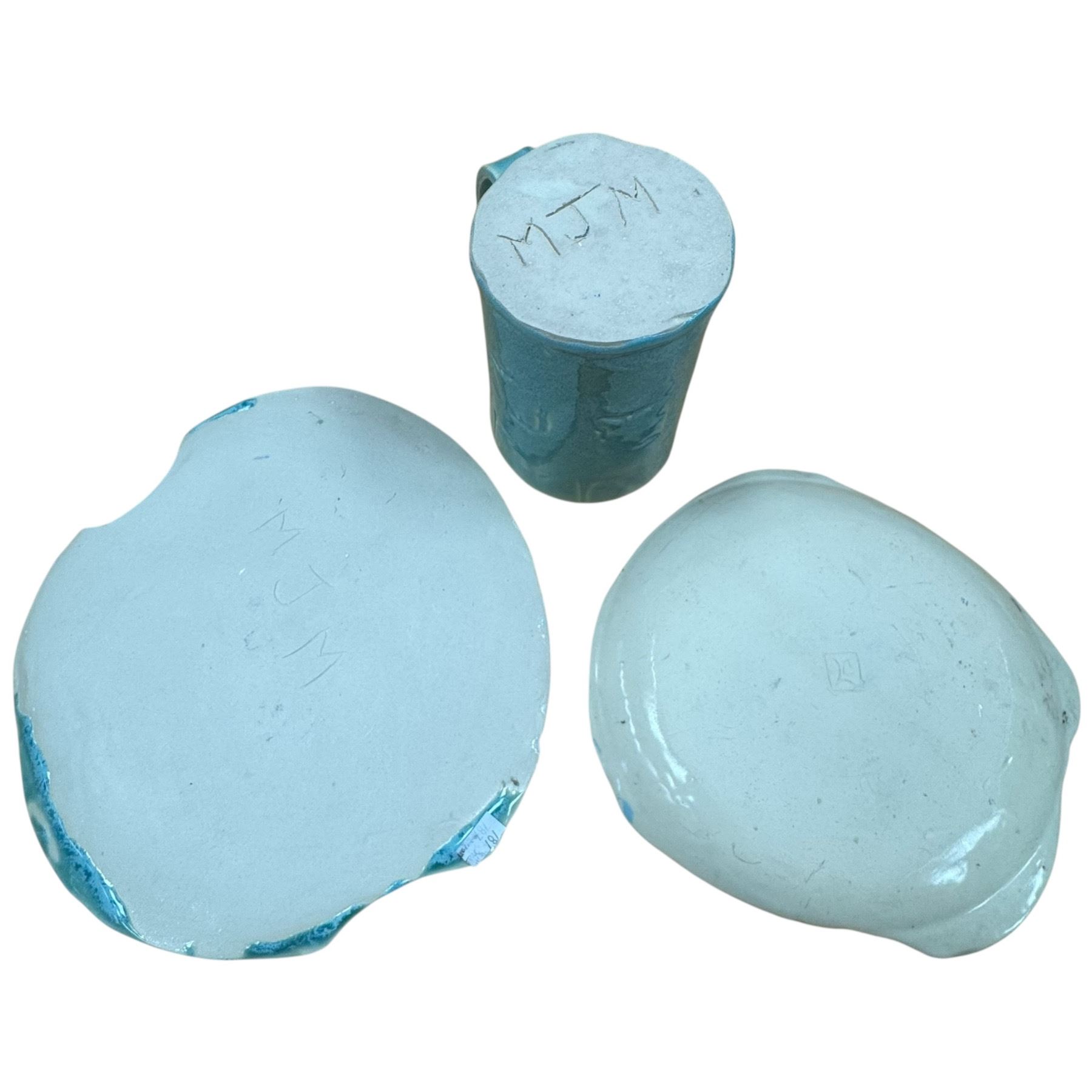 Trio of studio pottery pieces consisting of a signed jug and two plates. The jug is signed 'MJM' and 'LC' and stands 5-Inch tall. The plates are also signed 'MJM' and 'LC'. Handmade ceramic works featuring unique designs. Item is as pictured.