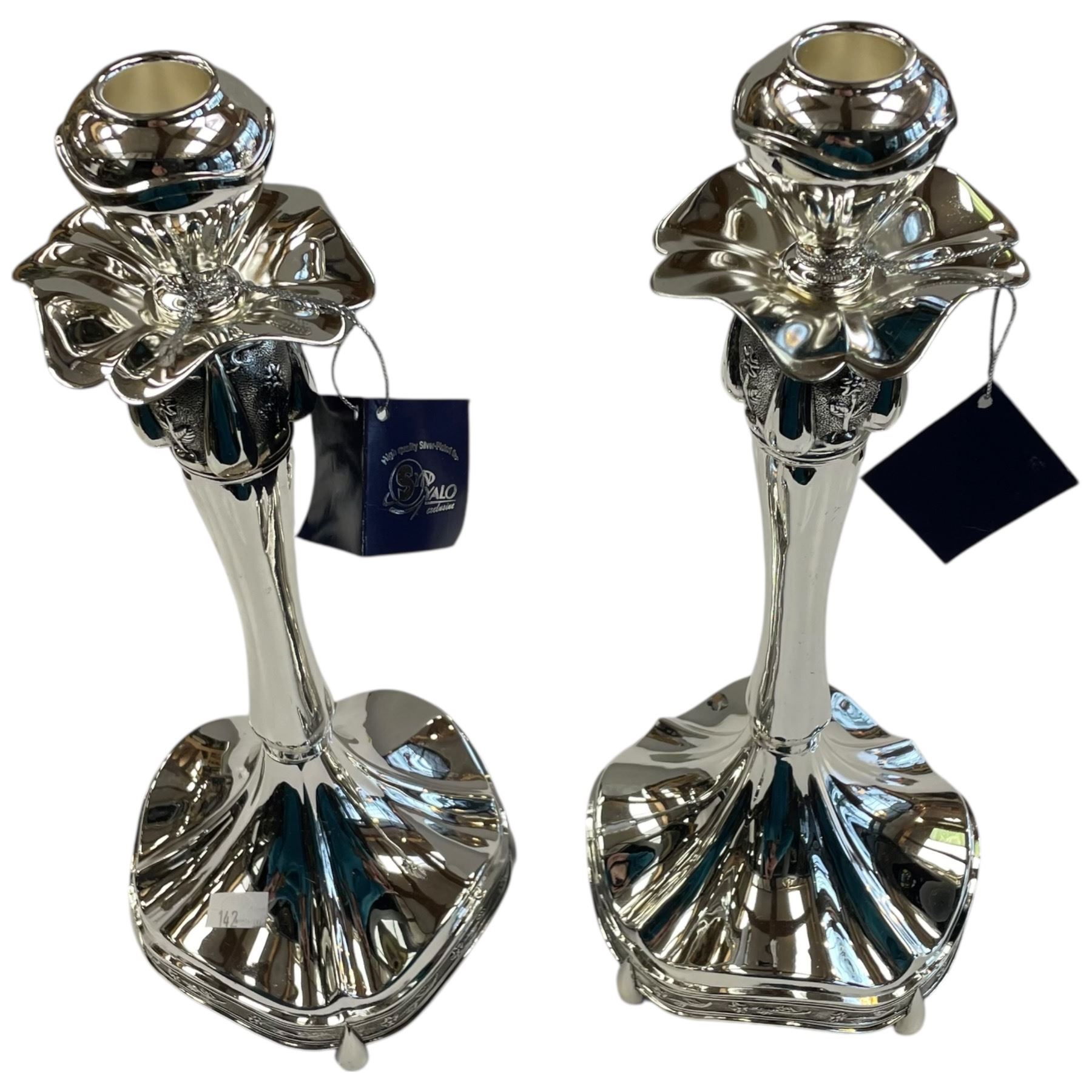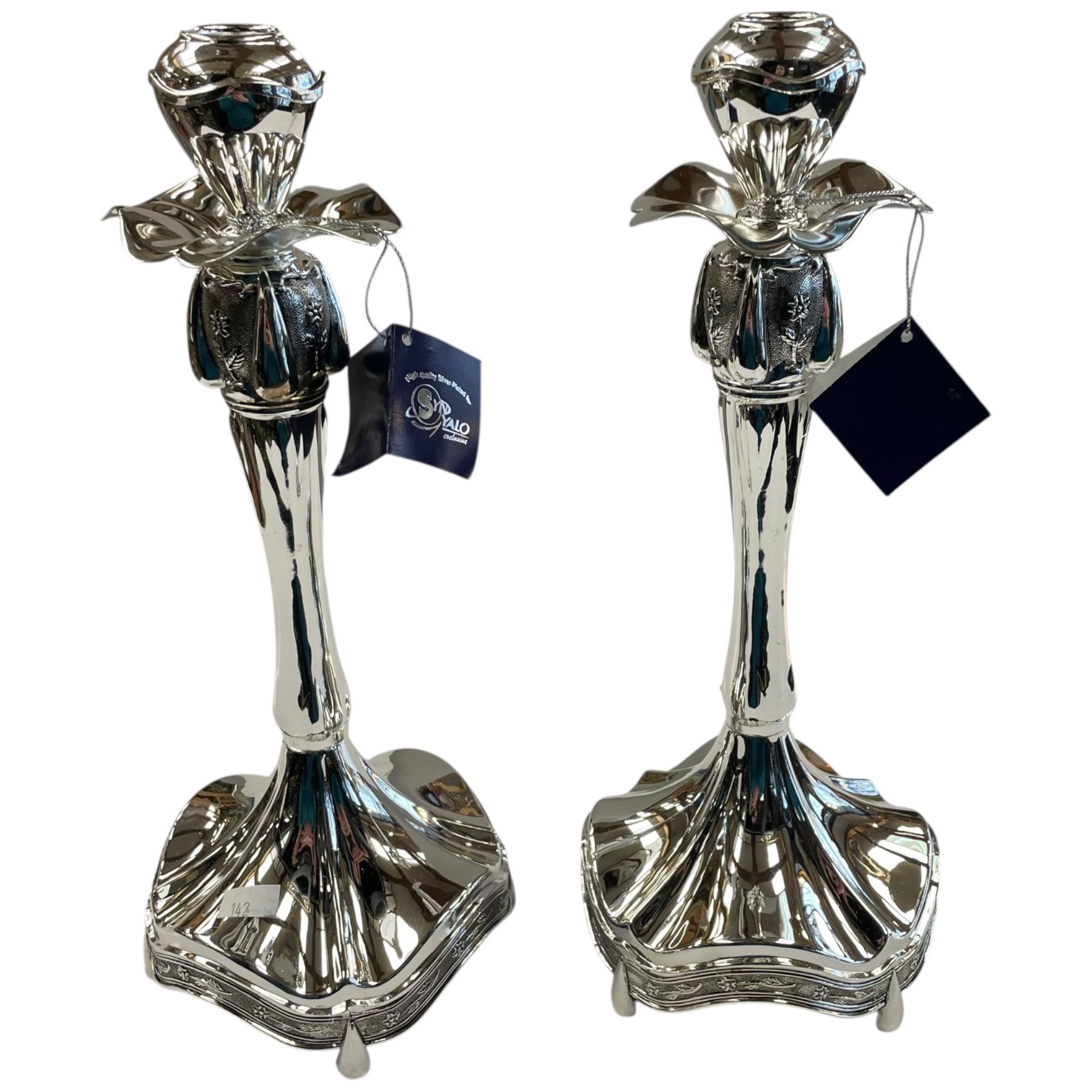 Pair of Syn Yalo silver-plated candlestick holders featuring ornate floral designs and wide, sturdy bases in Art Nouveau style. Brand new condition. Each holder stands 12.75-Inch tall with intricate detailing throughout, embodying classic Art Nouveau aesthetics. Item is as pictured.