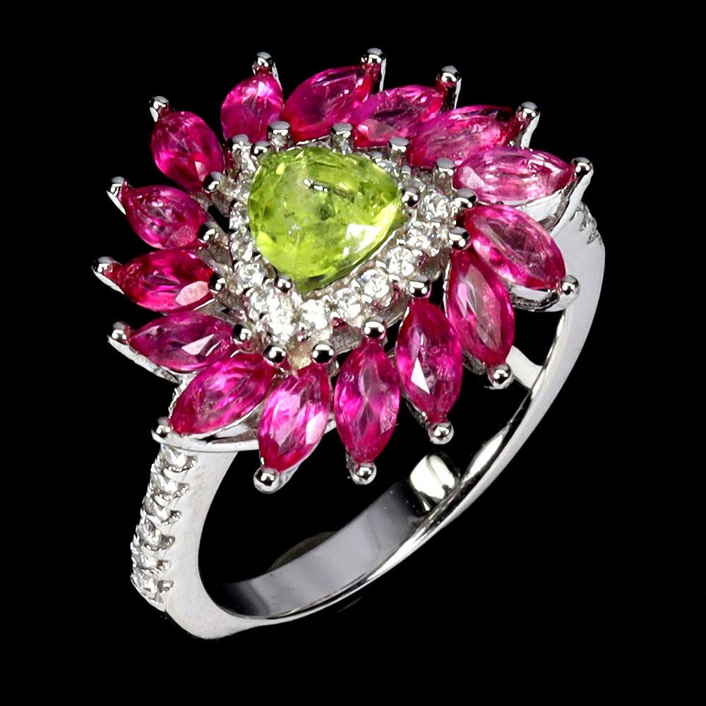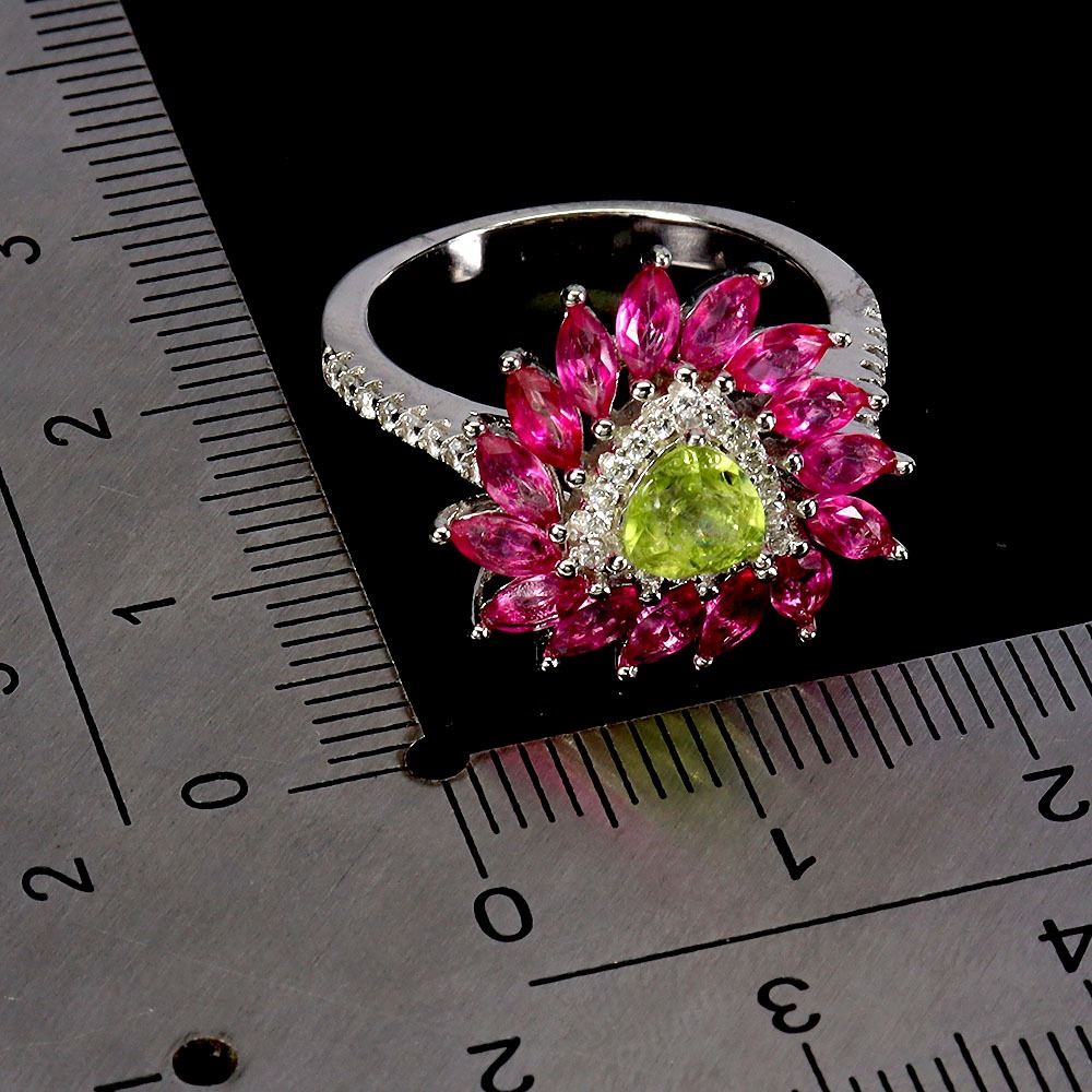 TRILLIANT CUT PERIDOT AND MARQUISE PINK TOPAZ RING IN 14K WHITE GOLD PLATED OVER 925 STERLING SILVER - SIZE 6.5 - APPRAISED REPLACEMENT VALUE CAD 760