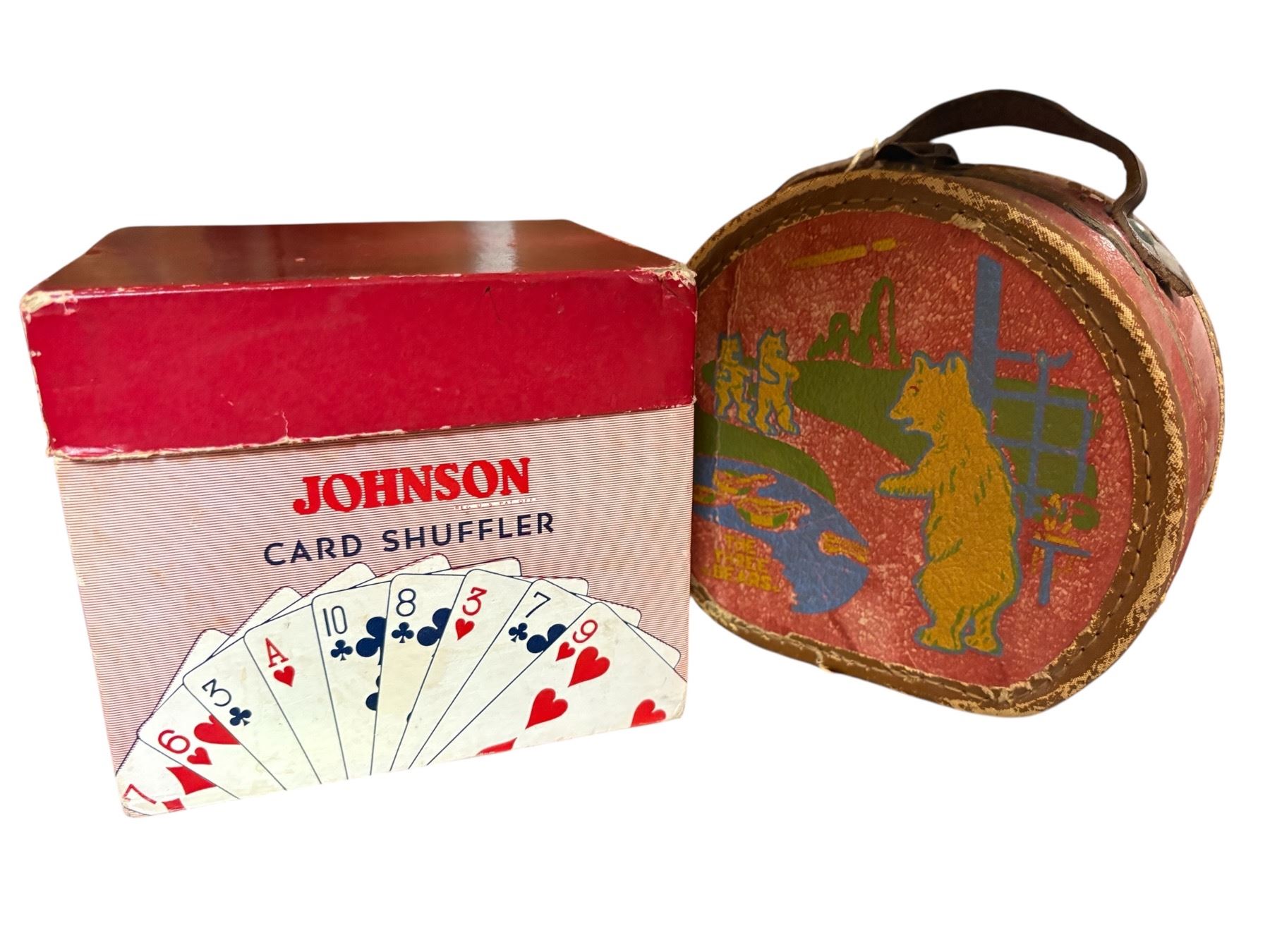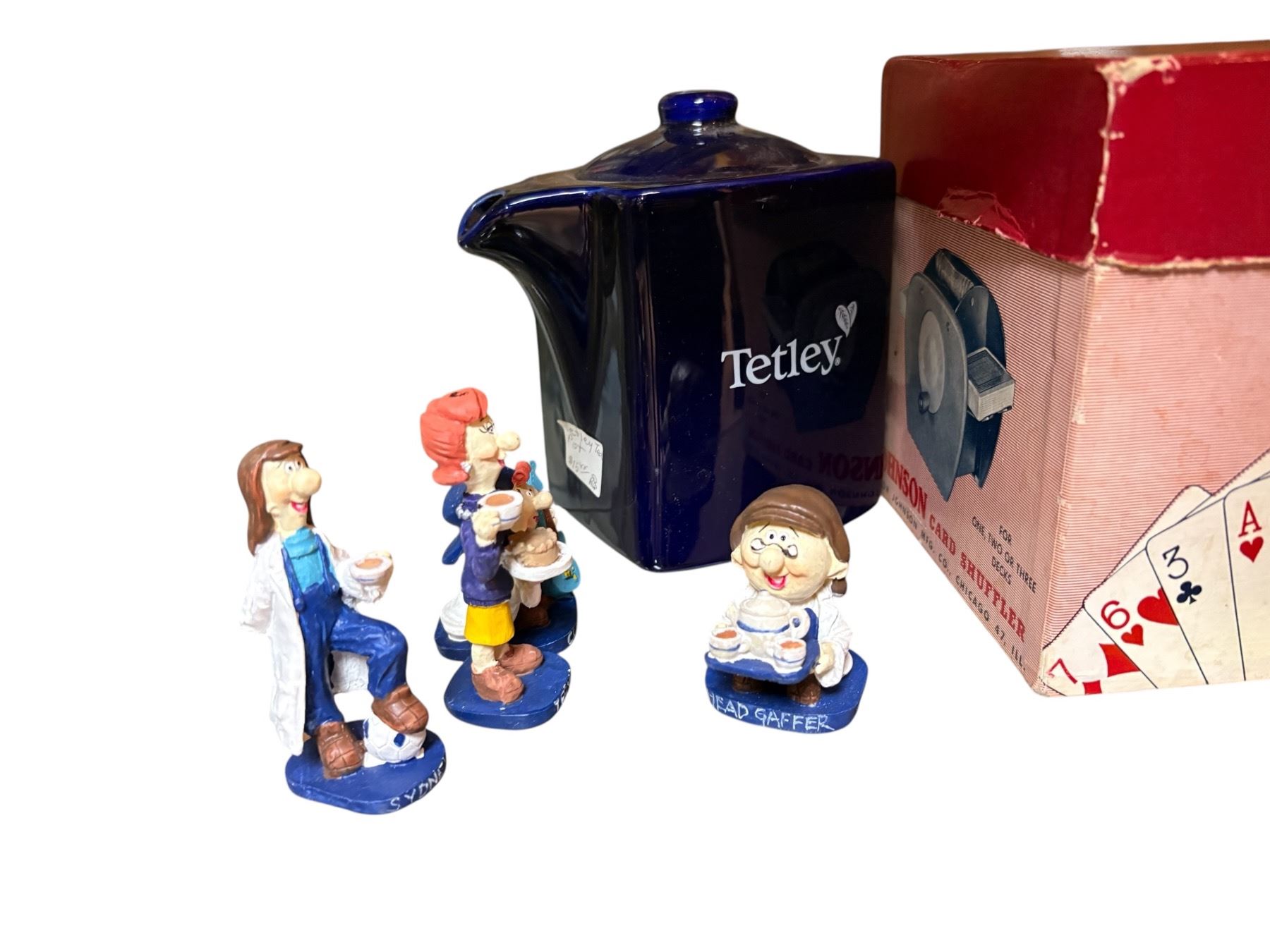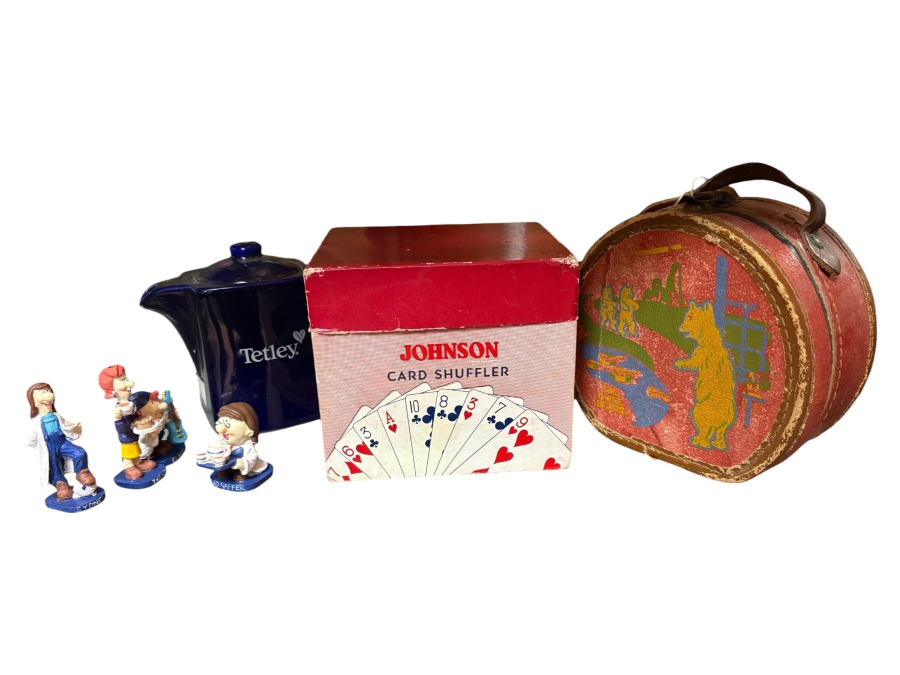Lot includes Tetley Tea ceramic figurines and teapot, a vintage Johnson card shuffler, and an antique small hard case bag featuring 'The Three Bears' motif. Mixed items representing collectible ceramics, a vintage gaming accessory, and a themed antique children's item.