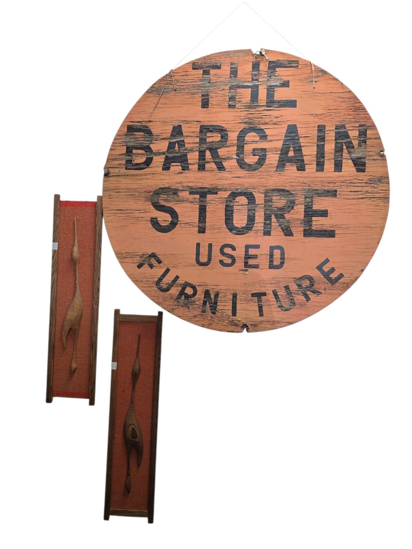 The Bargain Store Sign (Dia. 35") and 2 Cryptomeria Wall Hangings (H27" Each)