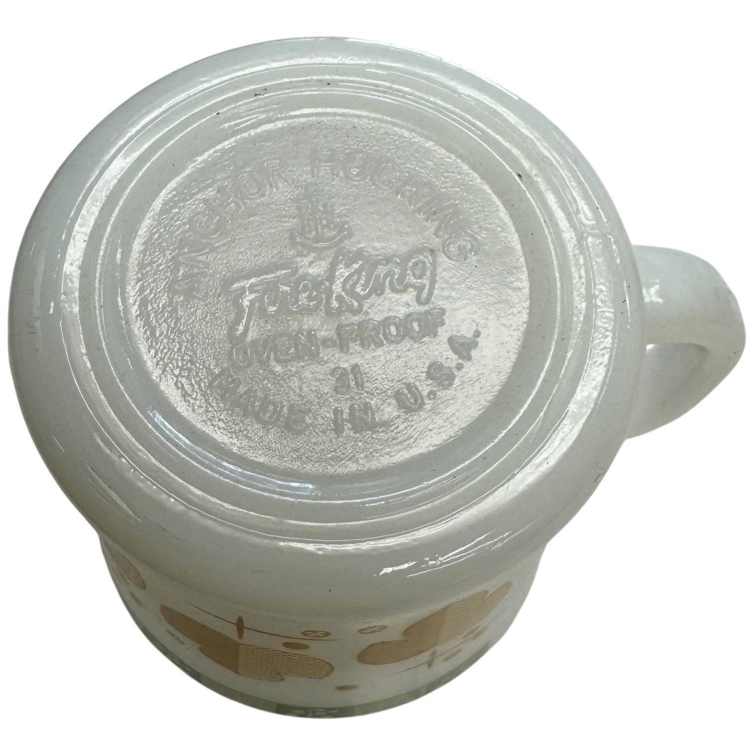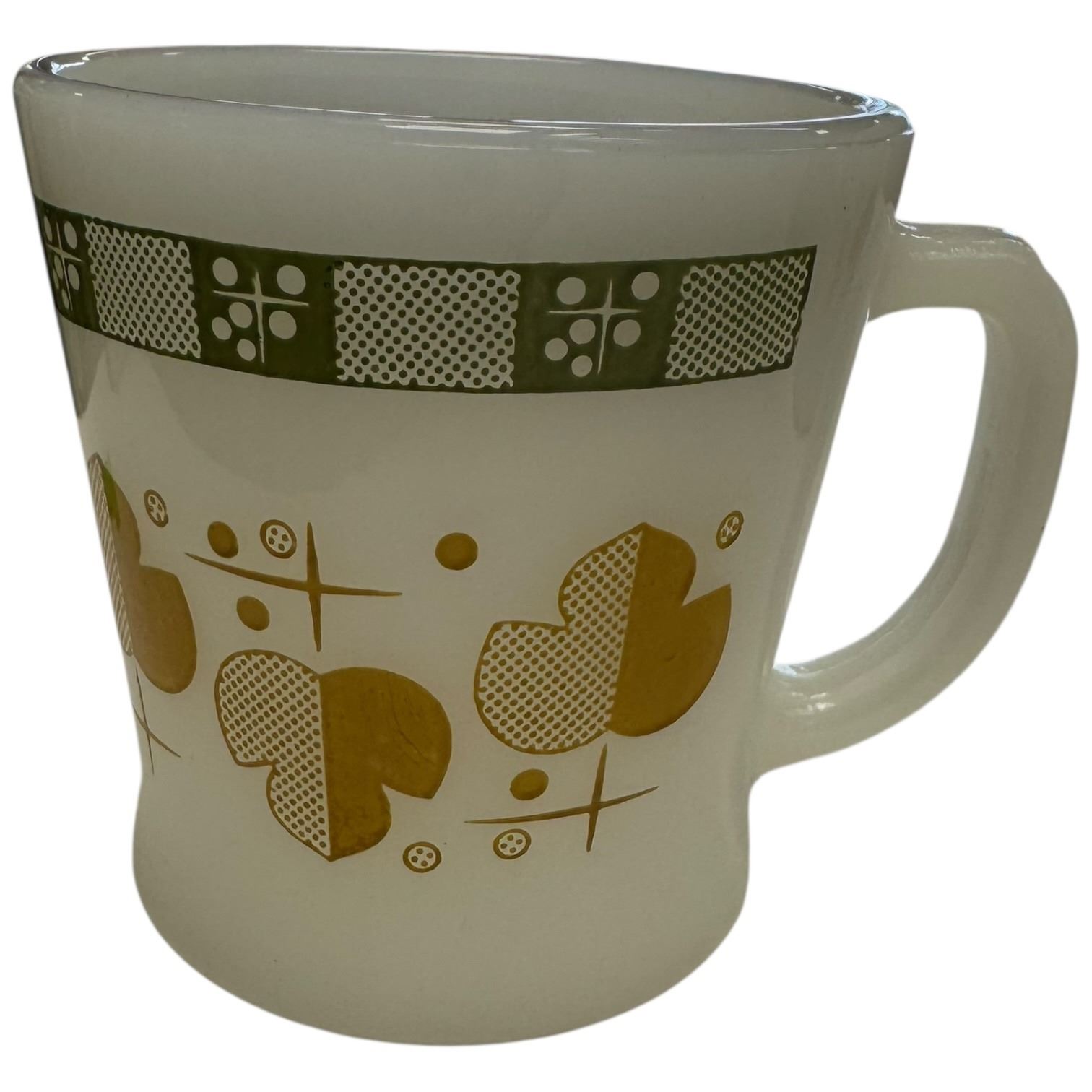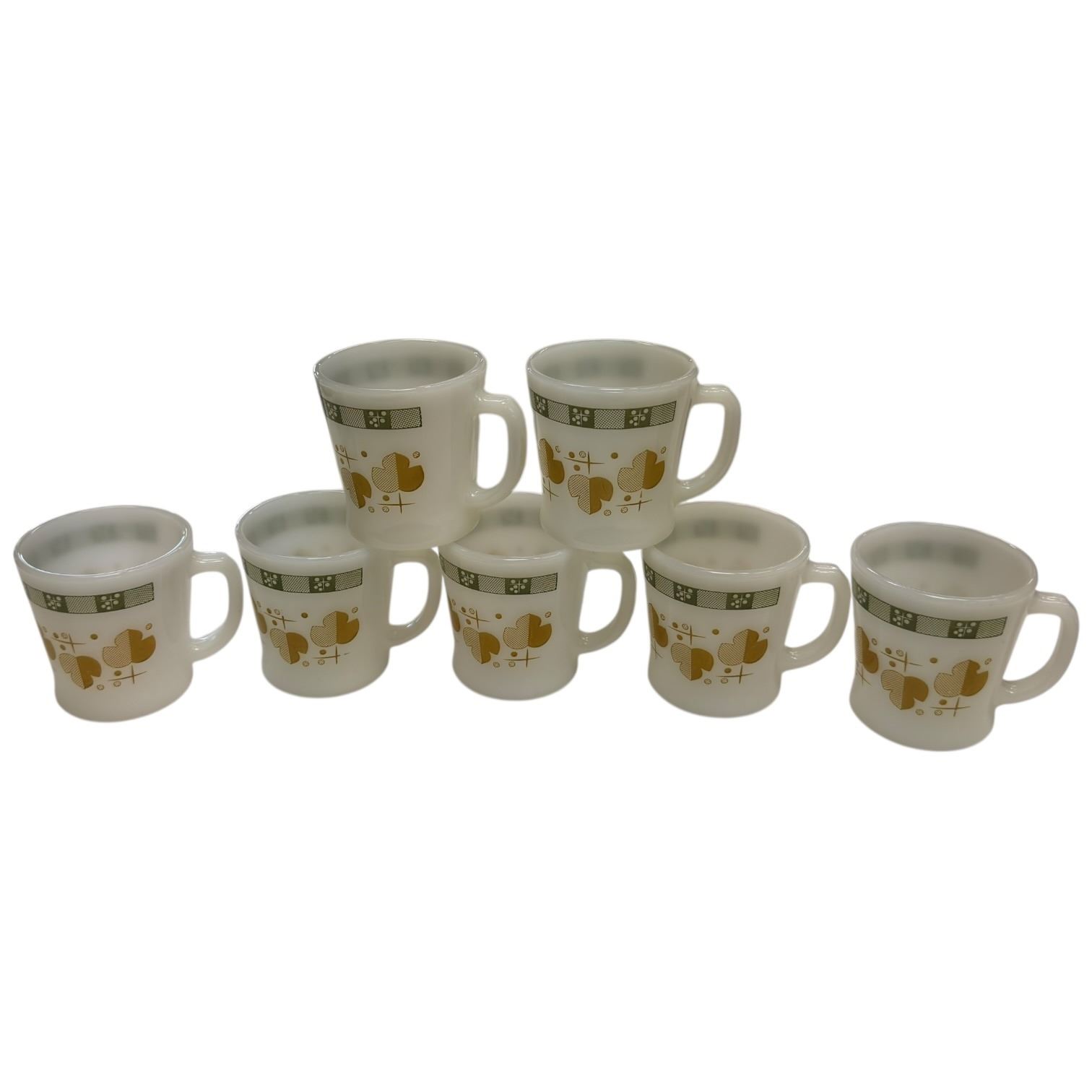 Set of six vintage Fire-King D-handle mugs in white milk glass by Anchor Hocking. Known as the 'Shamrock,' 'Atomic Leaf,' or 'Domino Atomic Shamrock' pattern, featuring green or yellow leaf motifs with a checkered band. Produced in the United States during the 1960s-1970s. Item is as pictured.
