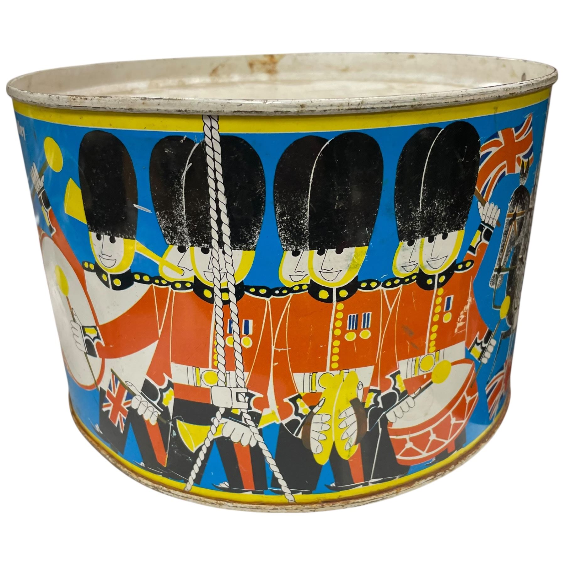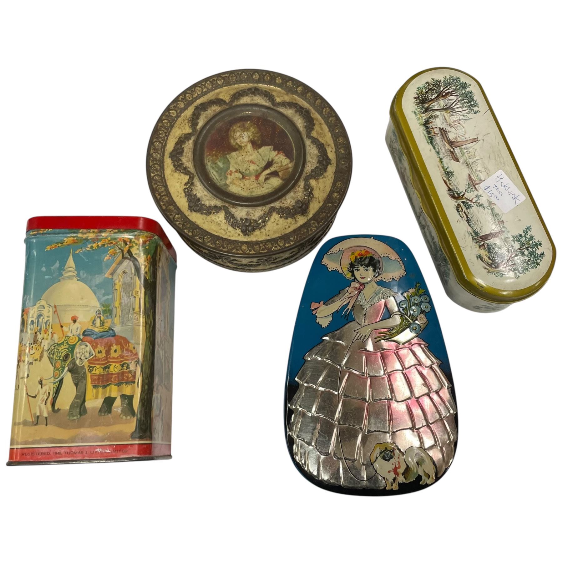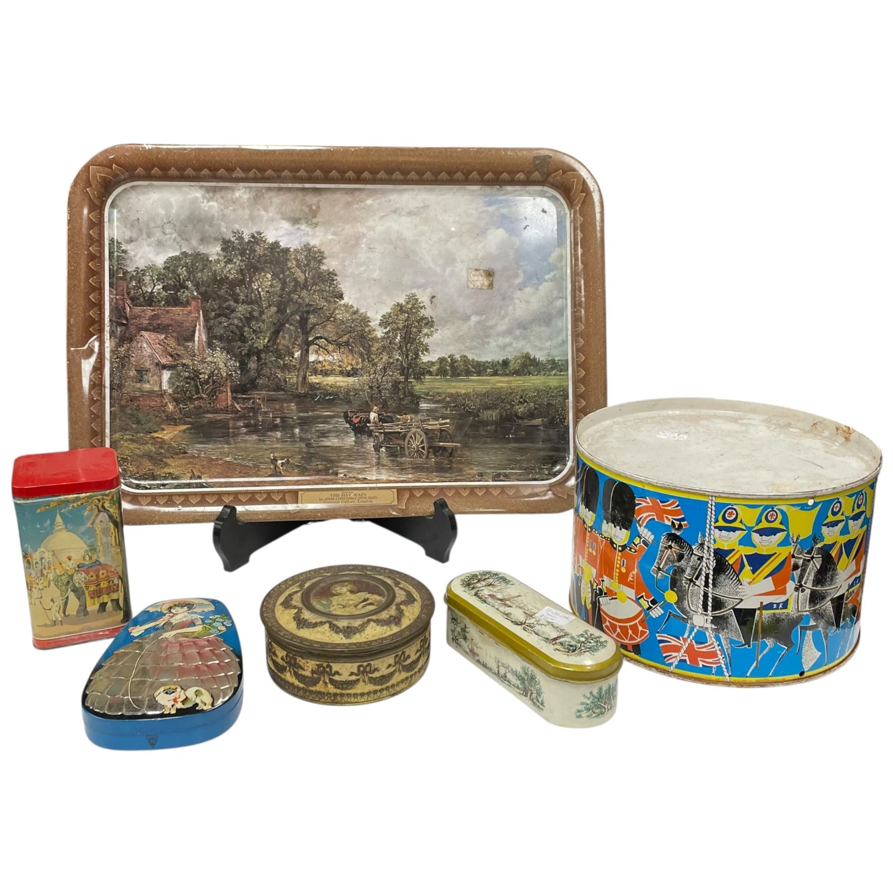 Collection of tin items including a decorative drum, various candy tins and tea tins, accompanied by a tin tray measuring 20x14-Inch. Items showcase assorted designs and themes. Item is as pictured.