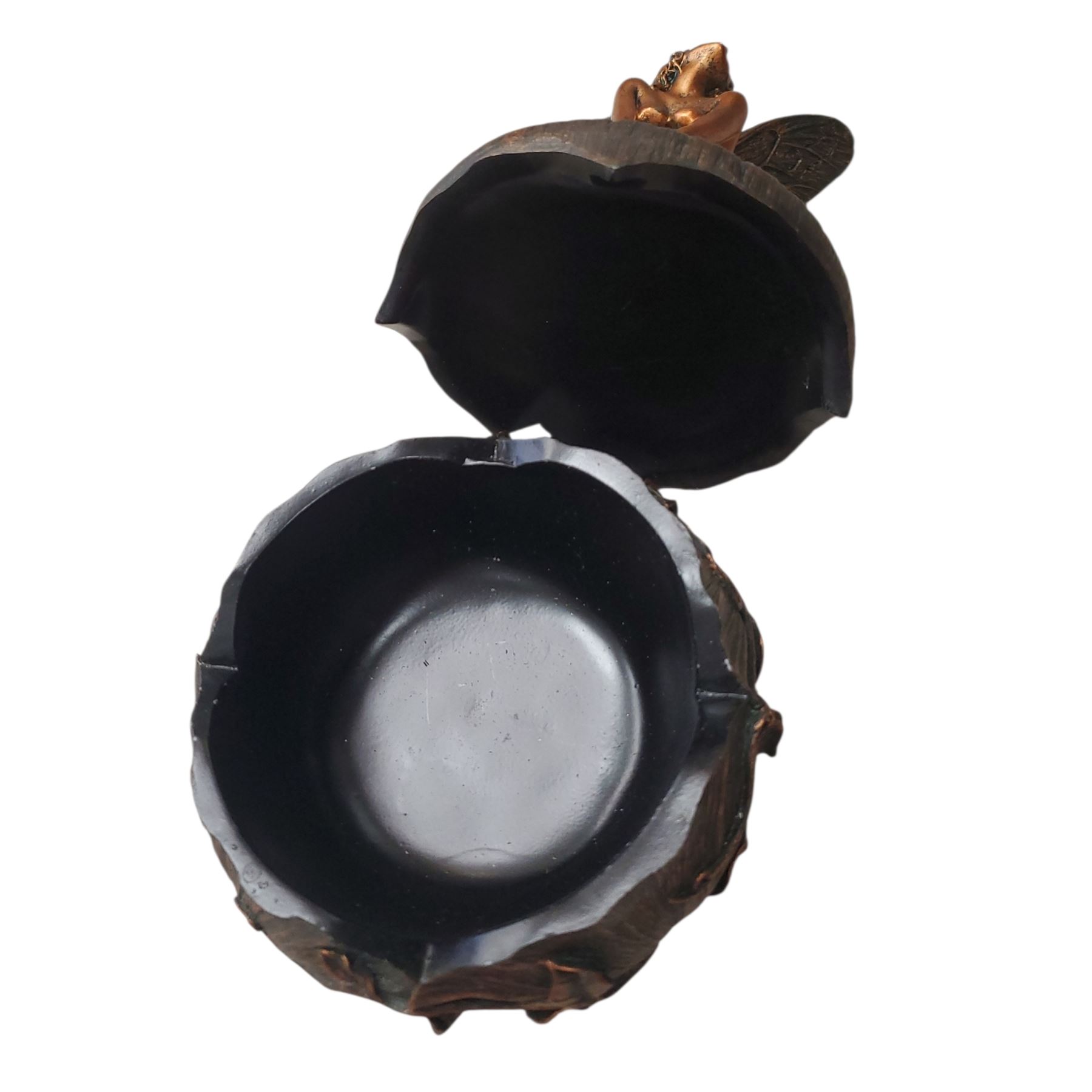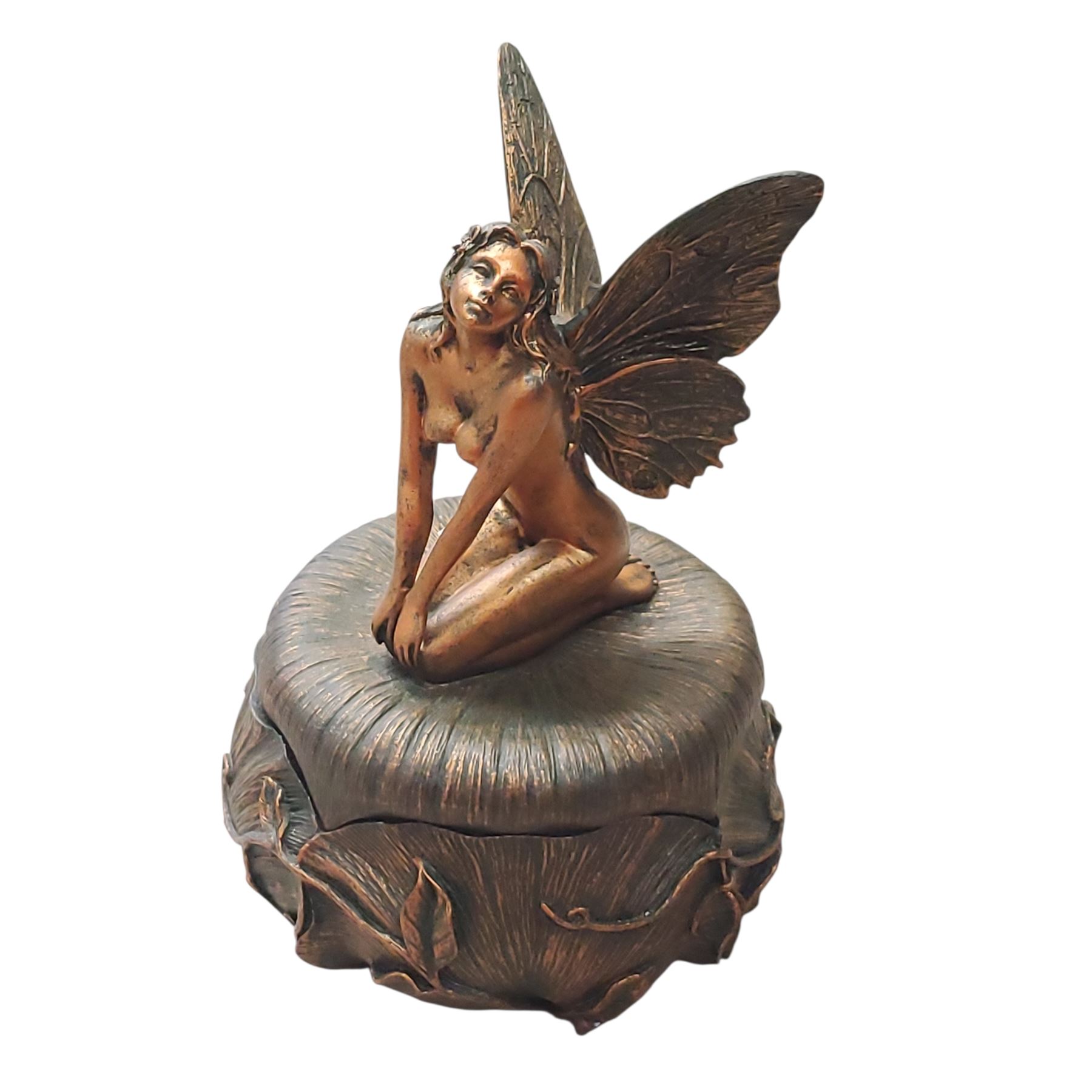 Top Collection lidded Fairy box, crafted from detailed resin. Stands 7 inches tall, featuring intricate fairy design with a removable lid. Multifunctional as both a decorative piece and storage. Exact production date or series not specified. Condition: Fair.