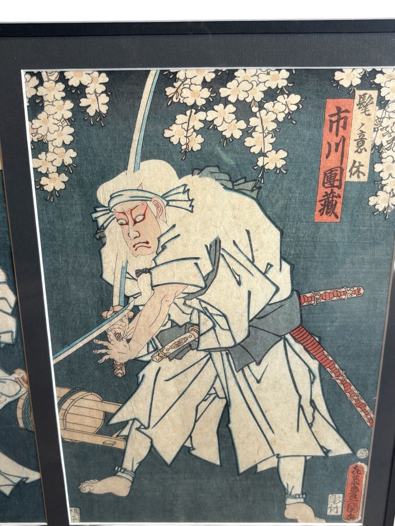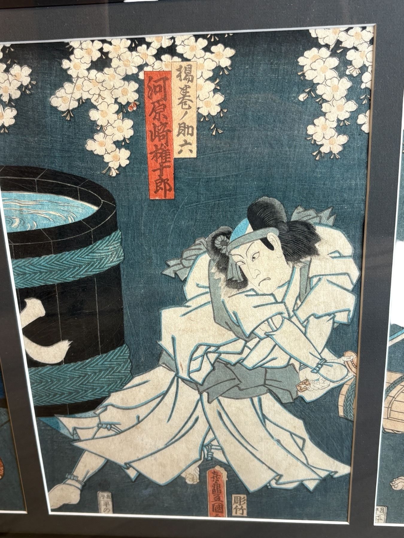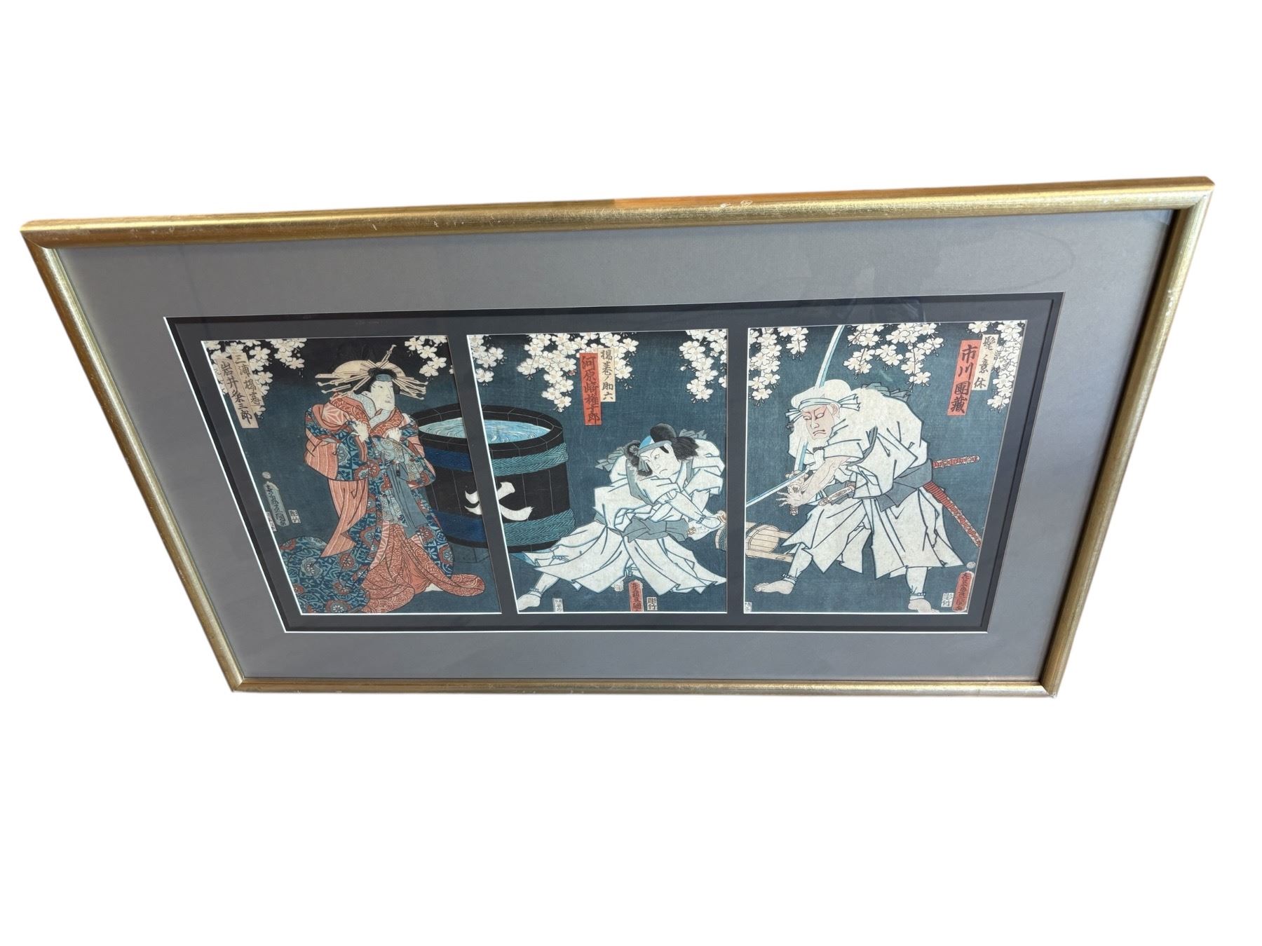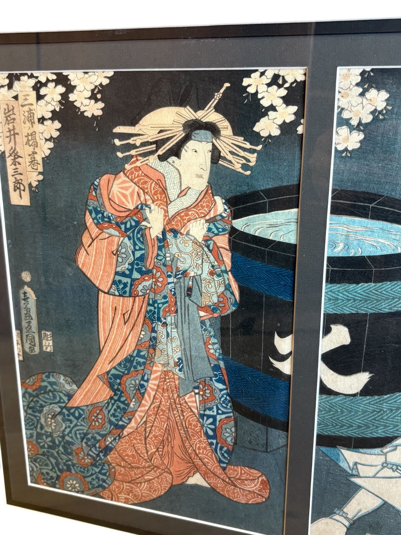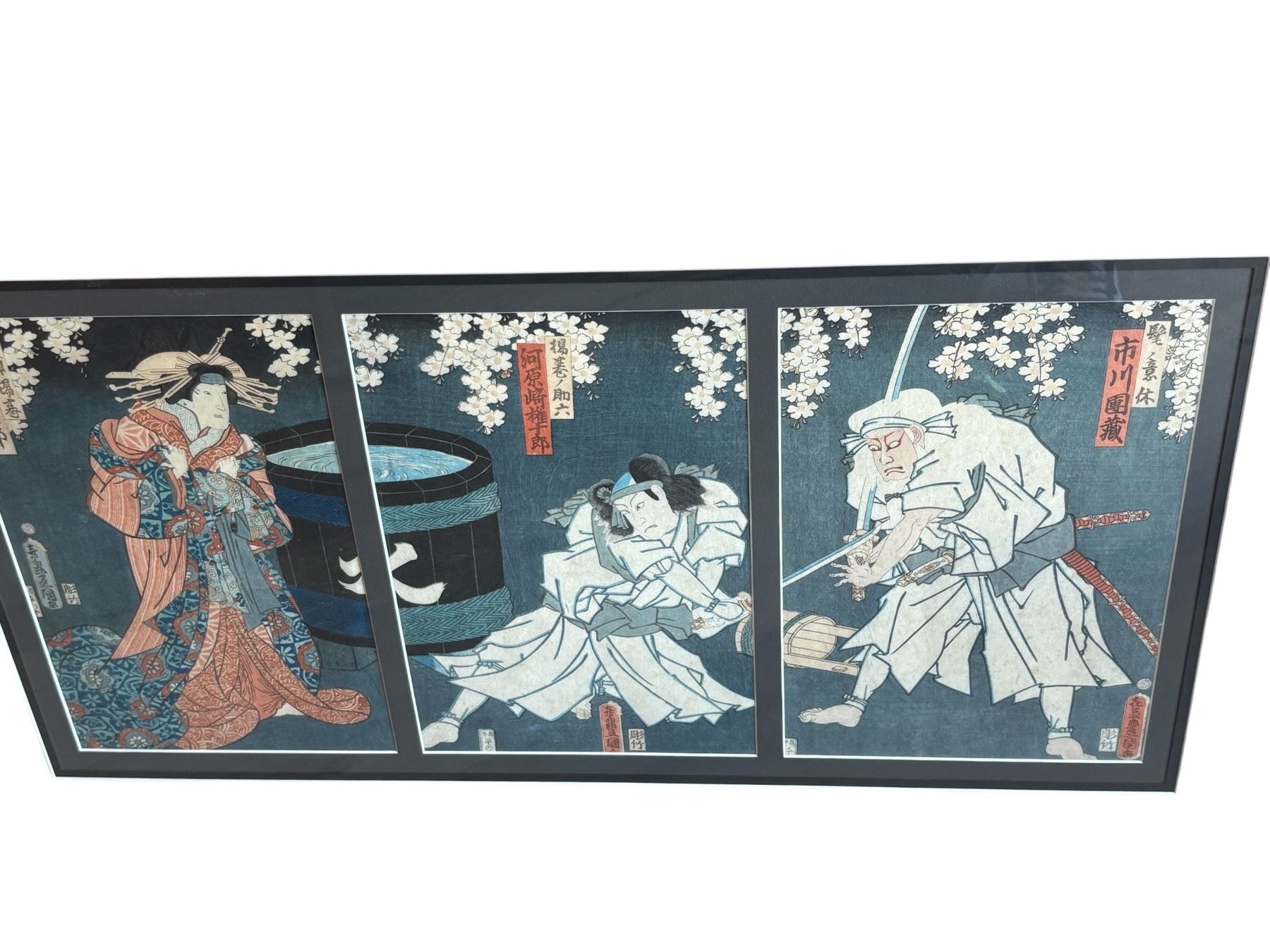 Reproduction of a Japanese woodblock print triptych by Toshusai Sharaku. Overall dimensions measure 36x22 inches. Features traditional ukiyo-e style, known for its detailed and expressive artistic representation. Item is as pictured.