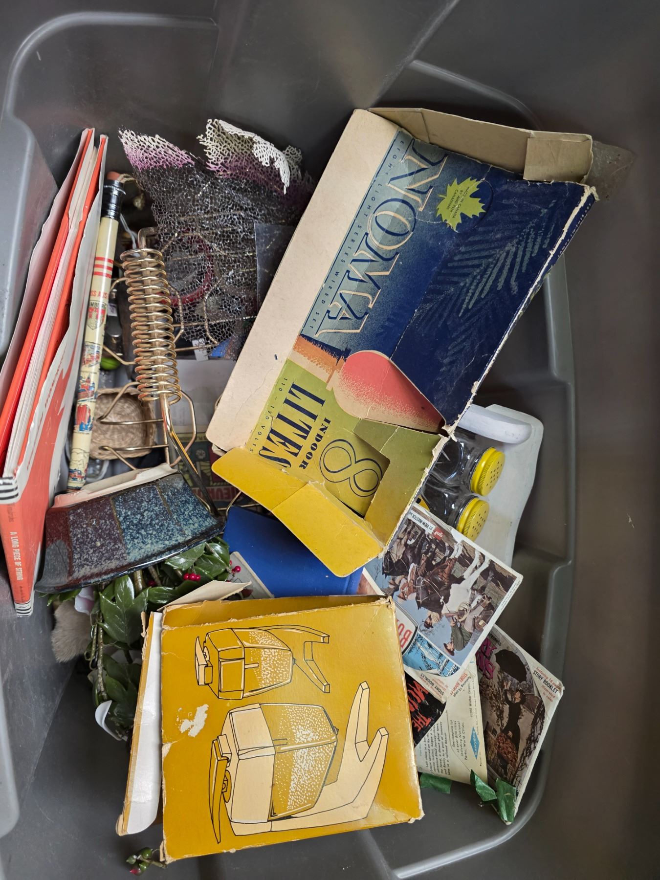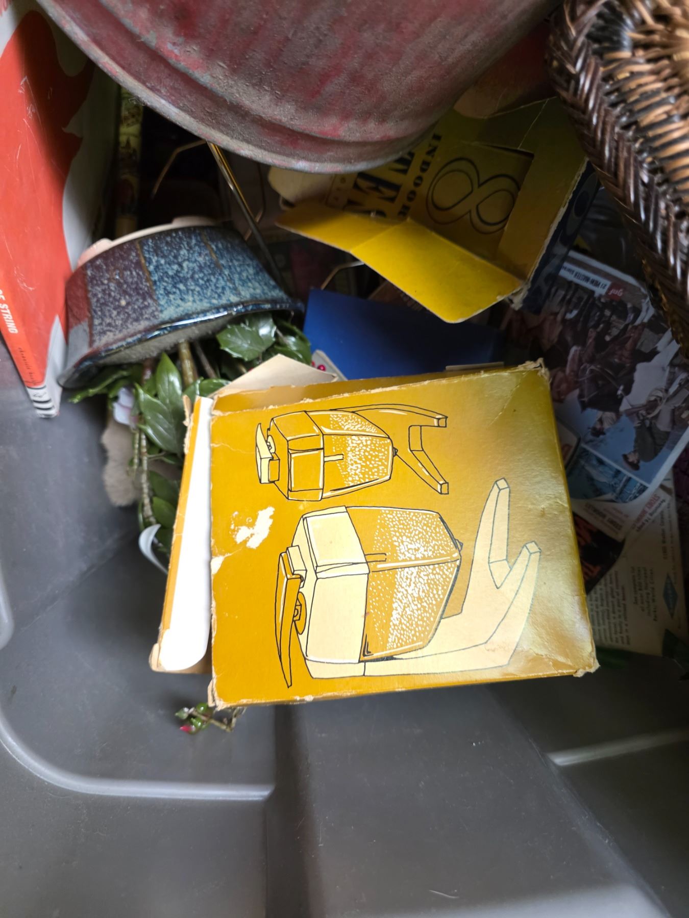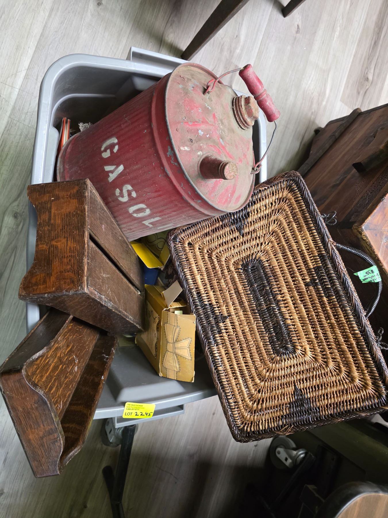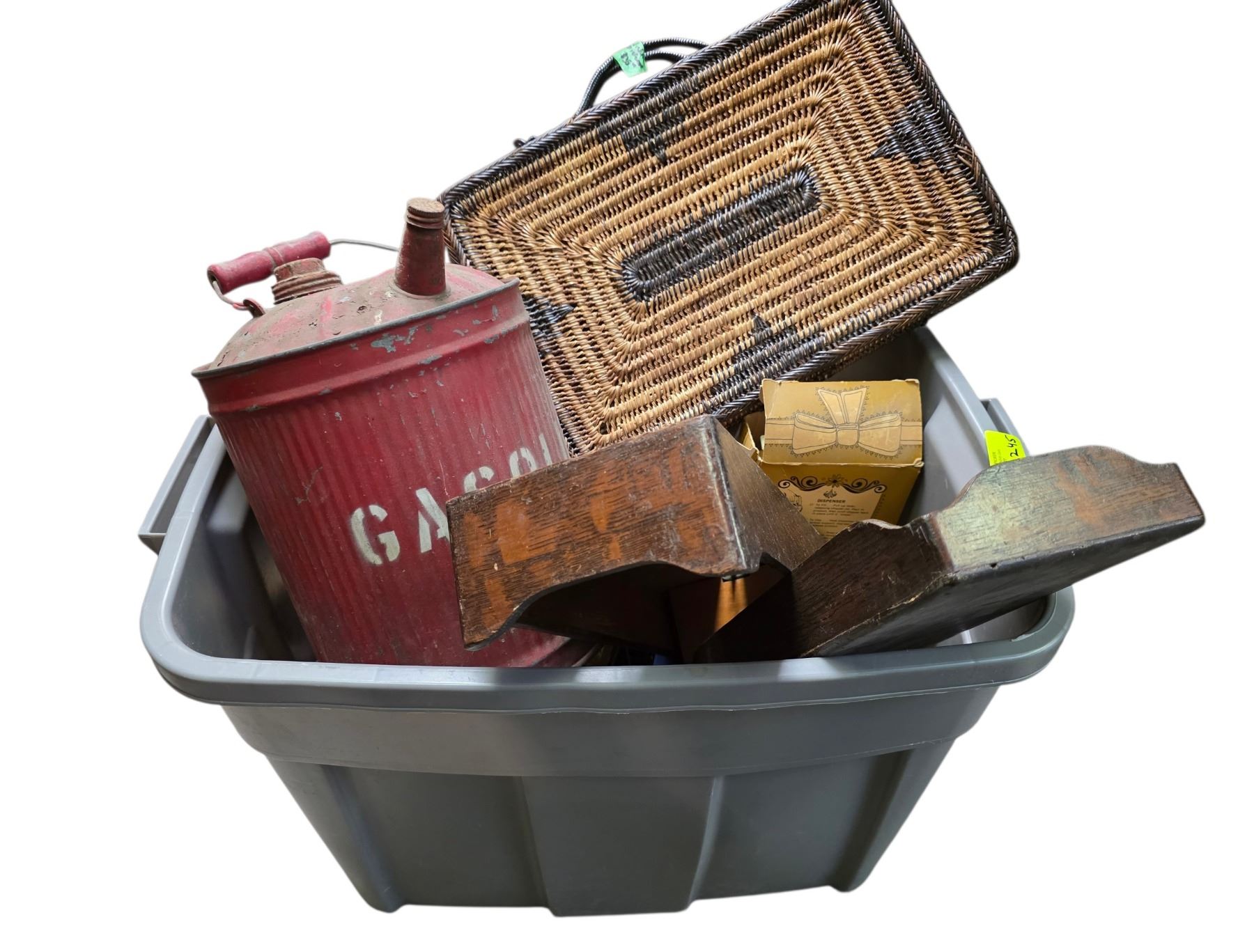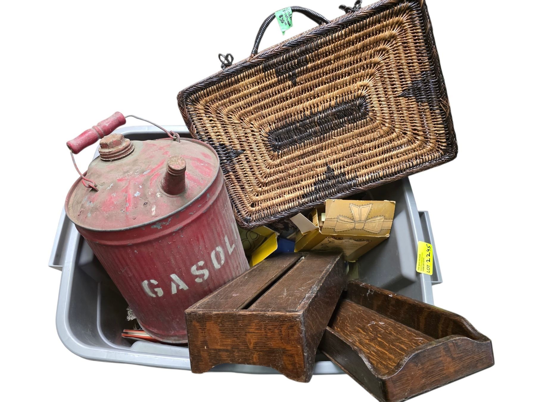 Tote of Vintage Oak Index File, Wicker Purse, Vintage Gas Can, Oil Lantern & more