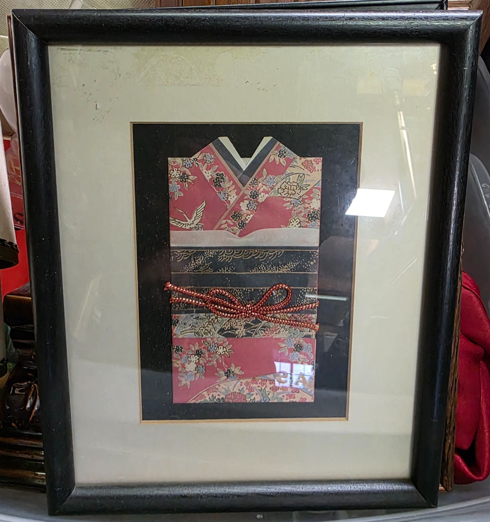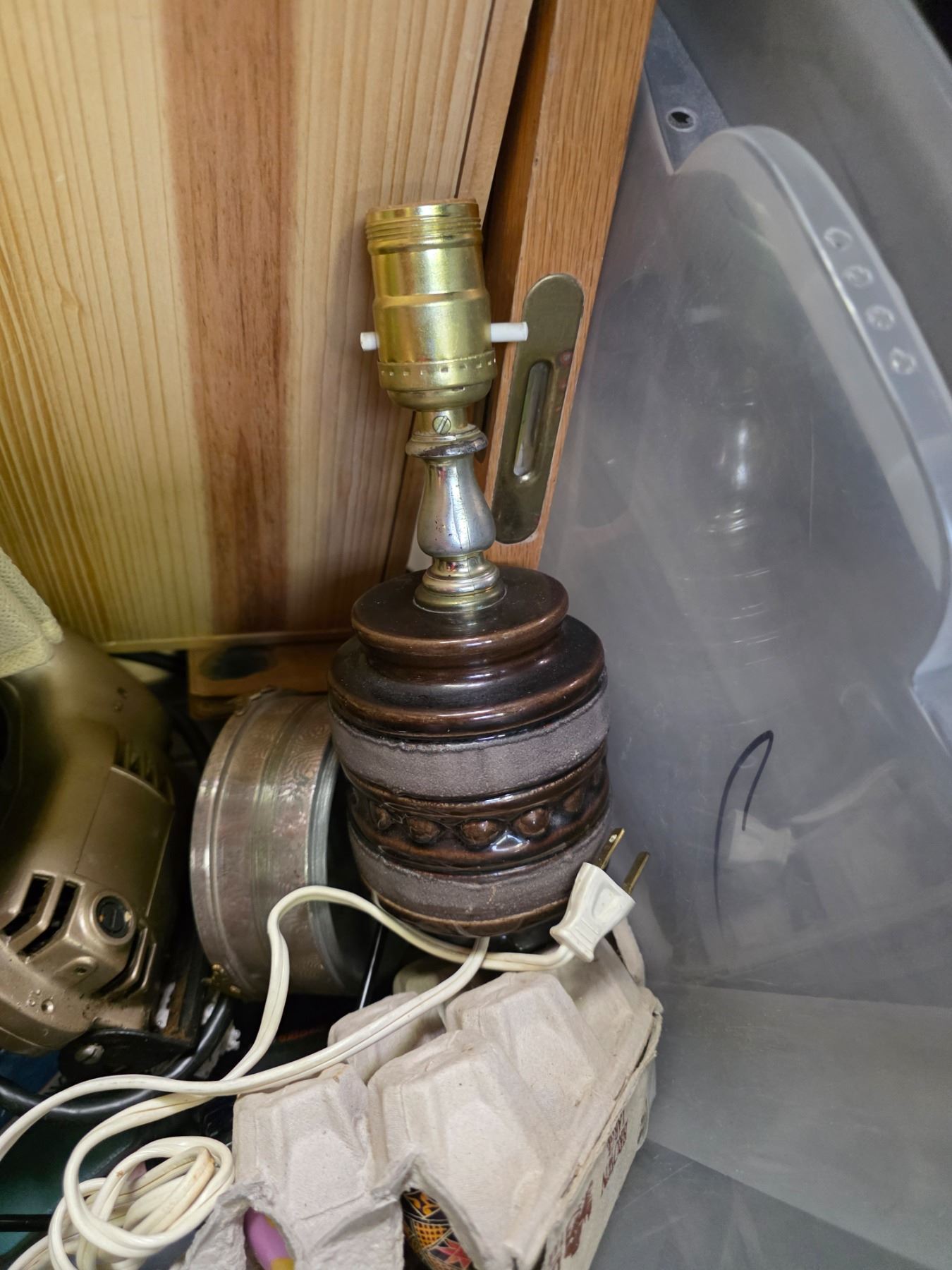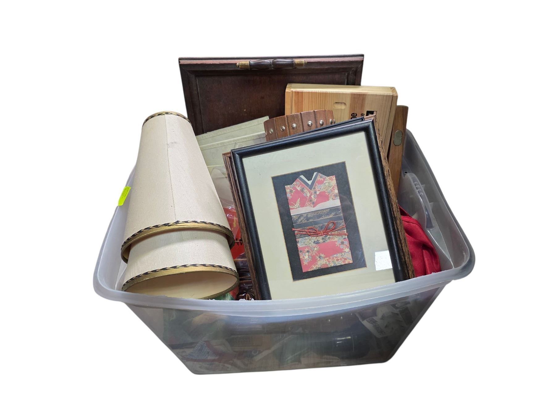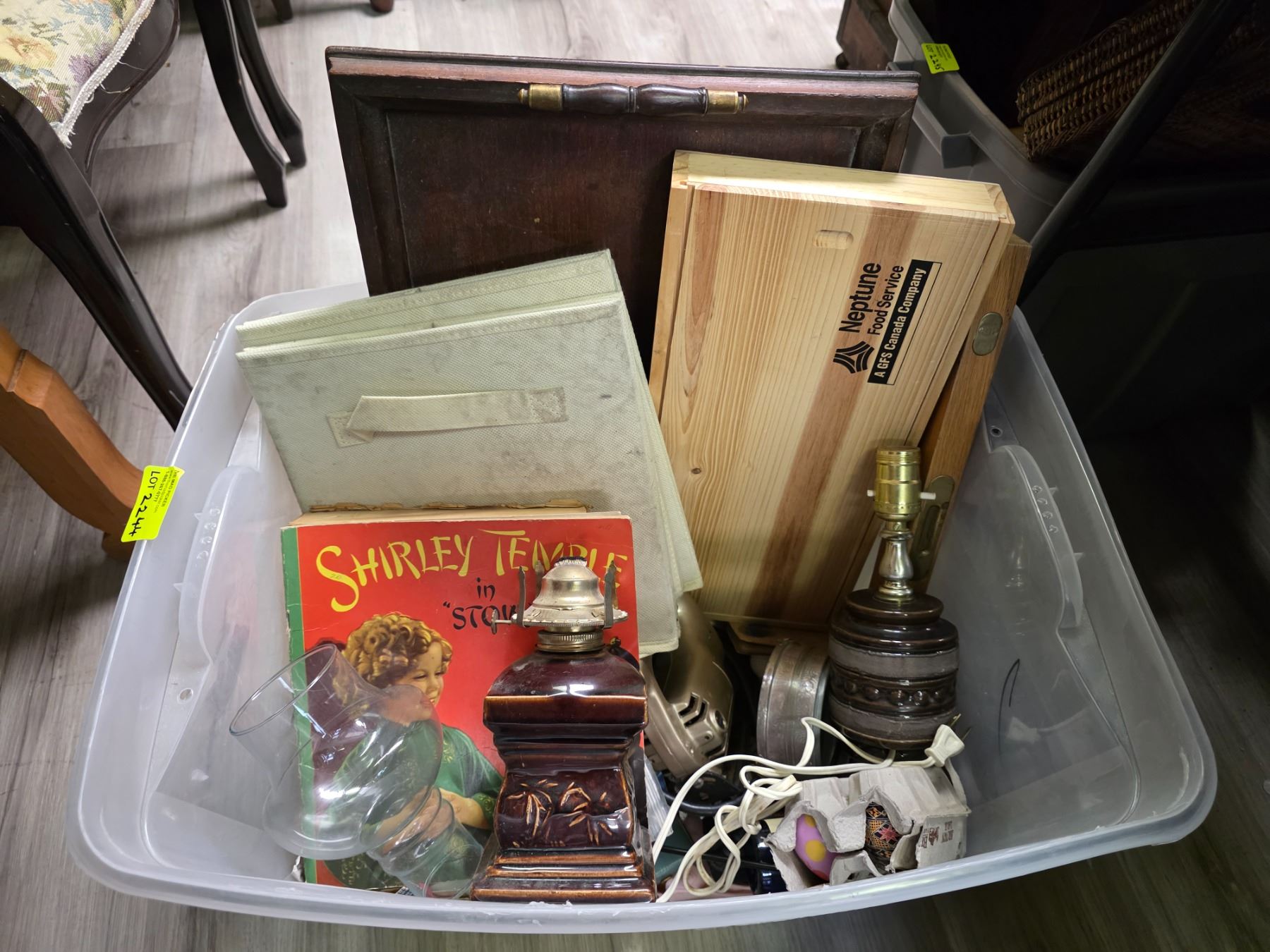 Tote of Wall Art, Lamp Shades, Vintage Wood Tray, Oil Lantern and more