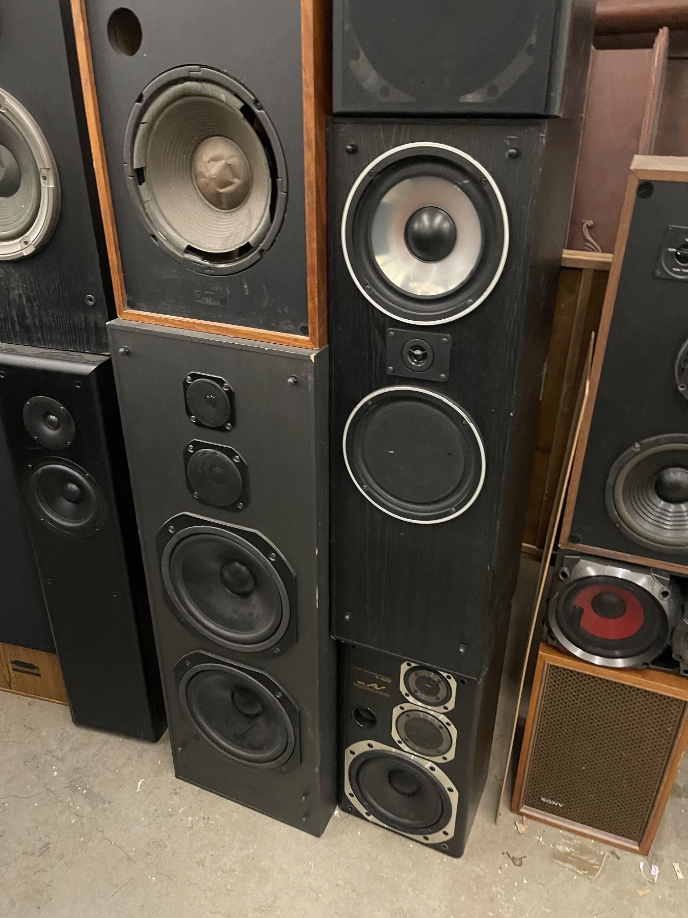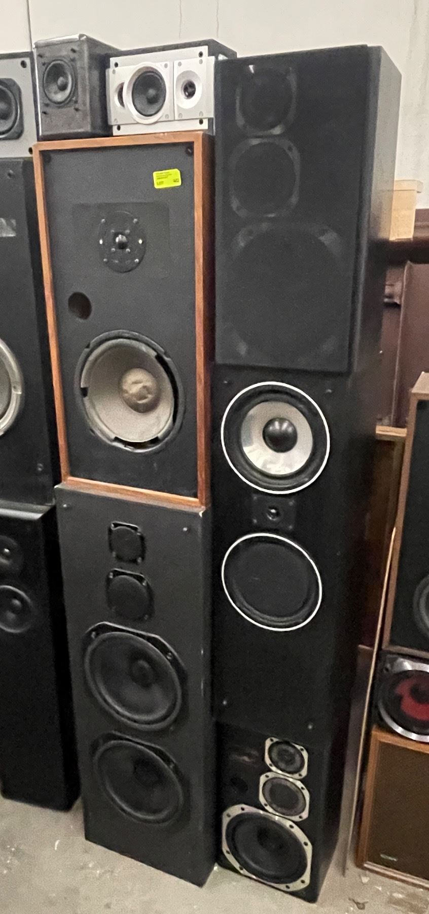 Tower of Assorted Speakers Bolted Together