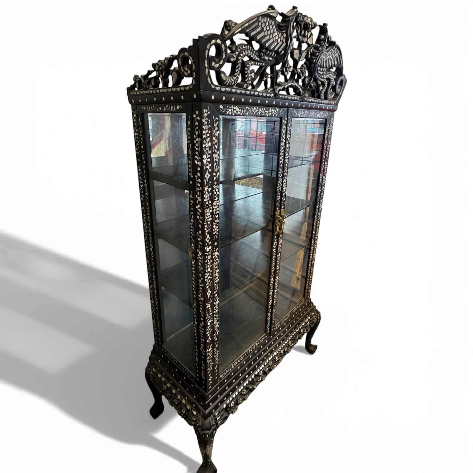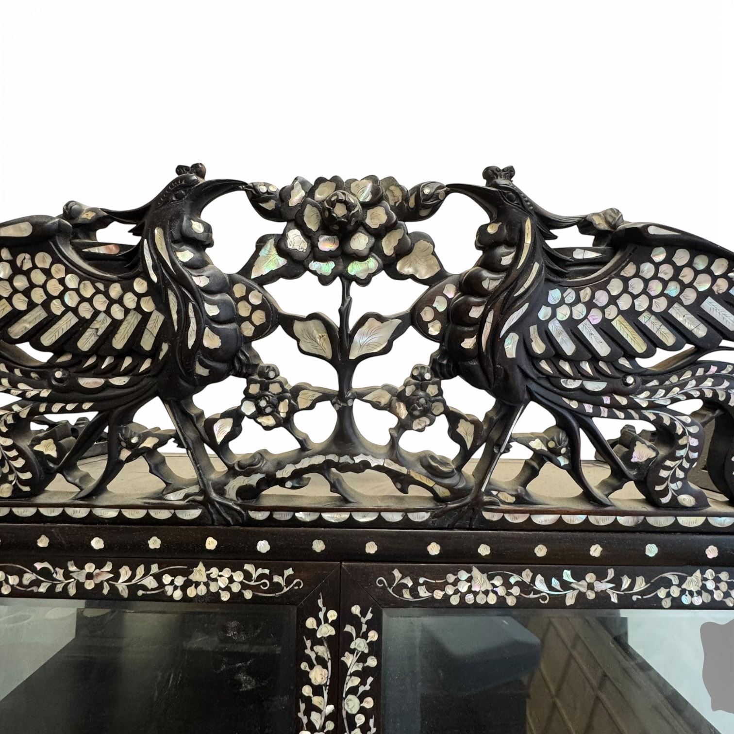 Traditional Chinese Display Cabinet with Intricate Mother-of-Pearl Inlay - Phoenix and Floral Top, Glass Doors and Sides (20" x 48" x 80" tall)
