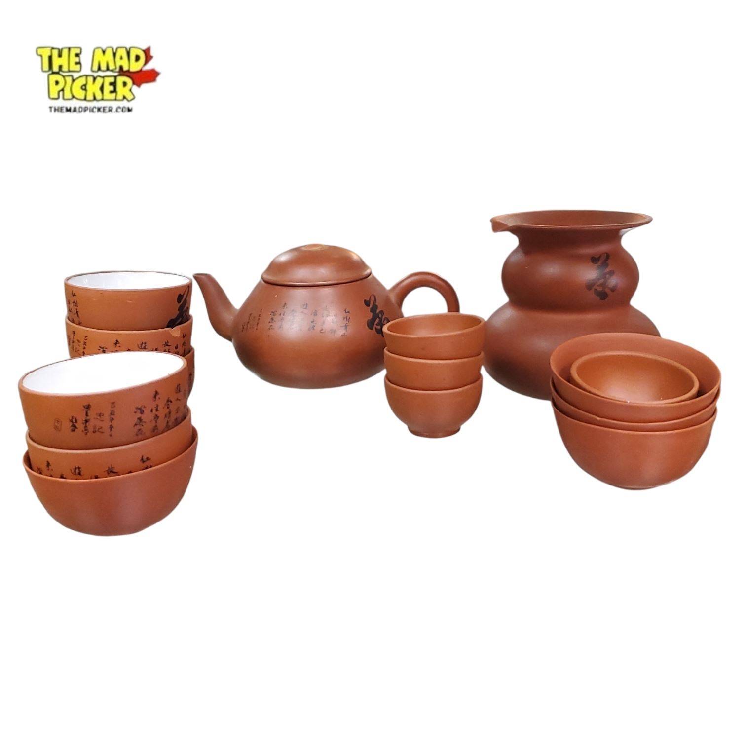 Traditional Yixing Zisha clay tea set, featuring handmade teapot and accompanying cups. Crafted with porous clay known for enhancing tea flavor, likely designed for Gong Fu Cha tea ceremony. Zisha pottery is renowned for its use in traditional Chinese tea culture.