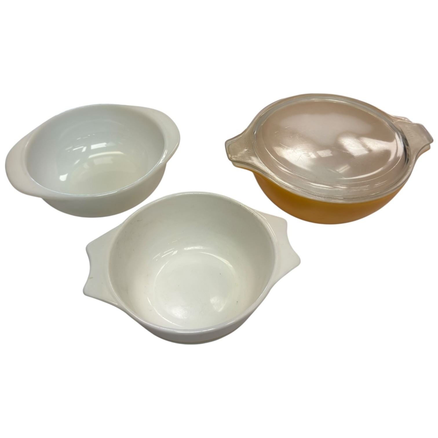 Set of three Pyrex bakeware pieces including a Zoom bowl measuring 6.5-Inch, white Pyrex Model 022, and Pyrex Model 422 with lid. Made of durable tempered glass, these items are designed for baking and food storage use. Item is as pictured. No chips