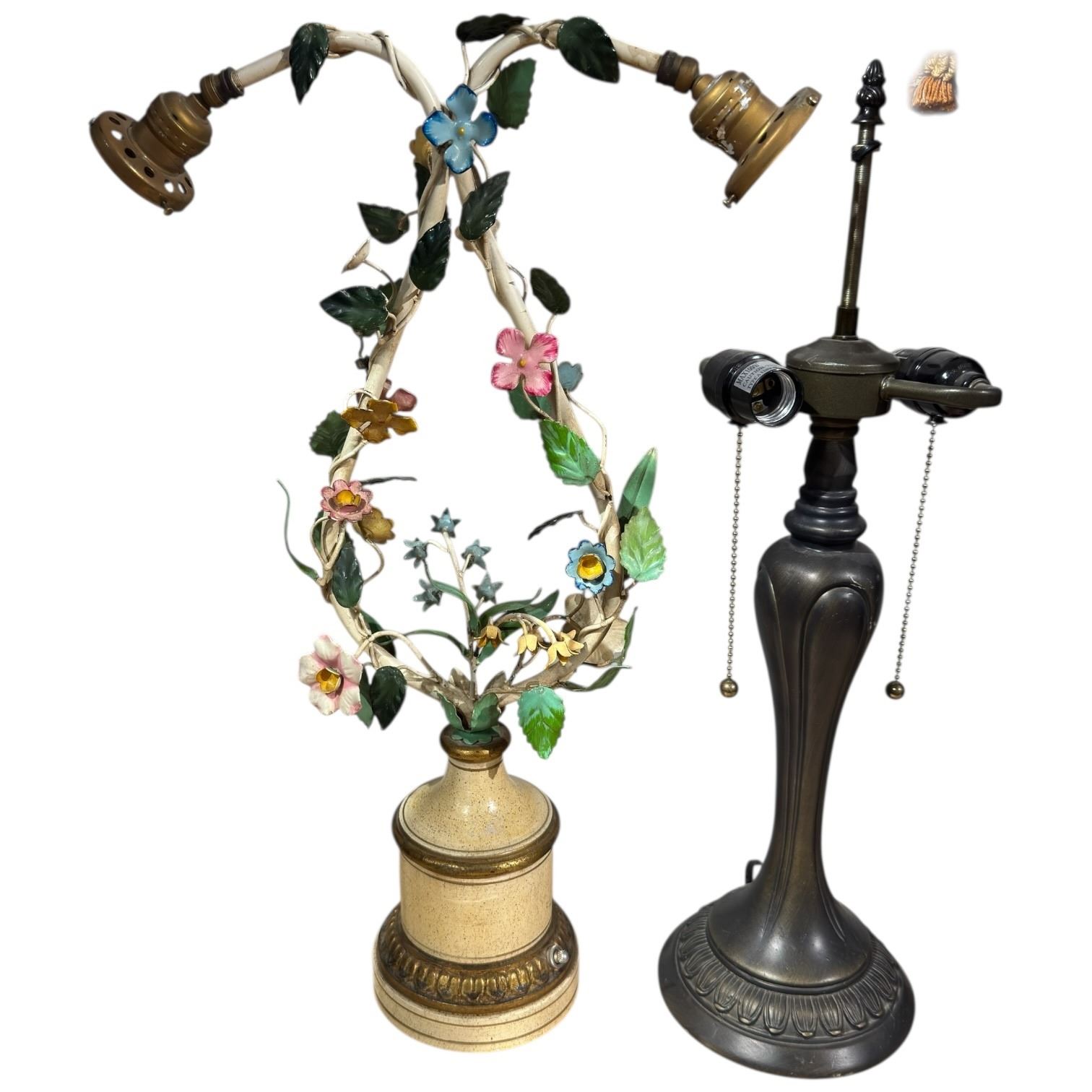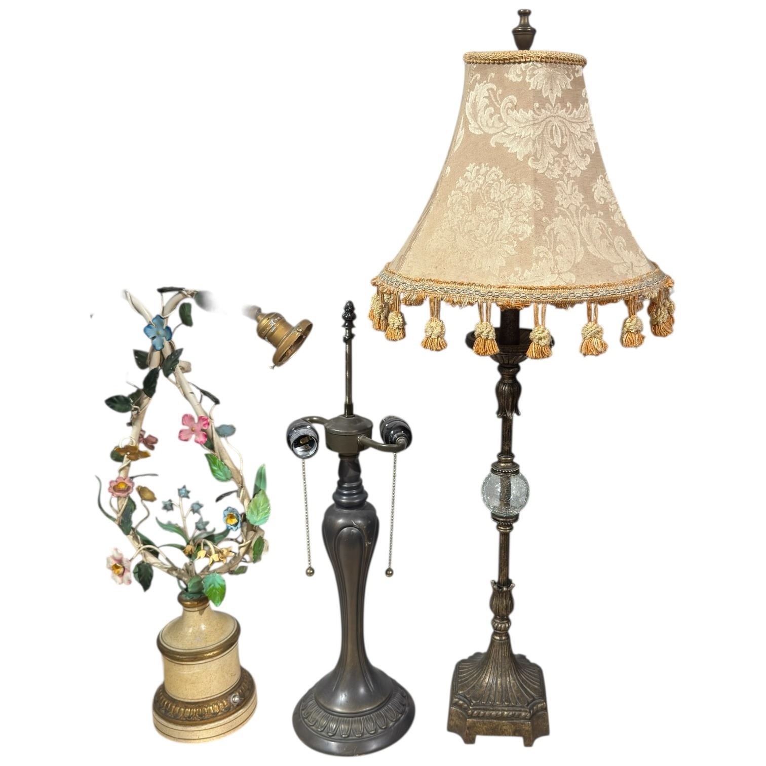 This trio of lamps includes an Italian tole lamp featuring a floral wreath design, a double socket bronze & brass lamp with a crystal ball accent, and a lamp with a tasseled shade. The tallest lamp in the set measures 35-Inch. Item is as pictured.