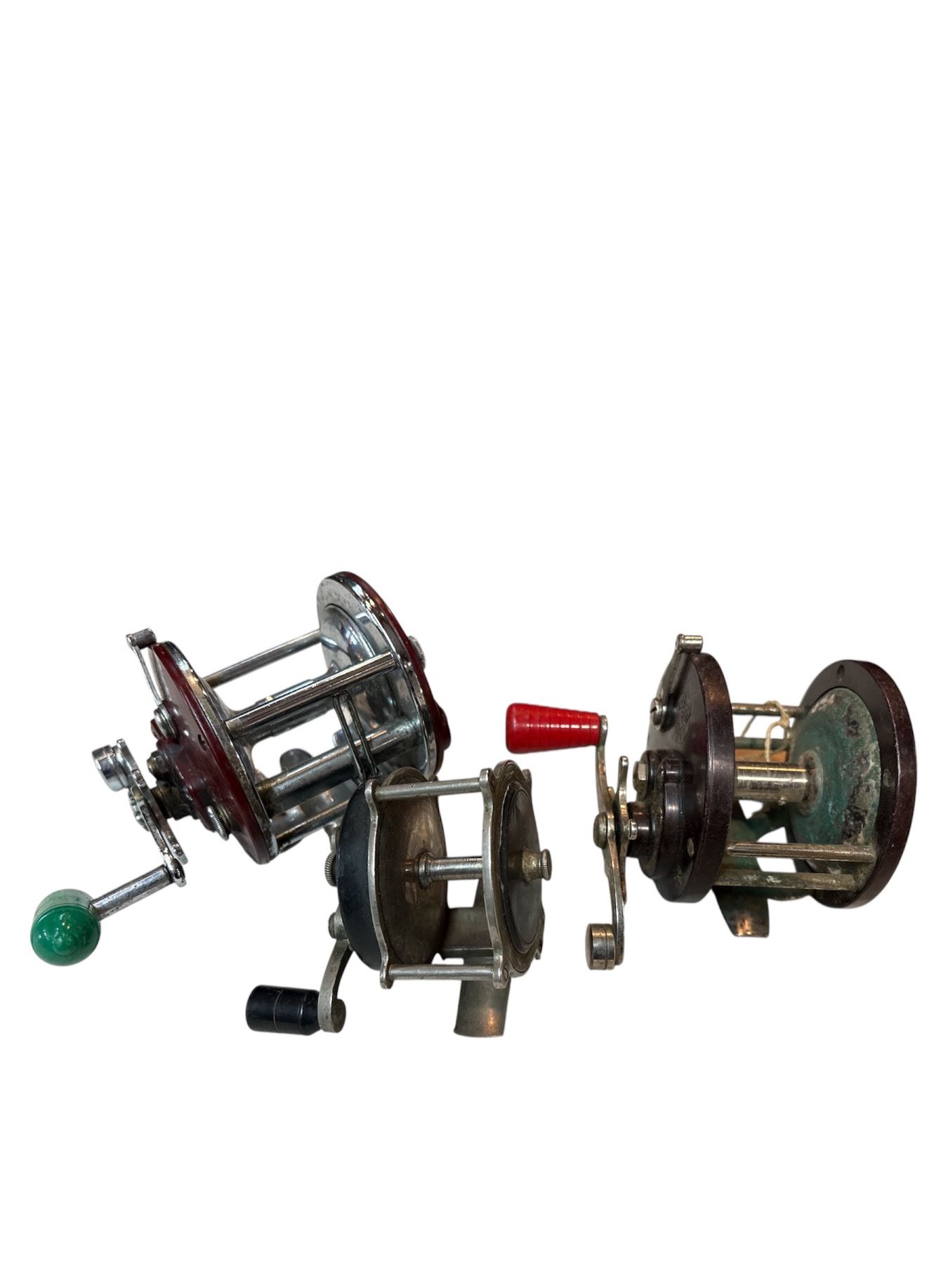 Set of three vintage fishing reels including a Penn Peer No 209, Penn Model 85, and a small unbranded reel. The Penn Peer No 209 and Model 85 feature classic construction known from Penn's mid-20th-century lineup. The small unbranded reel complements the lot. Item is as pictured.