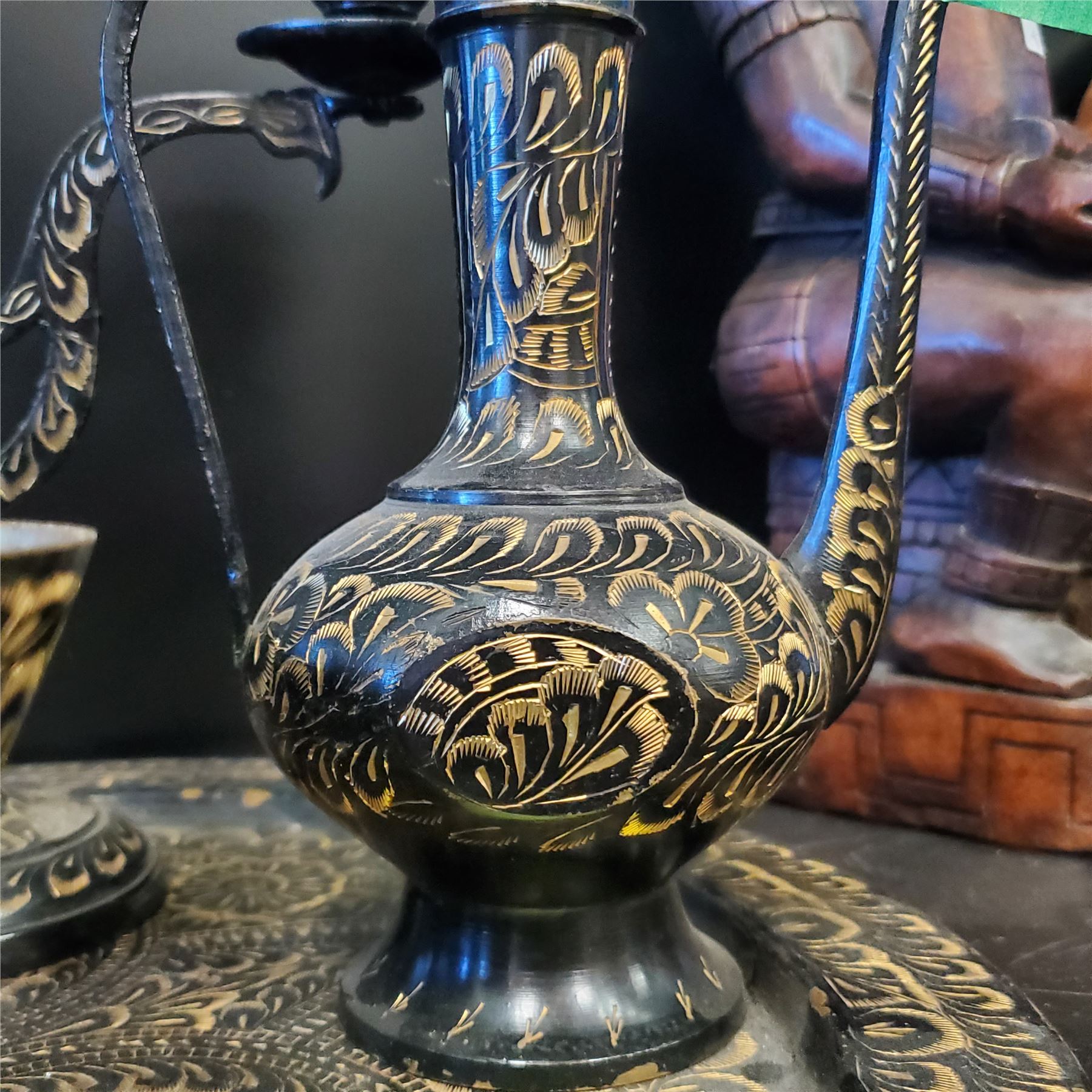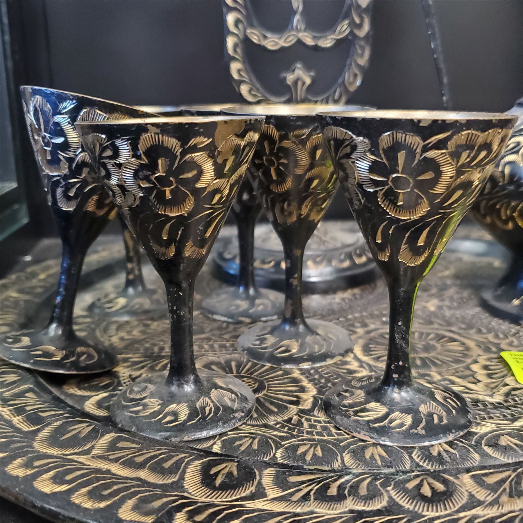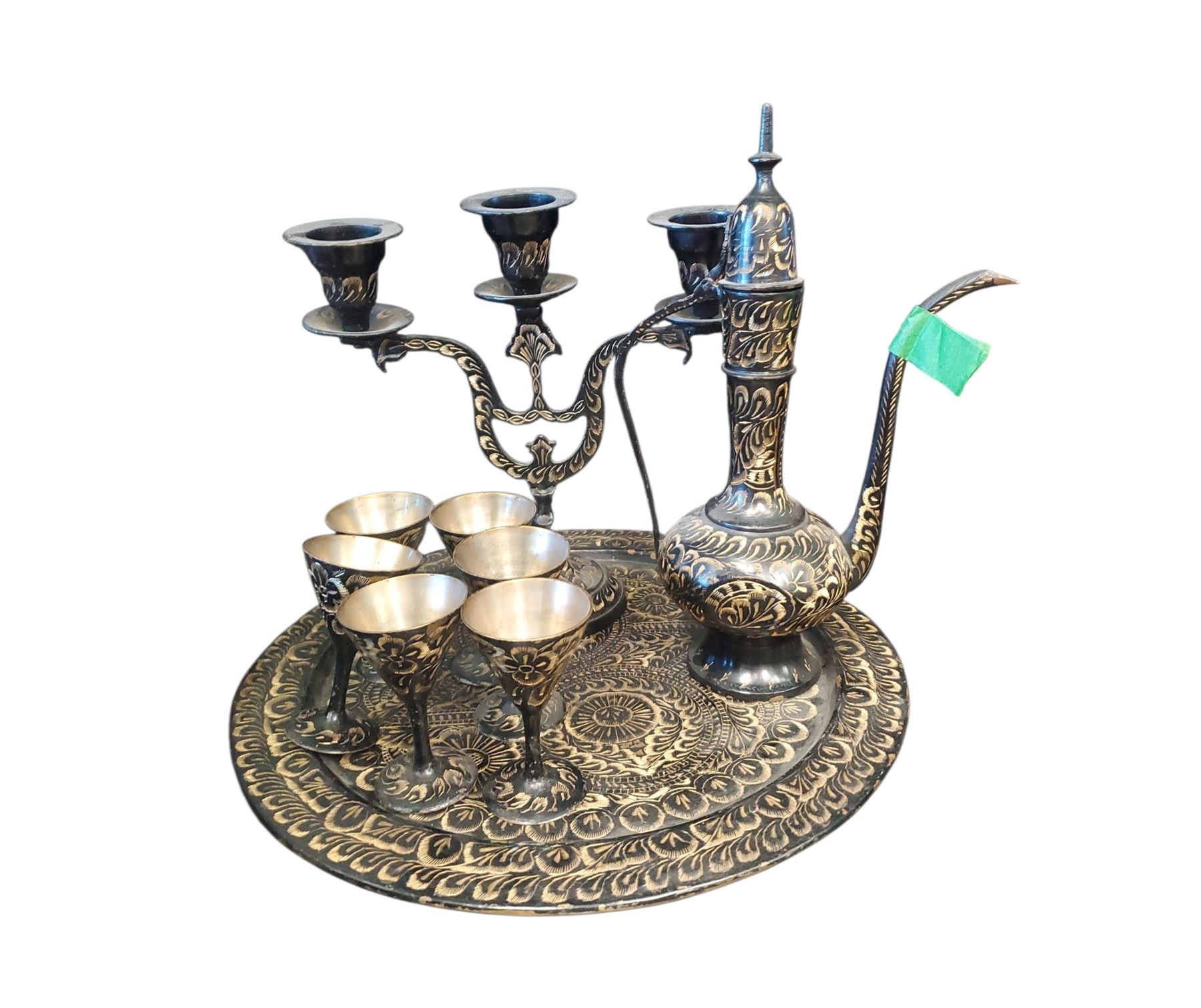 Brass Turkish tea set featuring a traditional Middle Eastern design. Includes teapot, cups, and possibly serving tray. Made of brass with decorative detailing typical of Turkish craftsmanship. Item is as pictured.