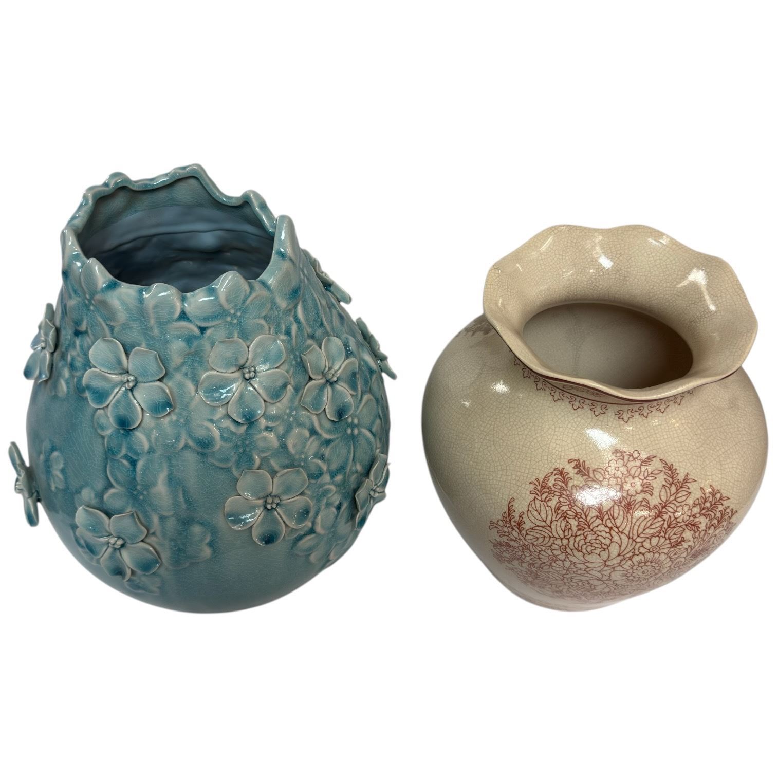 Turquoise Vase with Applied 3-D Flowers and 1980s Transferware Vase (Turquoise Vase is 12" Tall x 9" diameter)