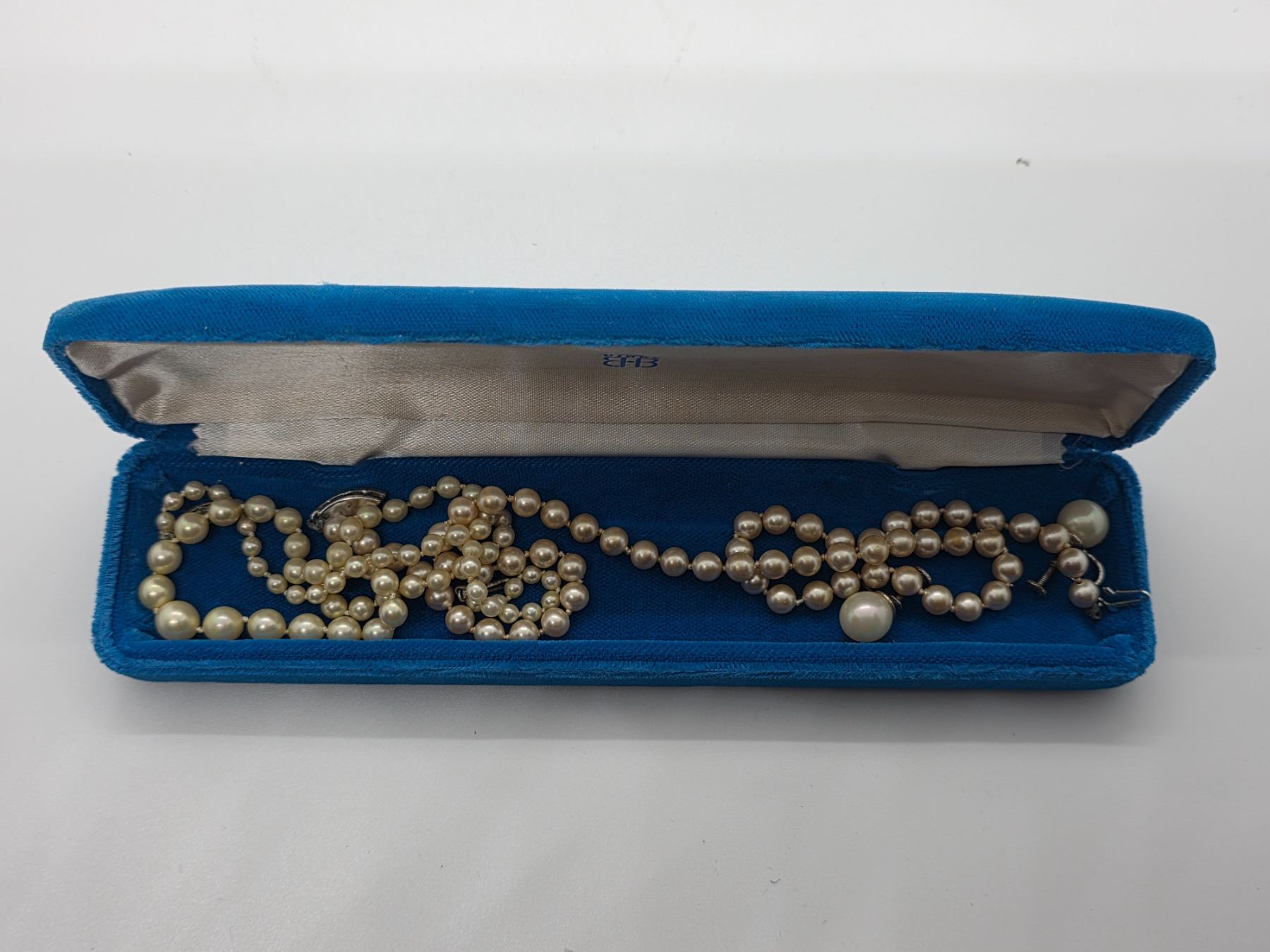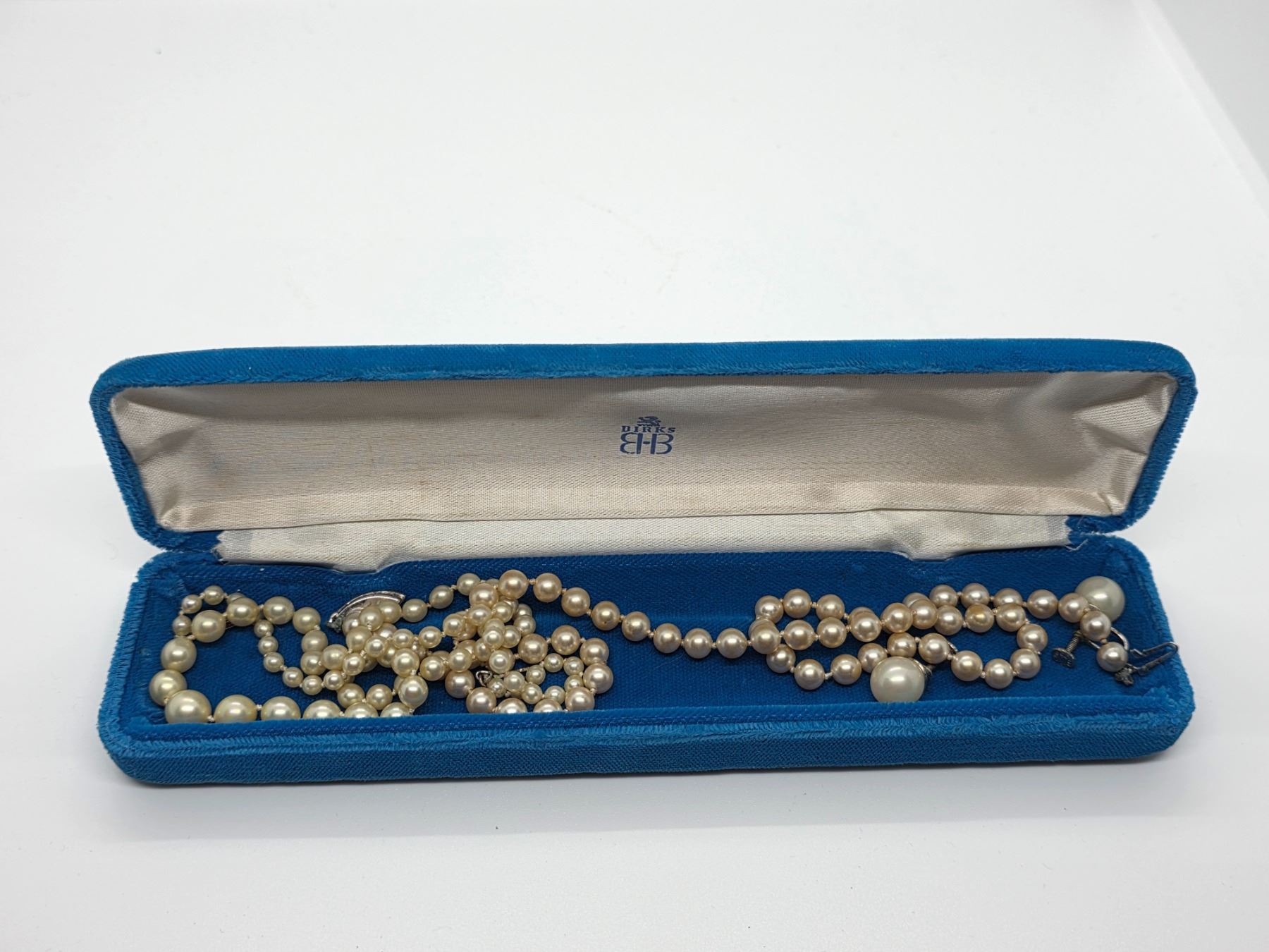 Two 16" Cultured Peal Necklaces & 1 Pair of Crew Back 10mm Pearl Earrings in a Velvet Birks Box
