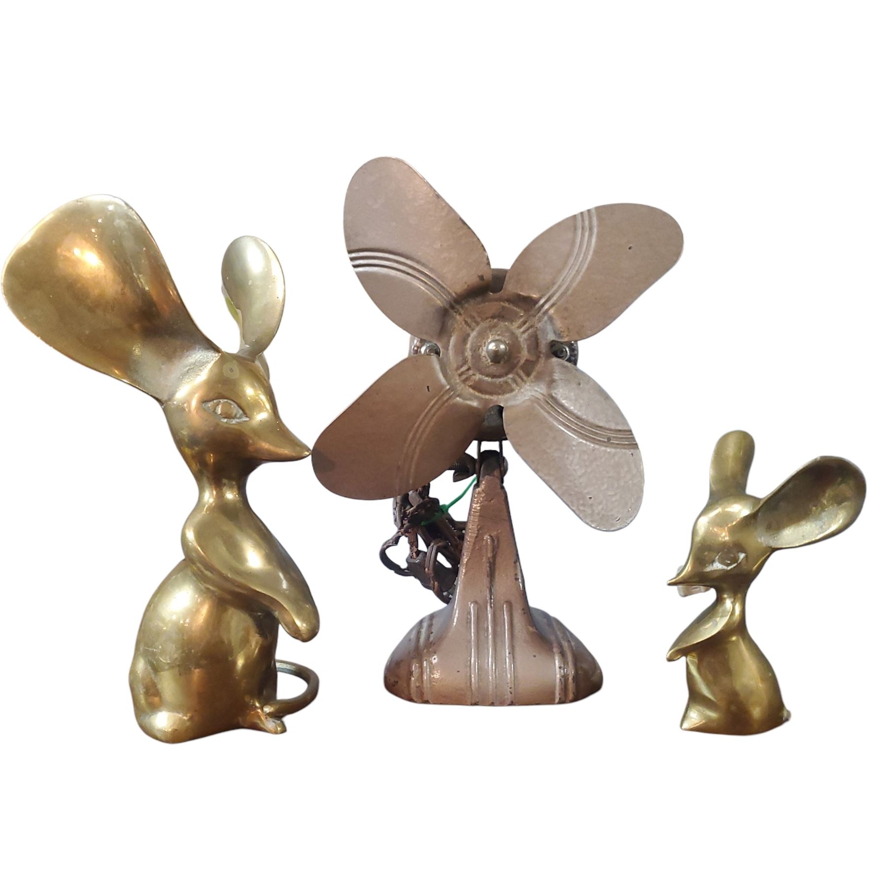 Lot includes two brass mouse figurines and a vintage Made-Rite cast iron desk fan. Made-Rite fan features a metal body with a classic design, indicative of mid-century craftsmanship. Both mice are made of brass and are depicted in a standing position. Item is as pictured.