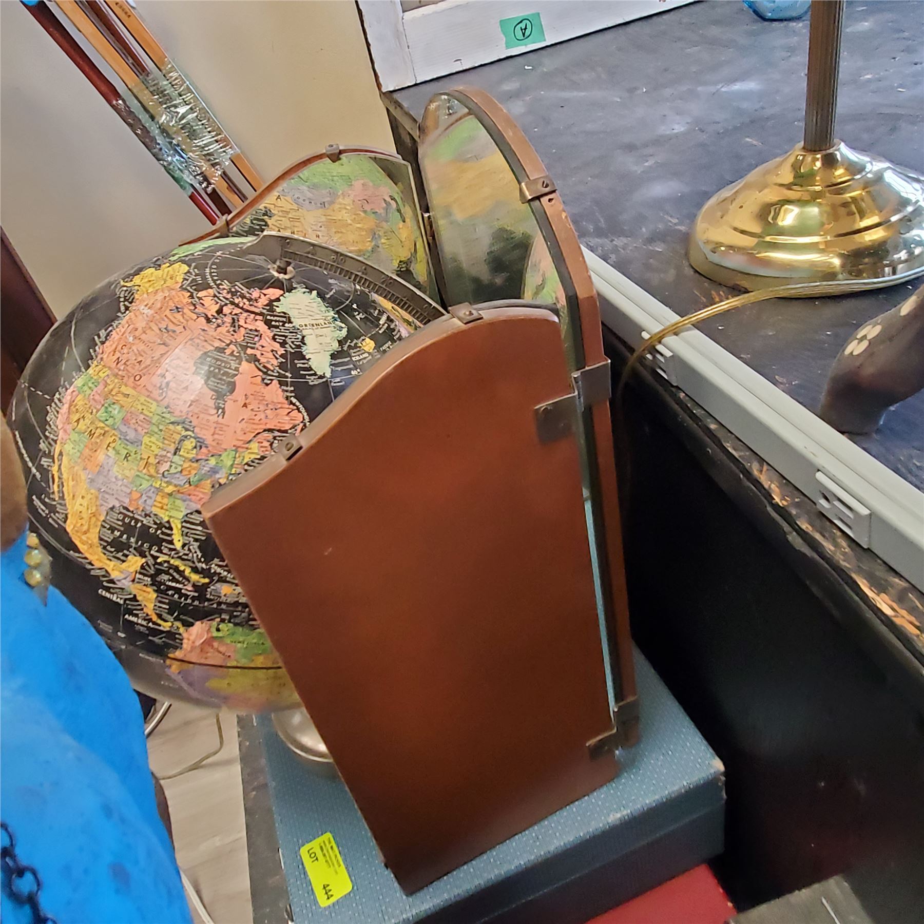 Lot includes two Brexton picnic sets, a Replogle 12-Inch globe, a Hollywood Regency style lamp, and a triptych mirror. Brexton sets are ideal for outdoor use, globe features detailed cartography, lamp reflects classic Regency design, and mirror offers a versatile folding design. Items are as pictured.
