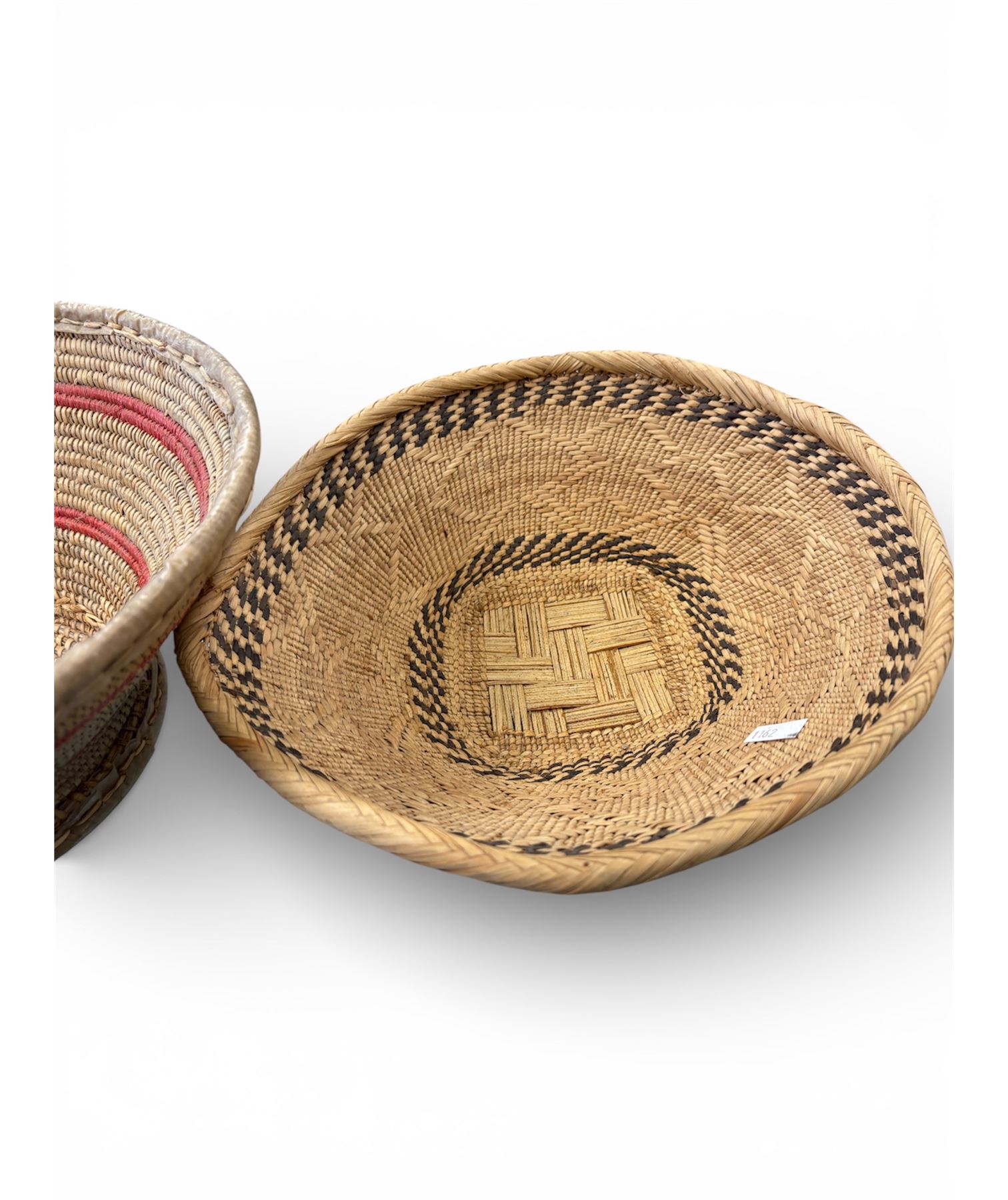 Set of two handwoven sweet grass baskets made from natural fibers. Largest basket measures 11.5 inches in diameter. Traditional design, likely used for decorative or functional purposes. Both feature intricate weaving patterns characteristic of sweet grass craftsmanship.