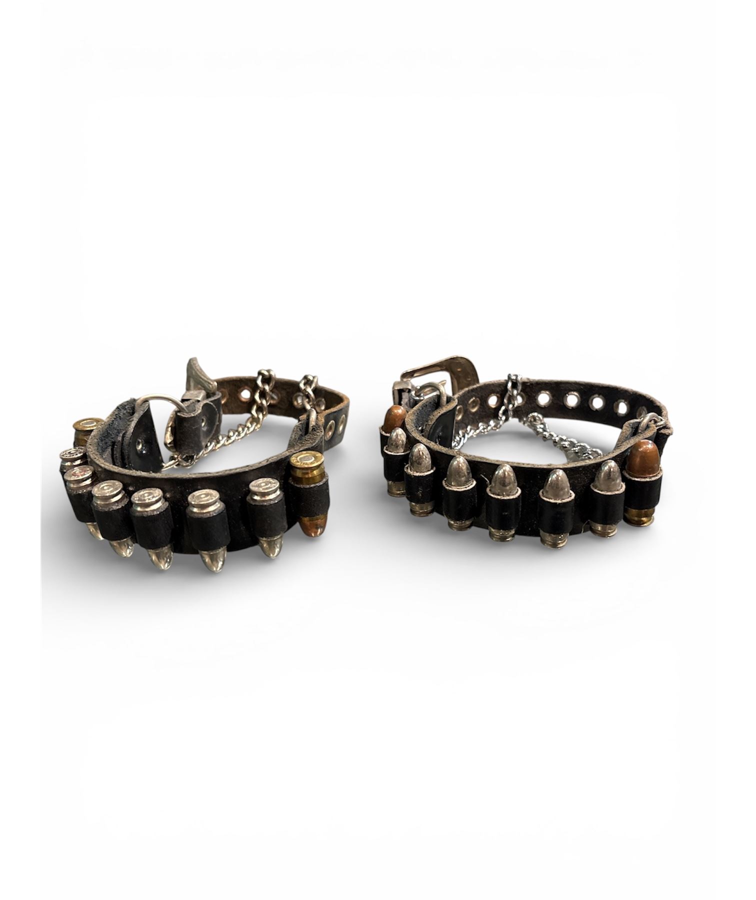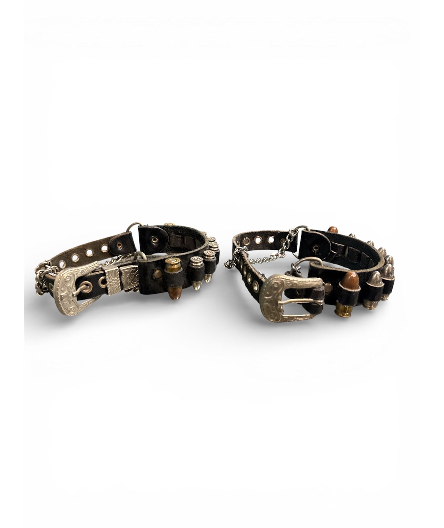 Lot includes two leather bandolier-style dog collars featuring decorative deactivated bullets. Collars designed for visual appeal with bandolier-style design. No active ammunition included. Item is as pictured.