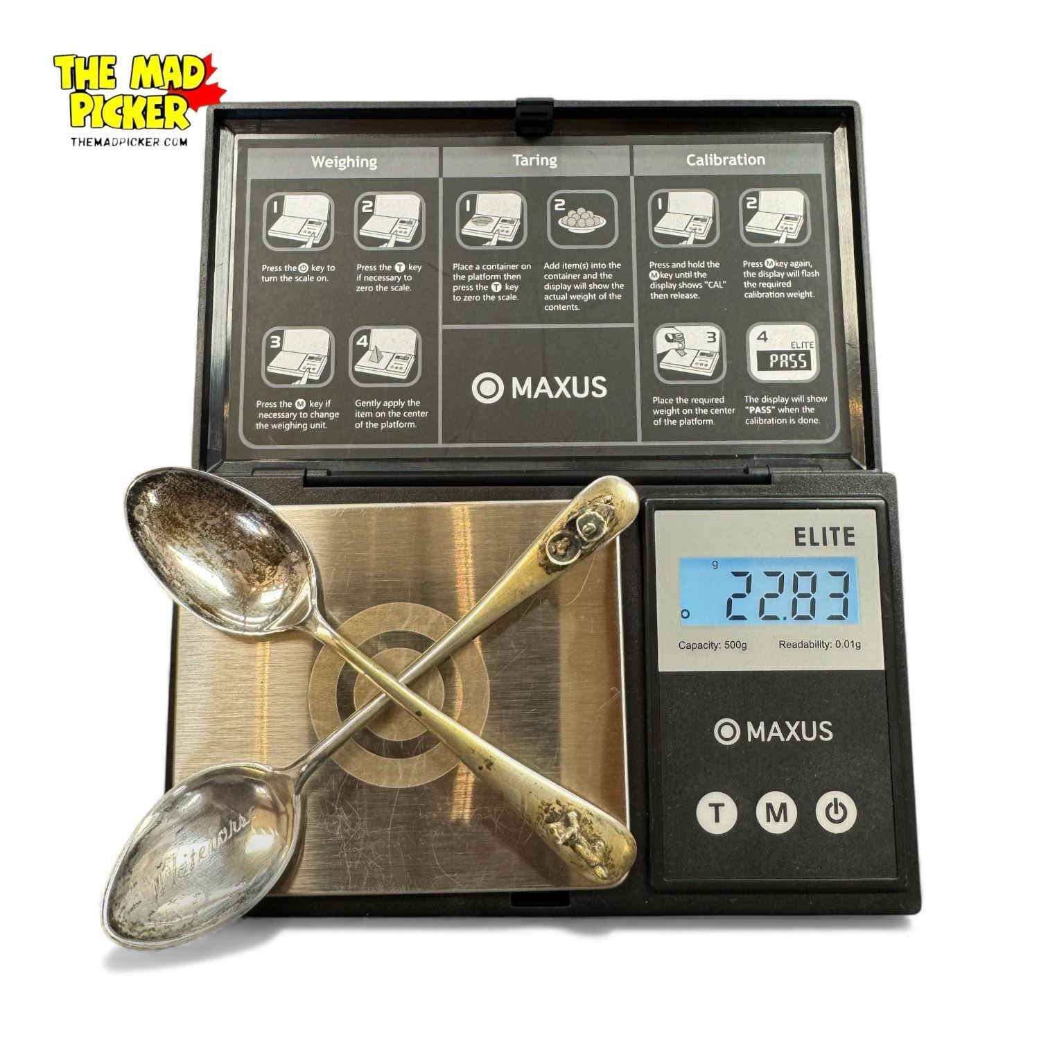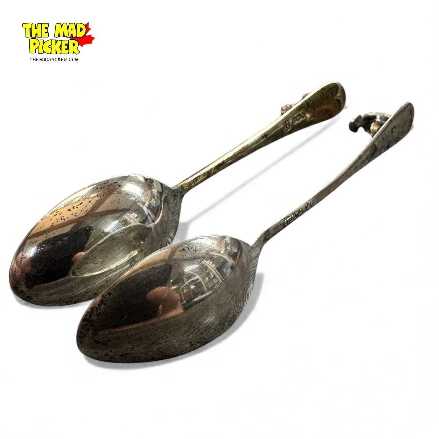 Two Silver Spoons: Gold Panner w Real Gold Nugget & Dog 22.83 Grams