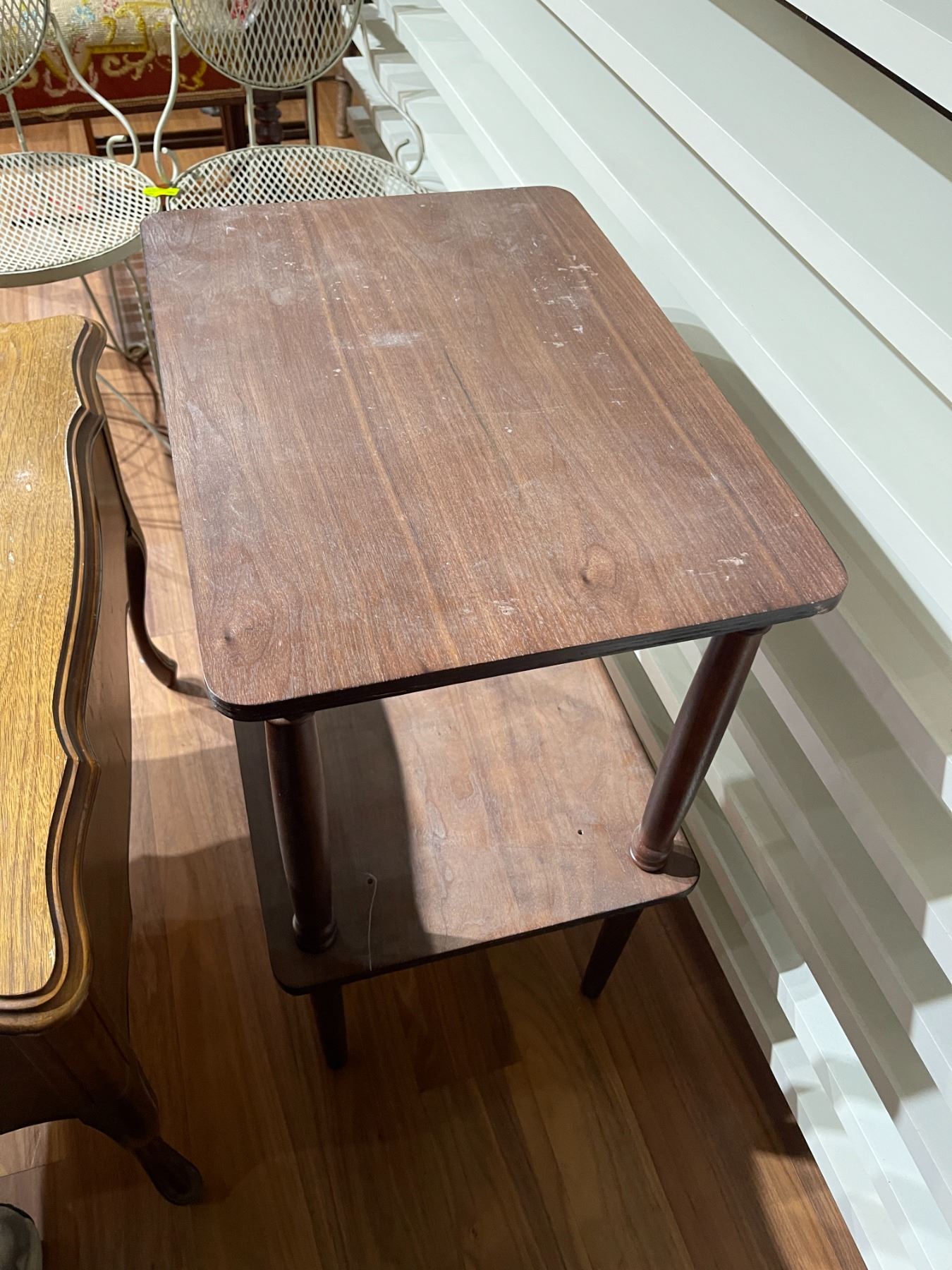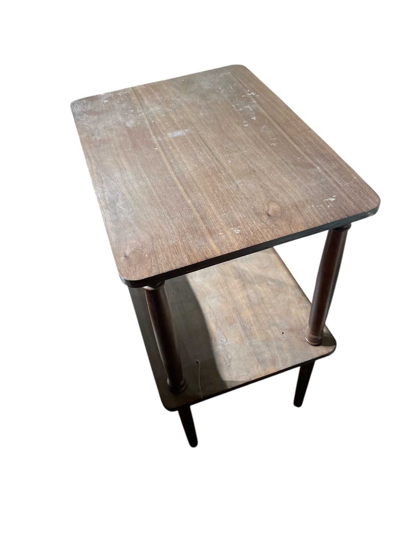 Two-tiered table with wood veneer finish. Dimensions are 21-Inch length, 15-Inch width, and 27.5-Inch height. Features a two-level design suitable for display or storage. Constructed with veneering technique for decorative surface. Item is as pictured.