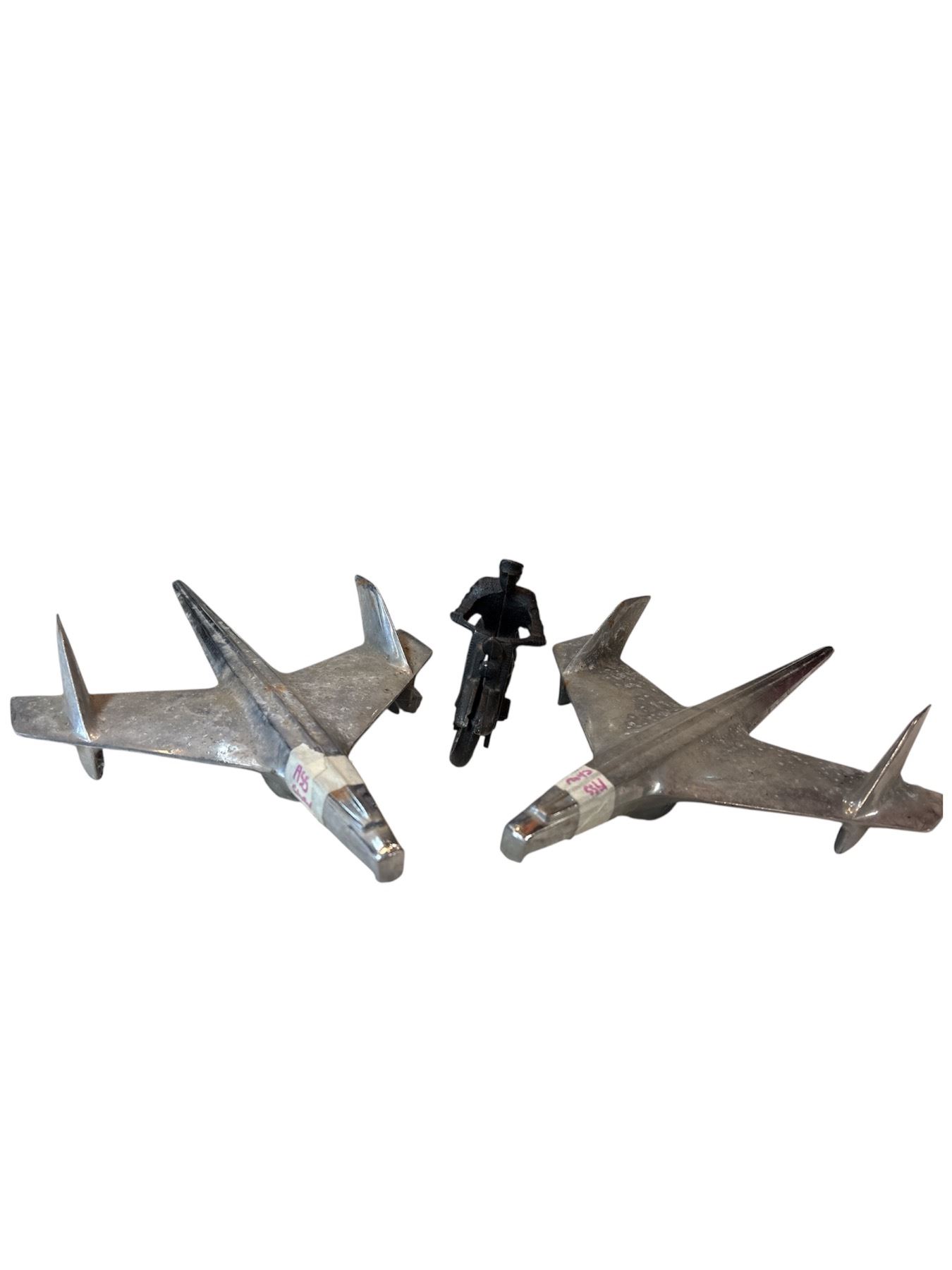 Lot includes two vintage 1955 Chevrolet Bel Air hood ornaments marked 3709686 and a small cast iron motorcycle and rider. Hood ornaments are chrome with design specific to the 1955 Bel Air model. Cast iron motorcycle features detailed rider figure. Item is as pictured.
