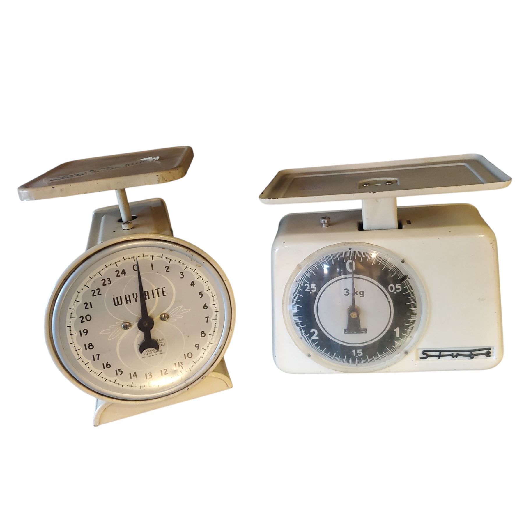 This lot includes two vintage mechanical weigh scales: one Stube and one Way Rite scale. The Stube scale features a compact design, while the Way Rite scale has a classic kitchen style. Both are vintage models with age-related wear. Item is as pictured.