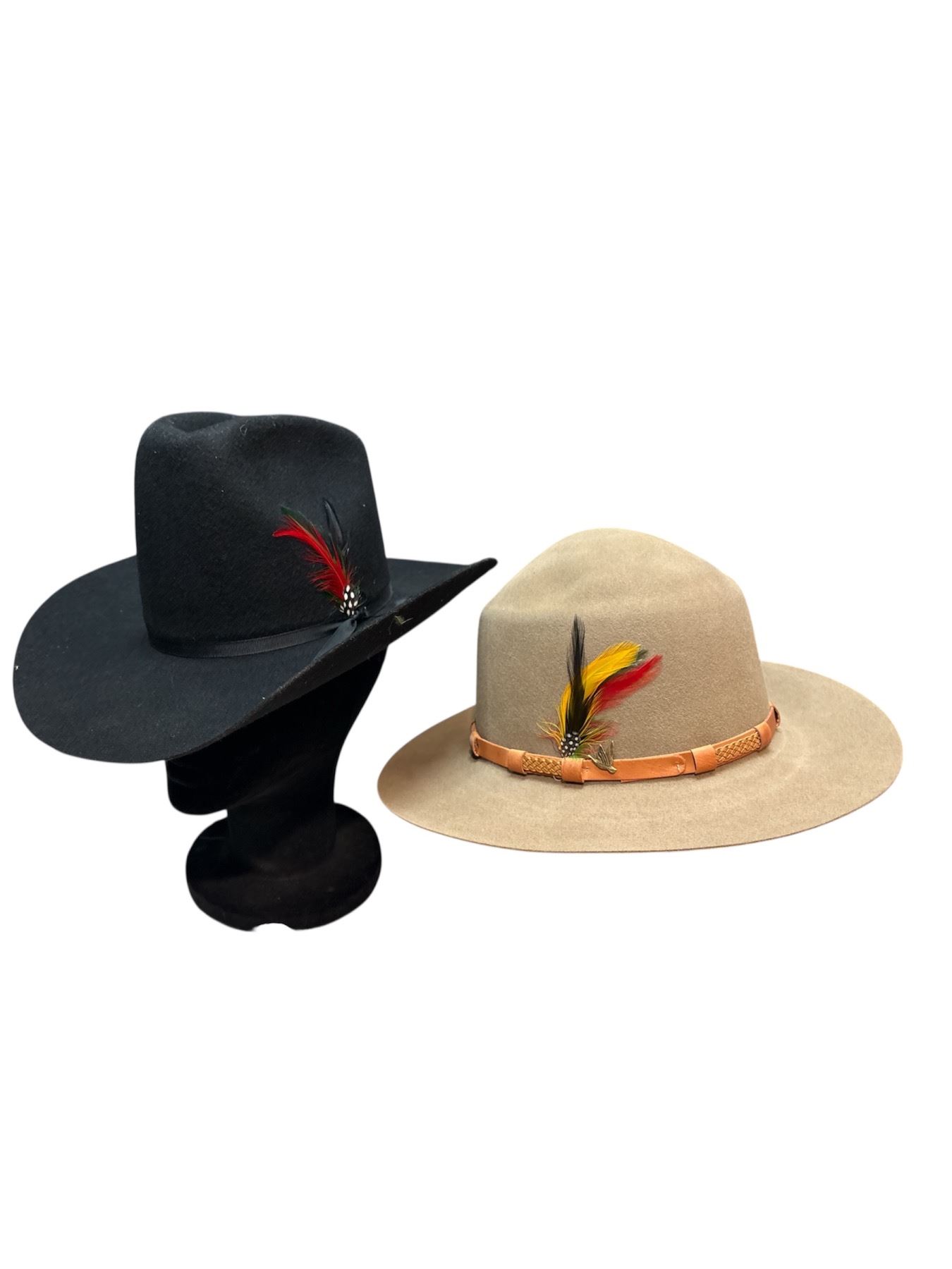 This lot includes two western style cowboy hats: one in black size 6 1/2, and one Whitmore Wilderness Collection hat in buckskin color size 7 1/8. Both hats are as pictured and feature distinct styling indicative of western wear. Includes box.